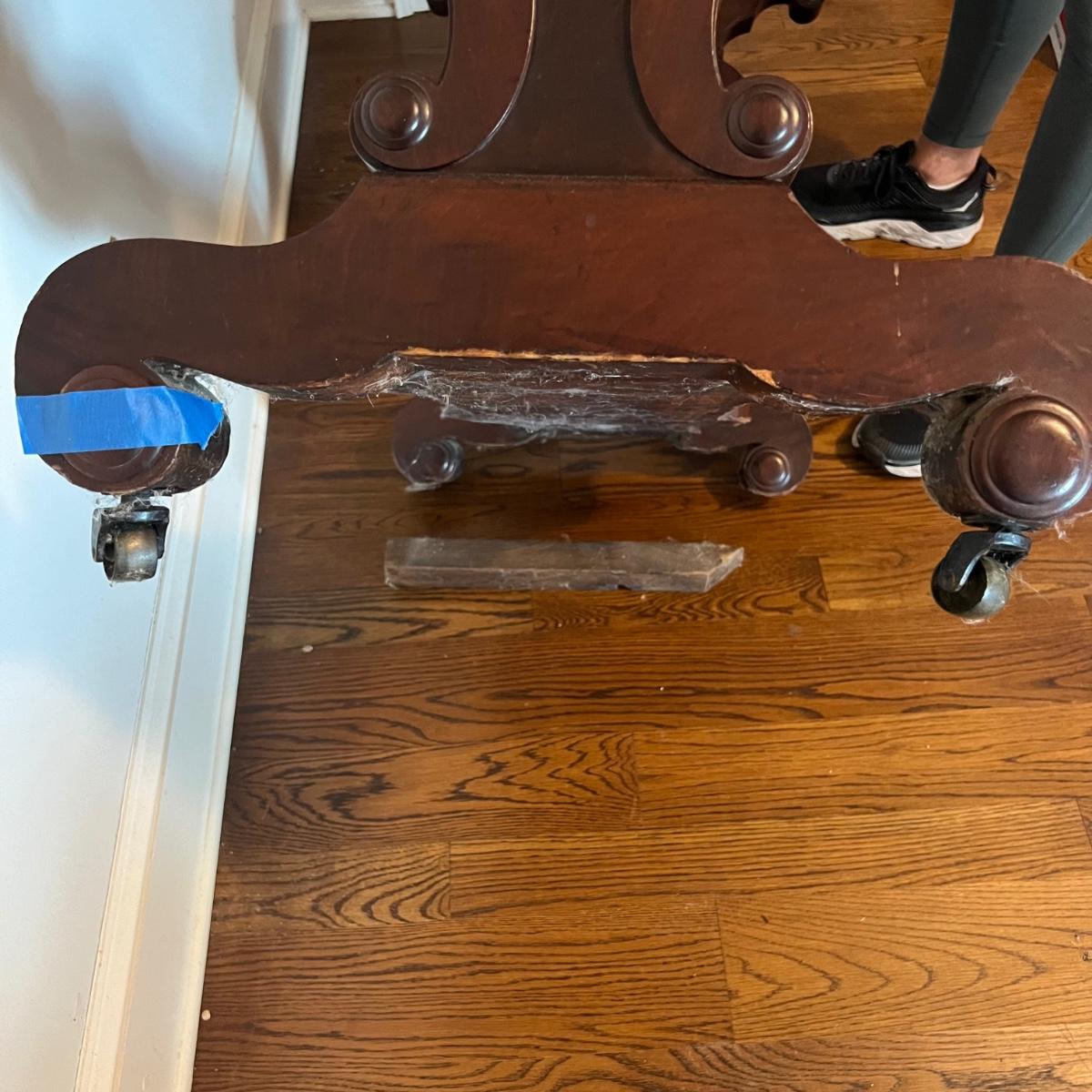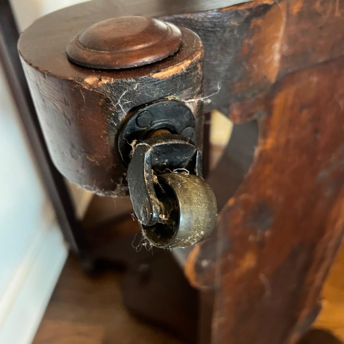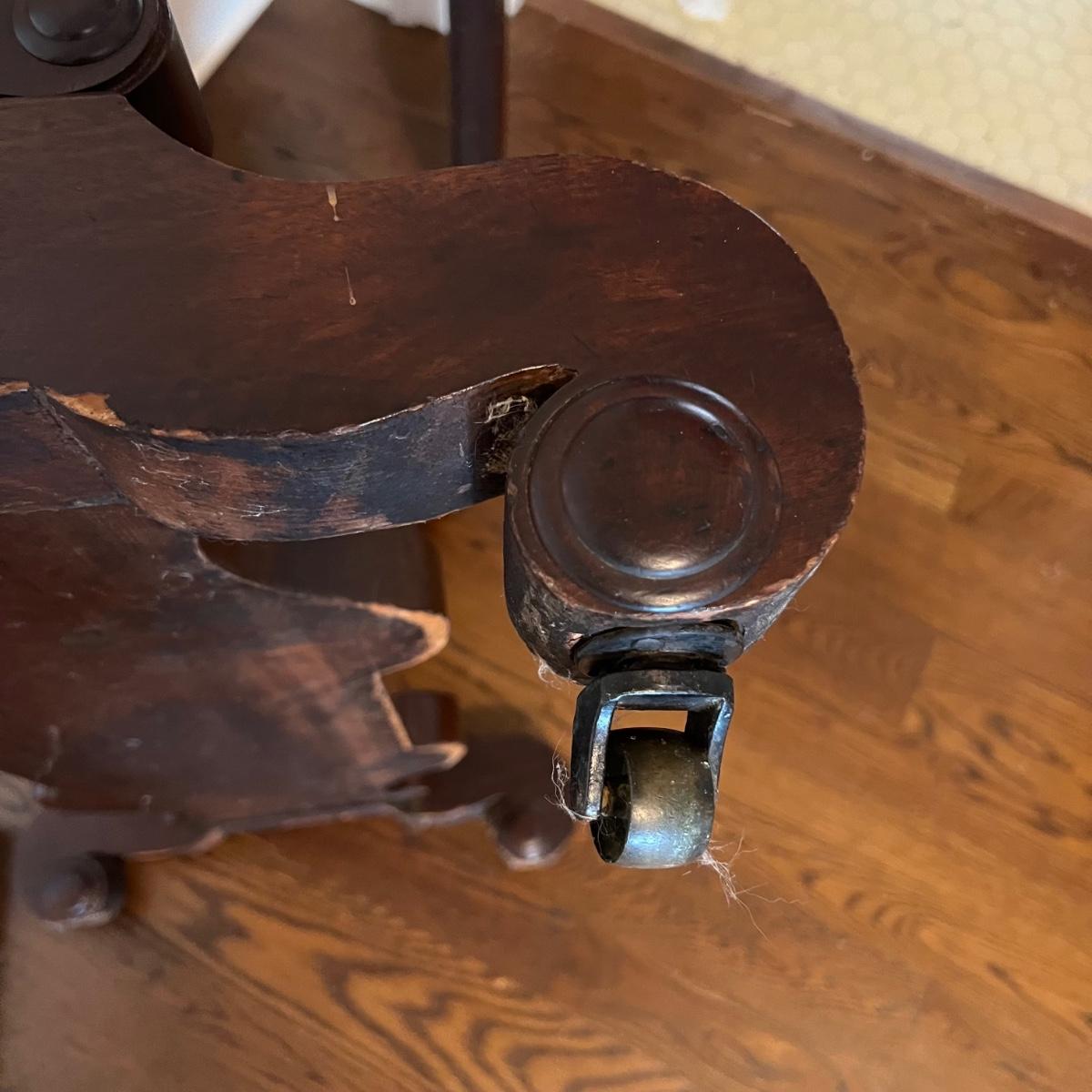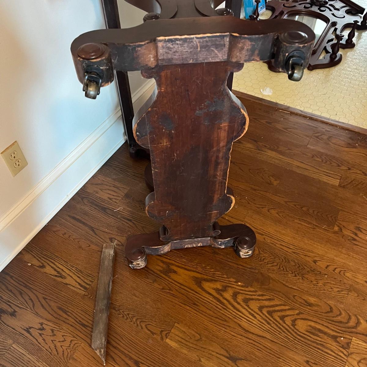 A beautiful wooden piece. that appears to be mahogany, with a white 0.75” thick marble top. The entire piece measures 36” x 20.5” x 30.5”H. note in photographs, where two of the wood casters at the bottom are missing. The piece is being held level currently with a scrap piece of wood. Also notice that one of the round accent pieces fell off, but is currently taped and could be easily glued.Local Pick Up only.