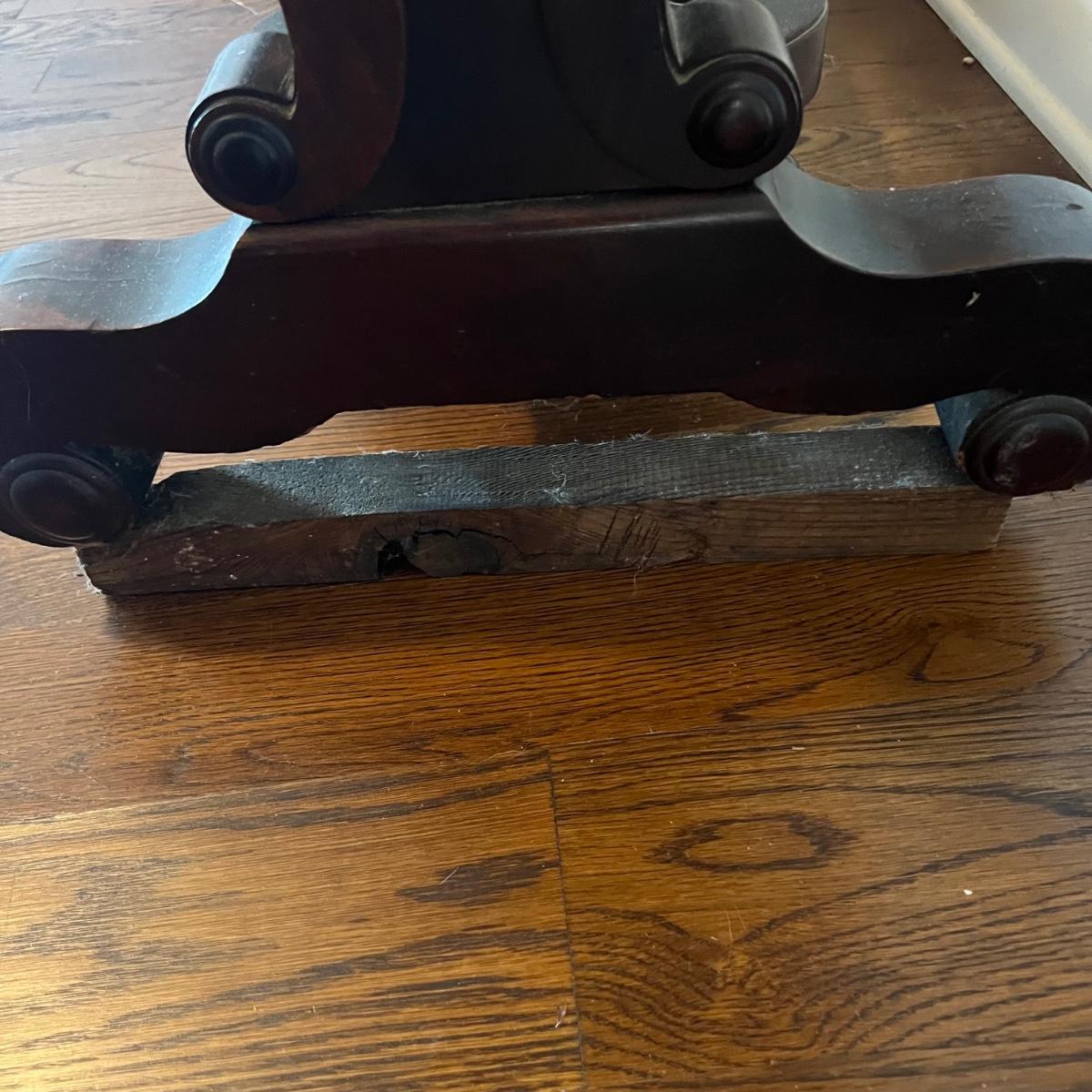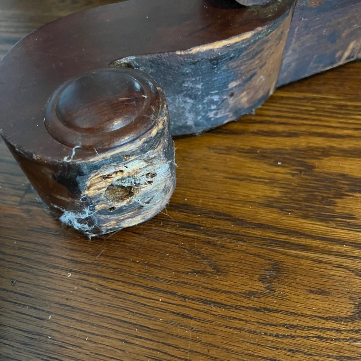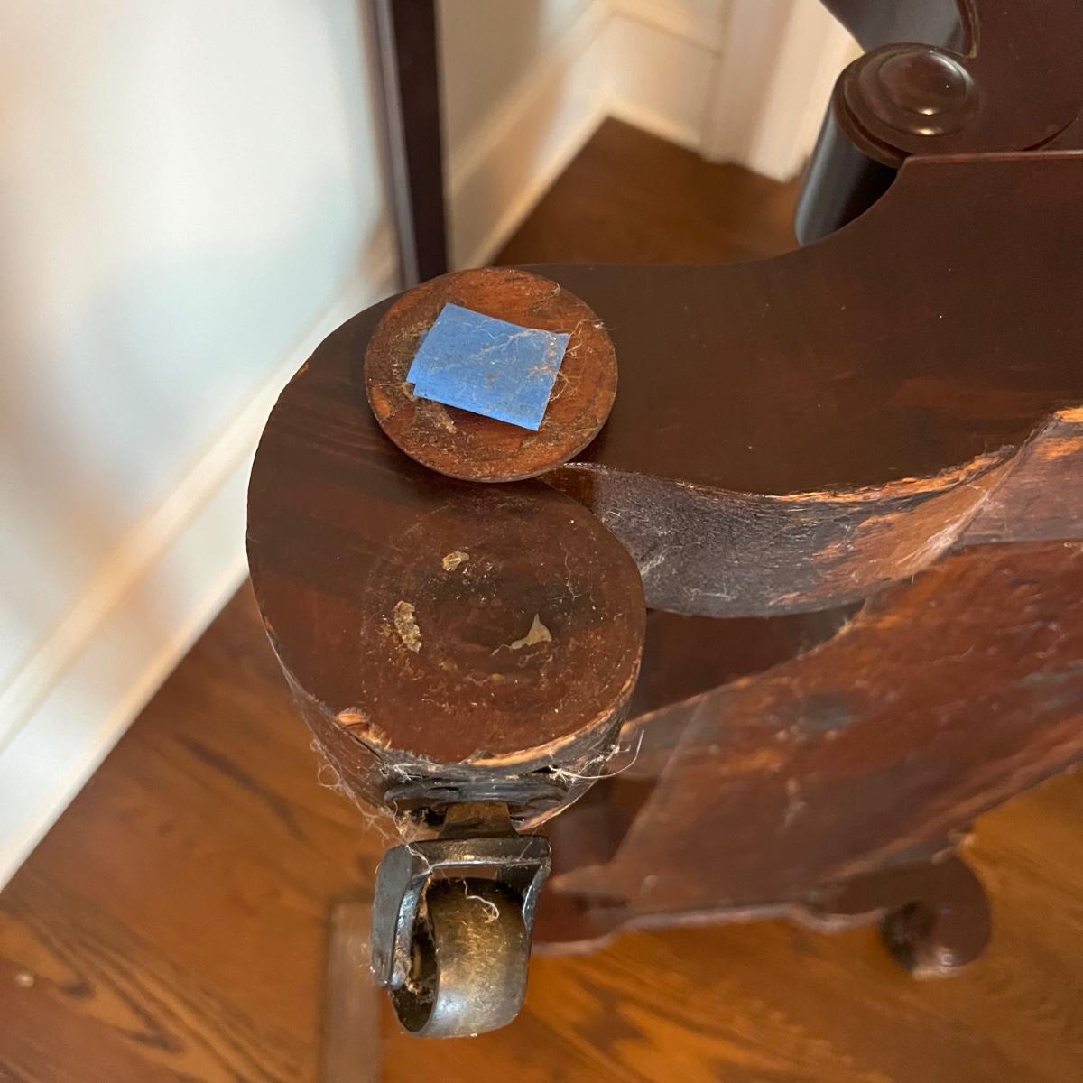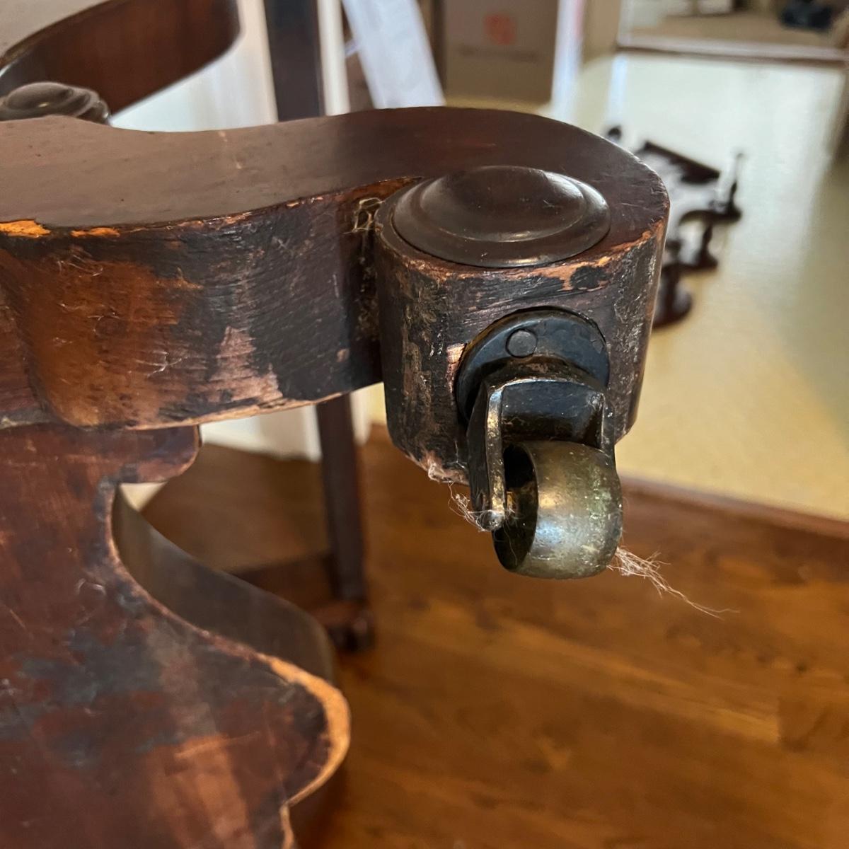 A beautiful wooden piece. that appears to be mahogany, with a white 0.75” thick marble top. The entire piece measures 36” x 20.5” x 30.5”H. note in photographs, where two of the wood casters at the bottom are missing. The piece is being held level currently with a scrap piece of wood. Also notice that one of the round accent pieces fell off, but is currently taped and could be easily glued.Local Pick Up only.