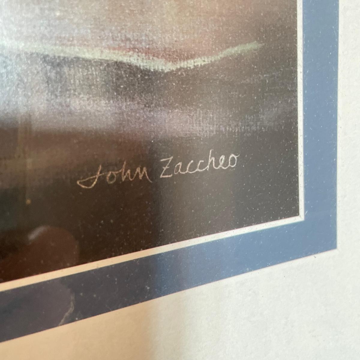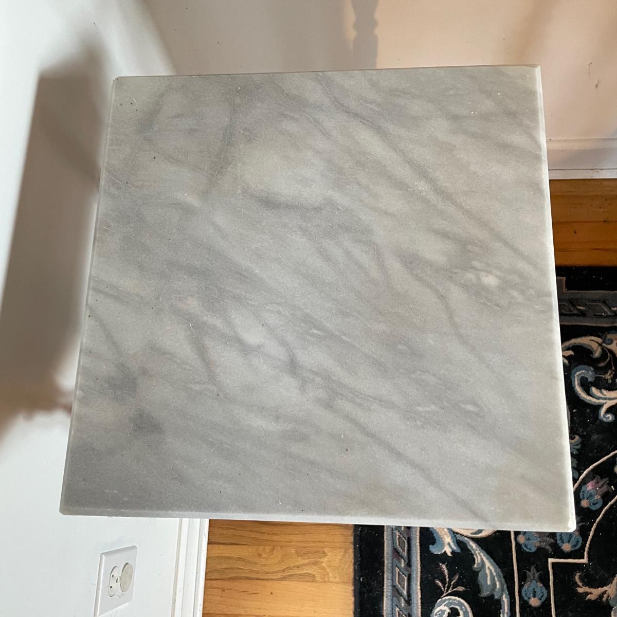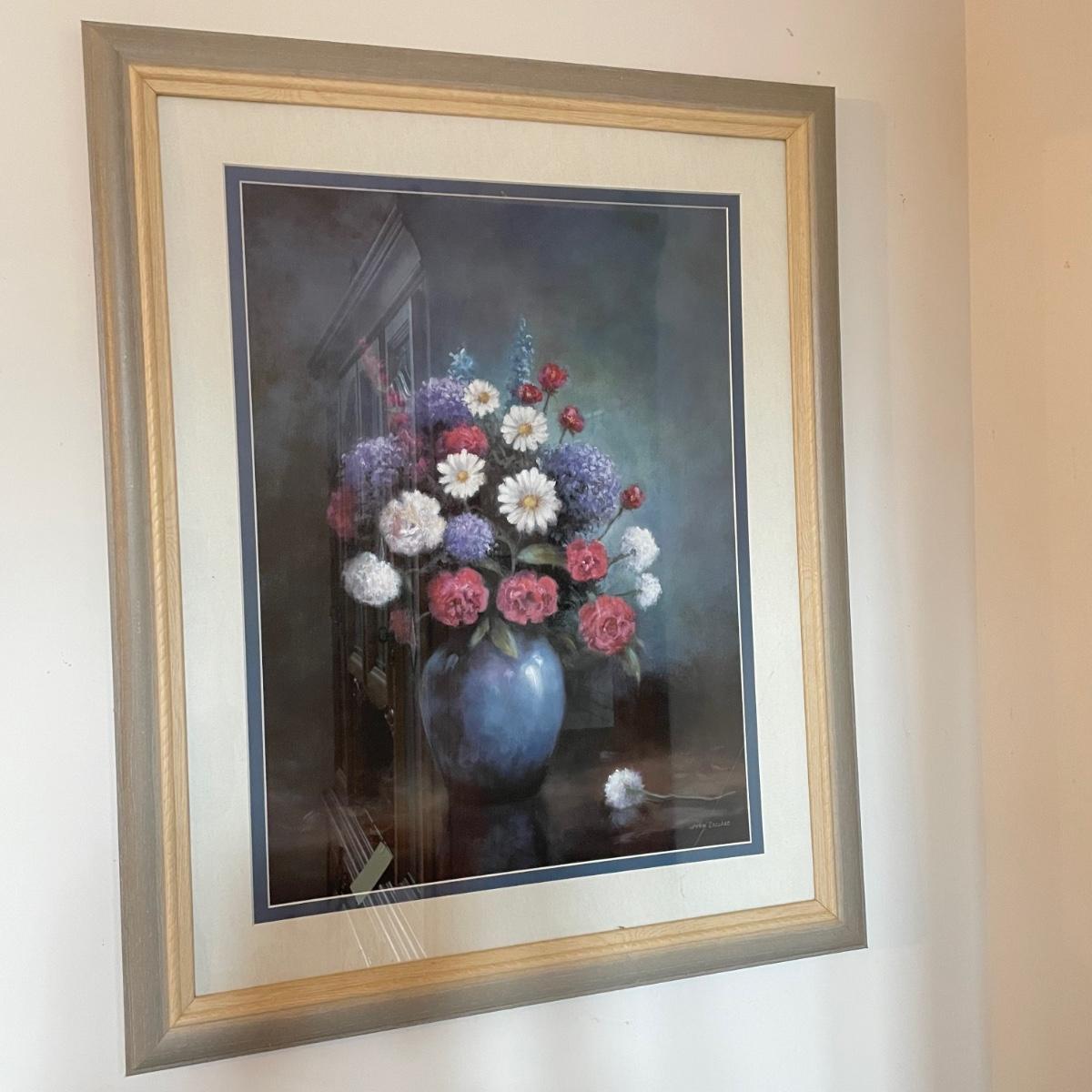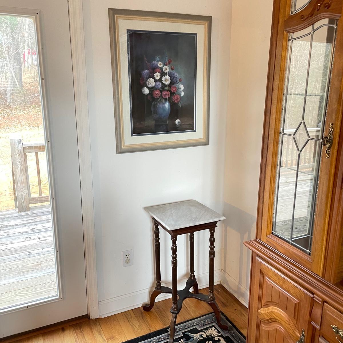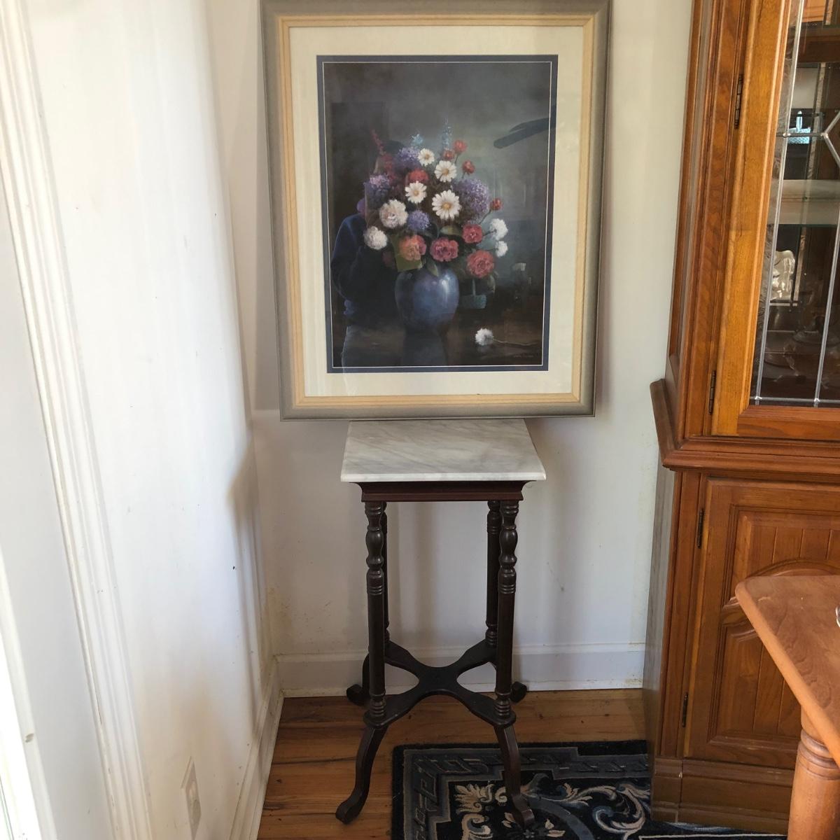 Beautifully framed art by John Zaccheo features a floral piece with a blue vase. Art sits behind glass in a wooden frame with light blue hues measuring 25.5” x 31.5”. Art is paired with a dark legged marble top side table/plant stand. The marble seems to be attached to the legs. It is in very nice condition with a small chip in one corner of the marble. Table measures 14.25”sq x 29”. See images. Local pick up only.