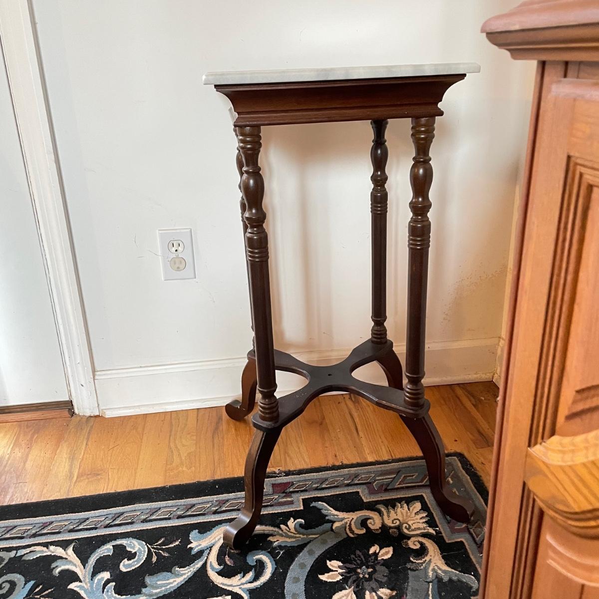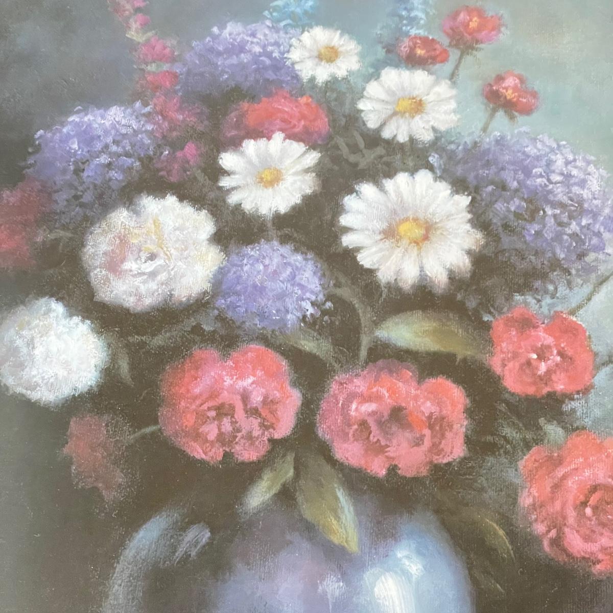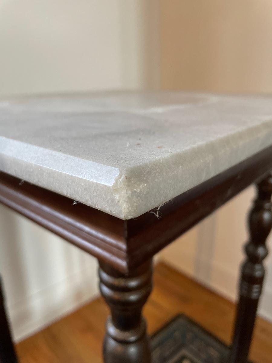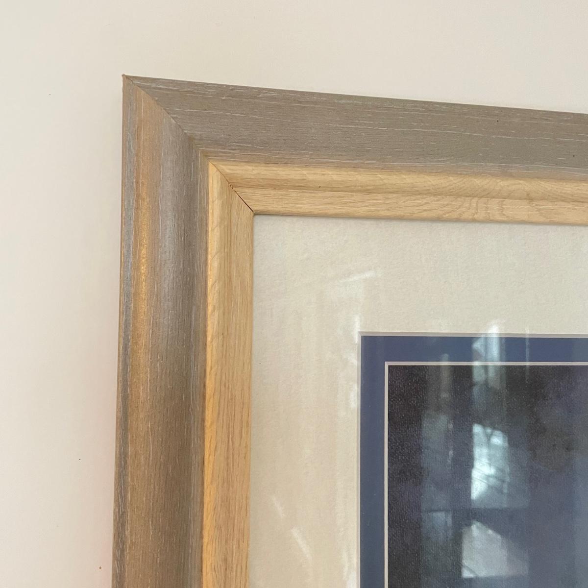 Beautifully framed art by John Zaccheo features a floral piece with a blue vase. Art sits behind glass in a wooden frame with light blue hues measuring 25.5” x 31.5”. Art is paired with a dark legged marble top side table/plant stand. The marble seems to be attached to the legs. It is in very nice condition with a small chip in one corner of the marble. Table measures 14.25”sq x 29”. See images. Local pick up only.