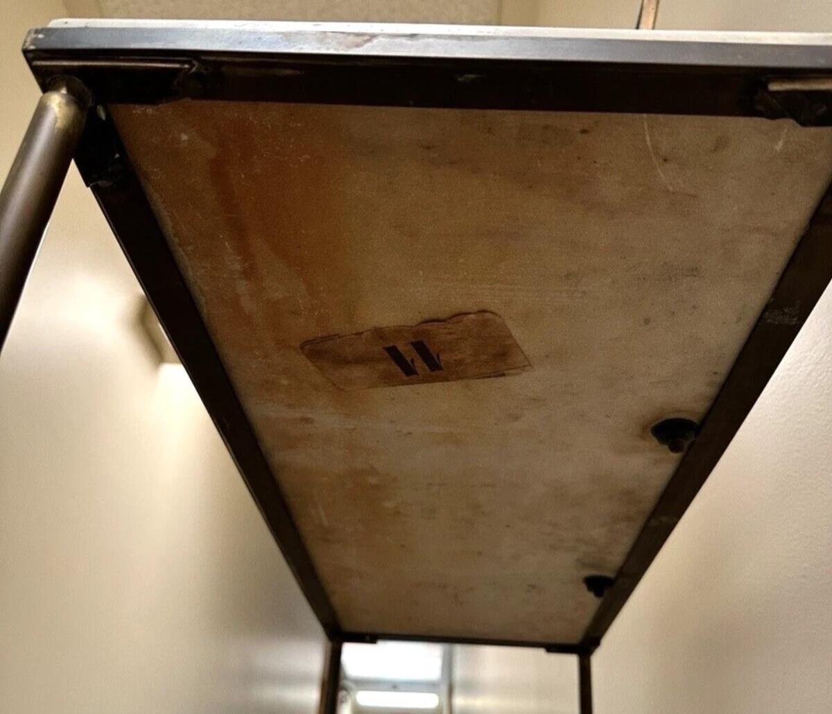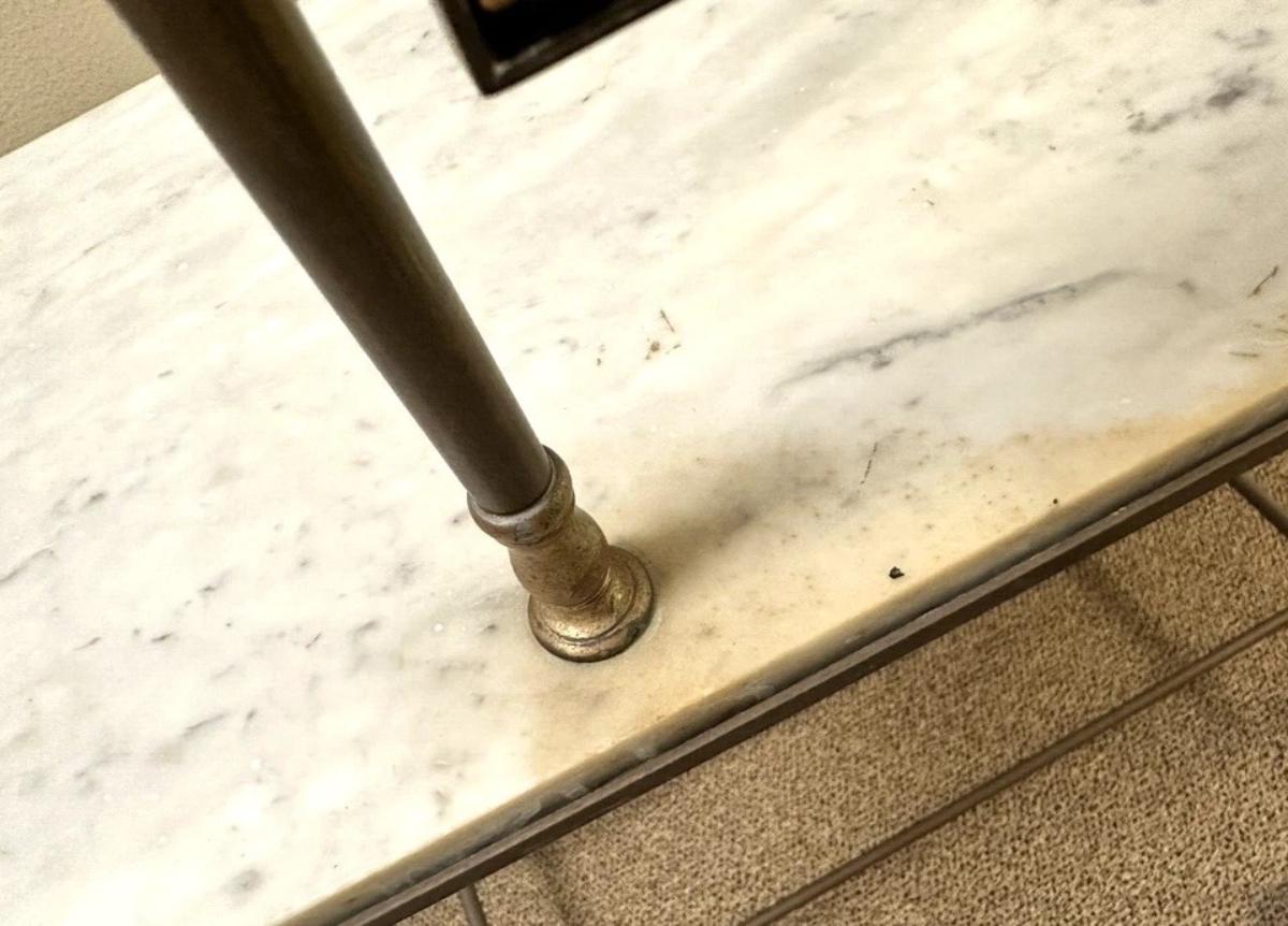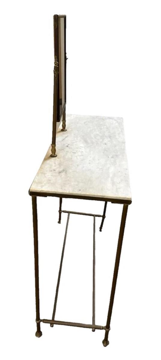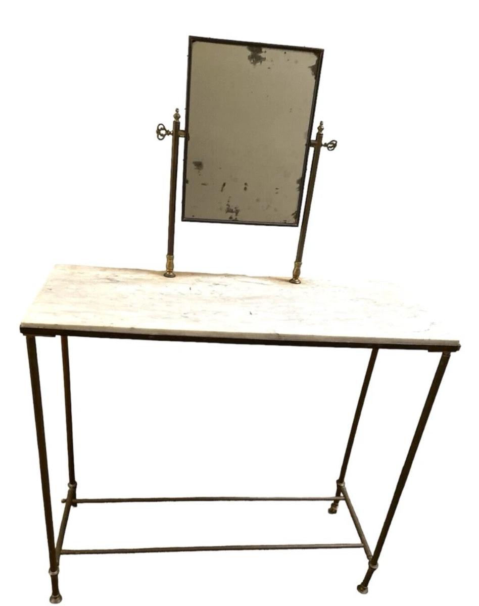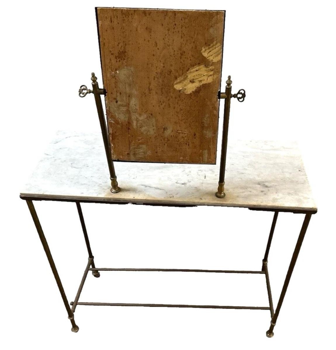 Item is in good, very stable condition with marble "staining" around the mirror base as well as marks all over the top consistent with use and age. Mirror has some "antiqued" spots of discoloration and the back has marks all over it. There are a couple of marks on the metal legs.