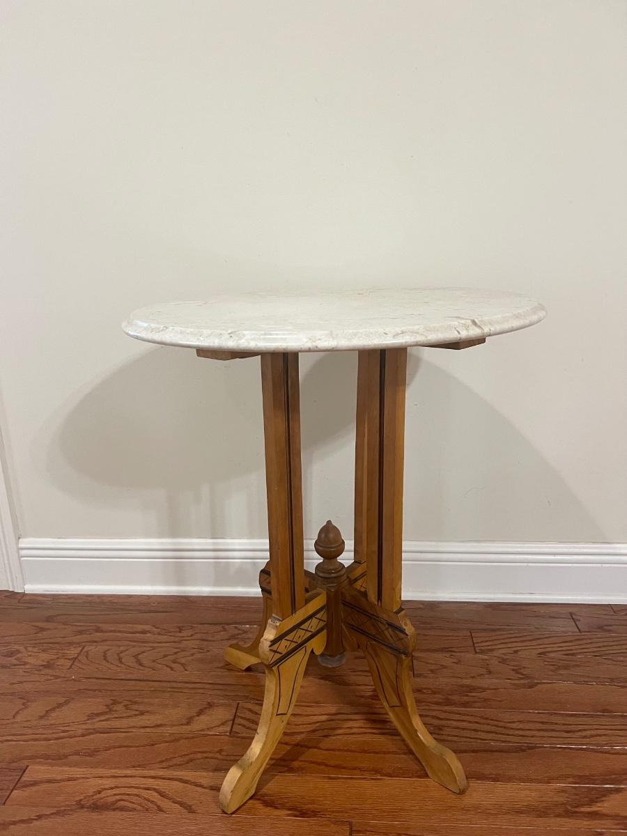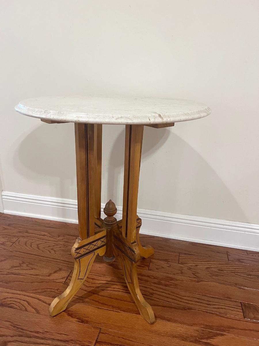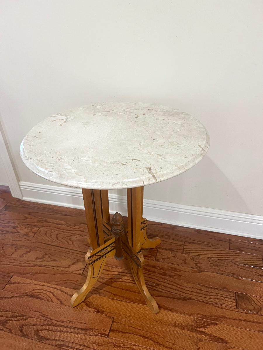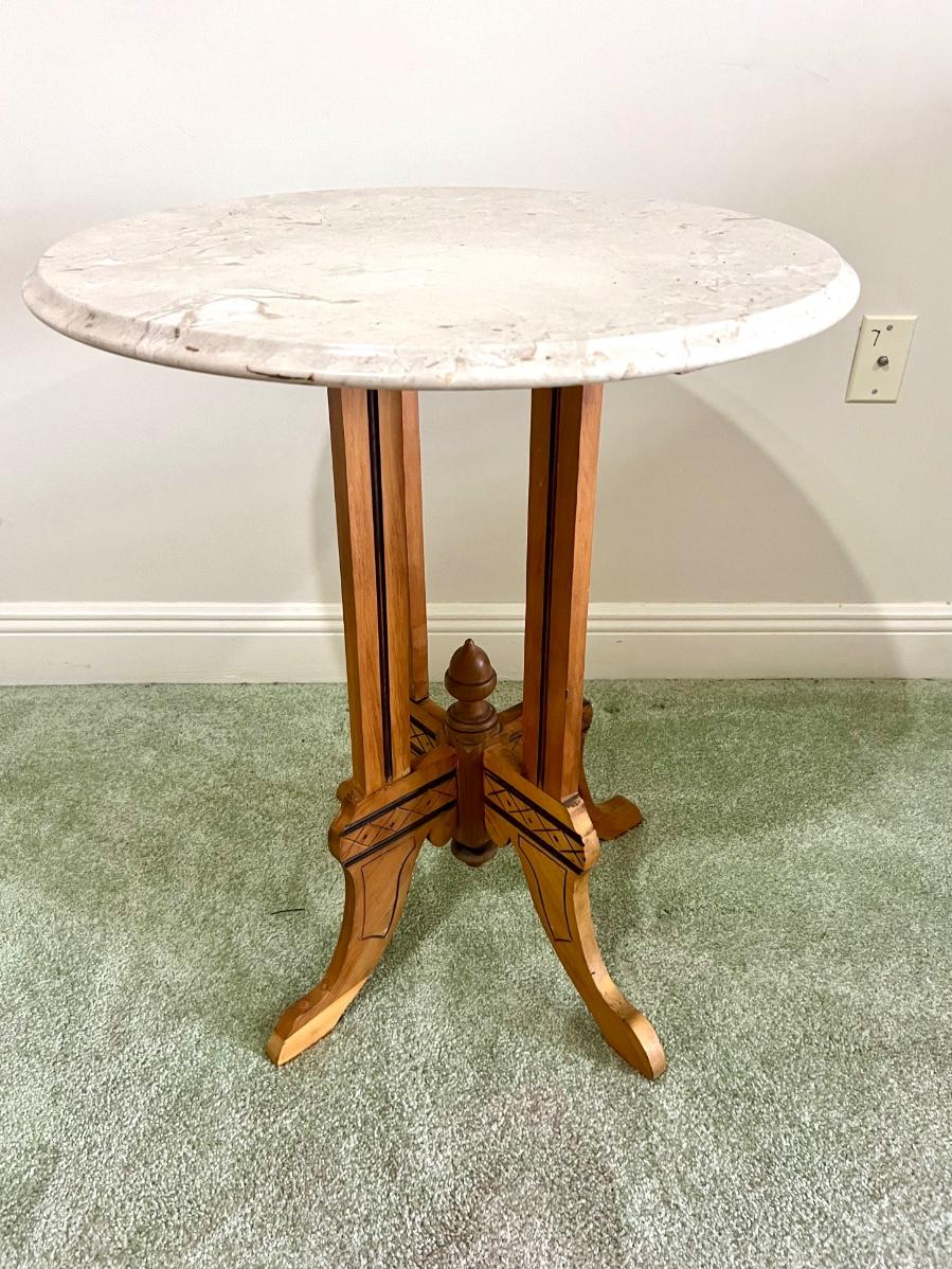 Marble Top Victorian Style Side Table Measures 28 inches tall and 24 inches round.