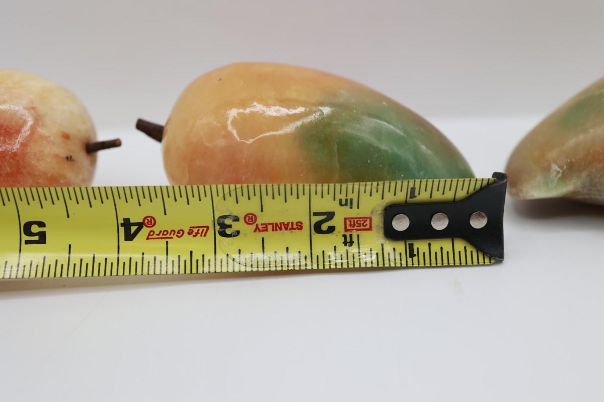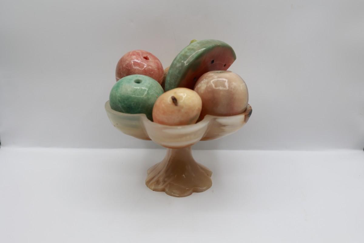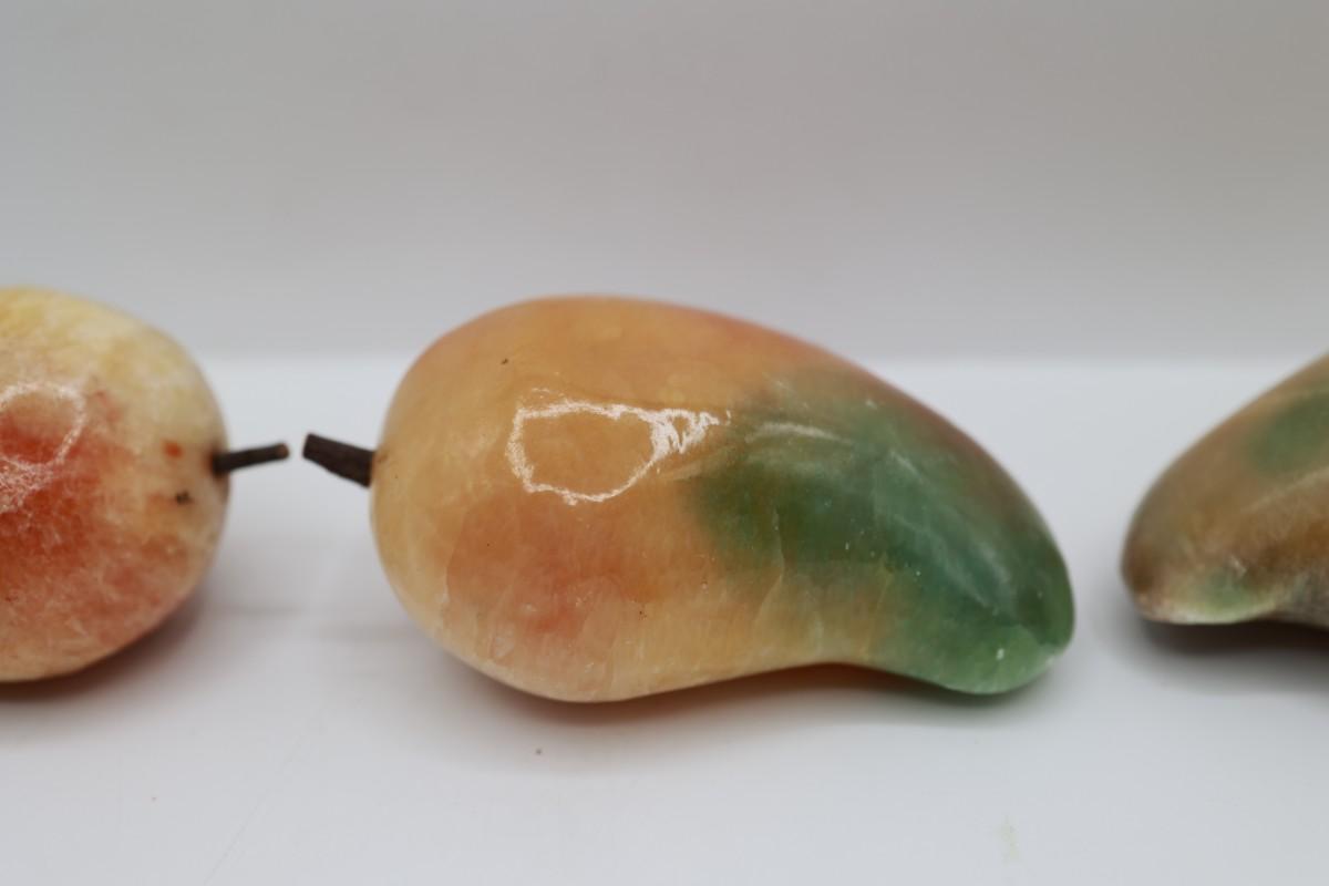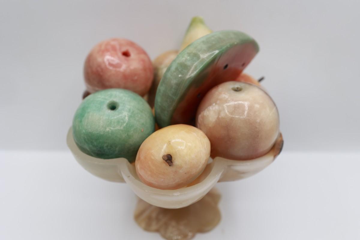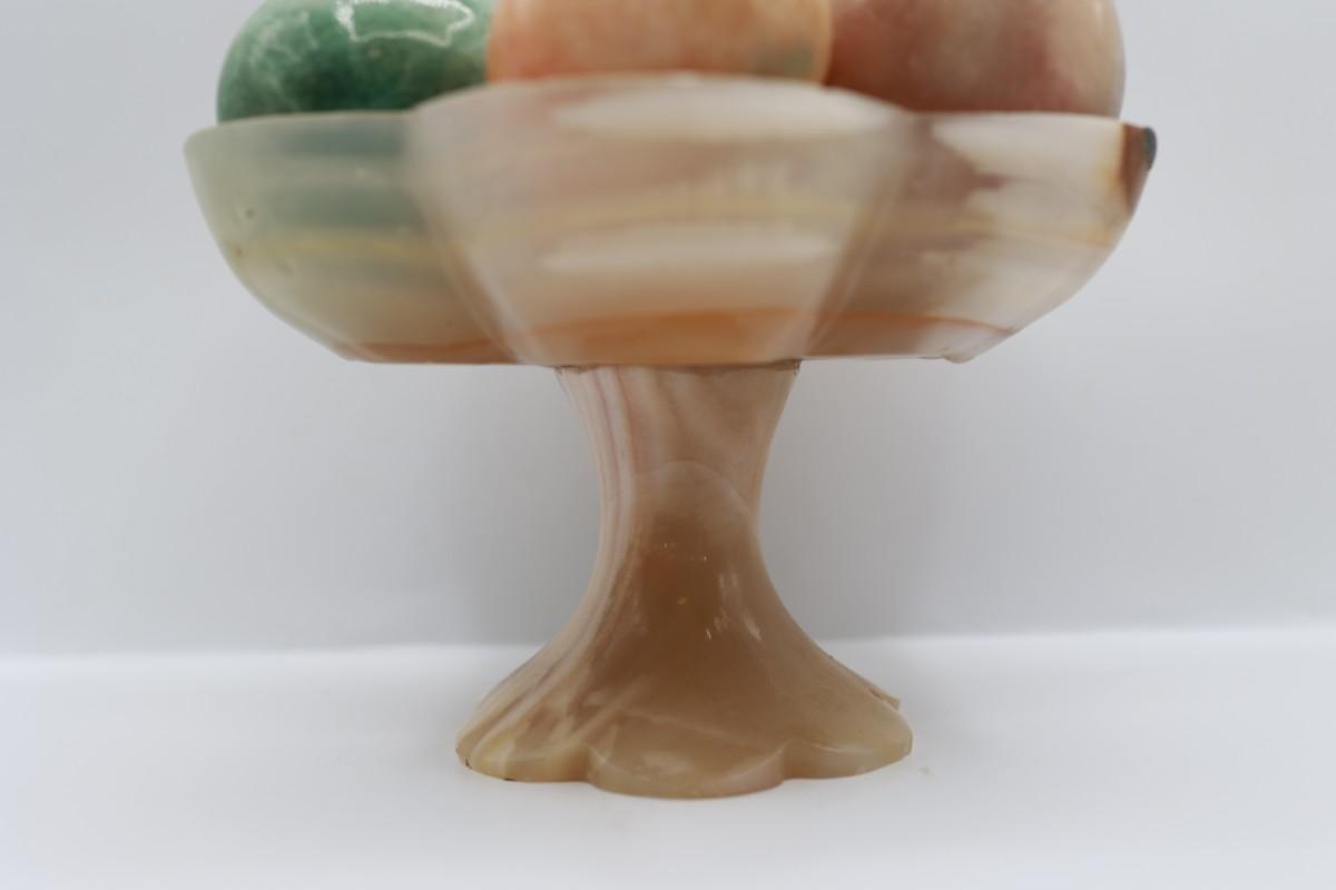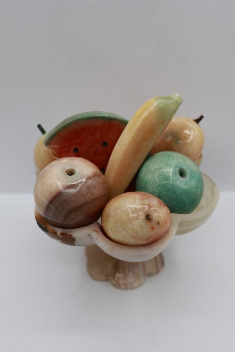 Carved stone fruit set in a scalloped footed bowl. Likely onyx or similar banded stone. Minor surface wear—see photos for details.