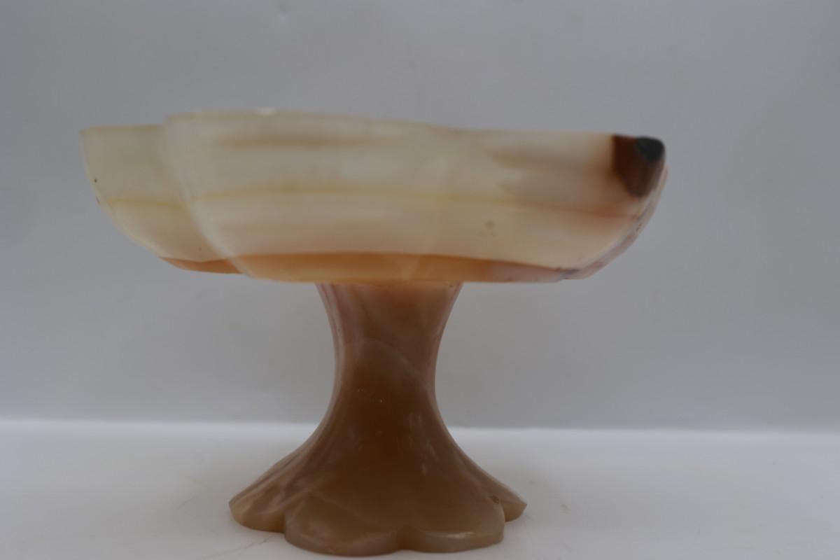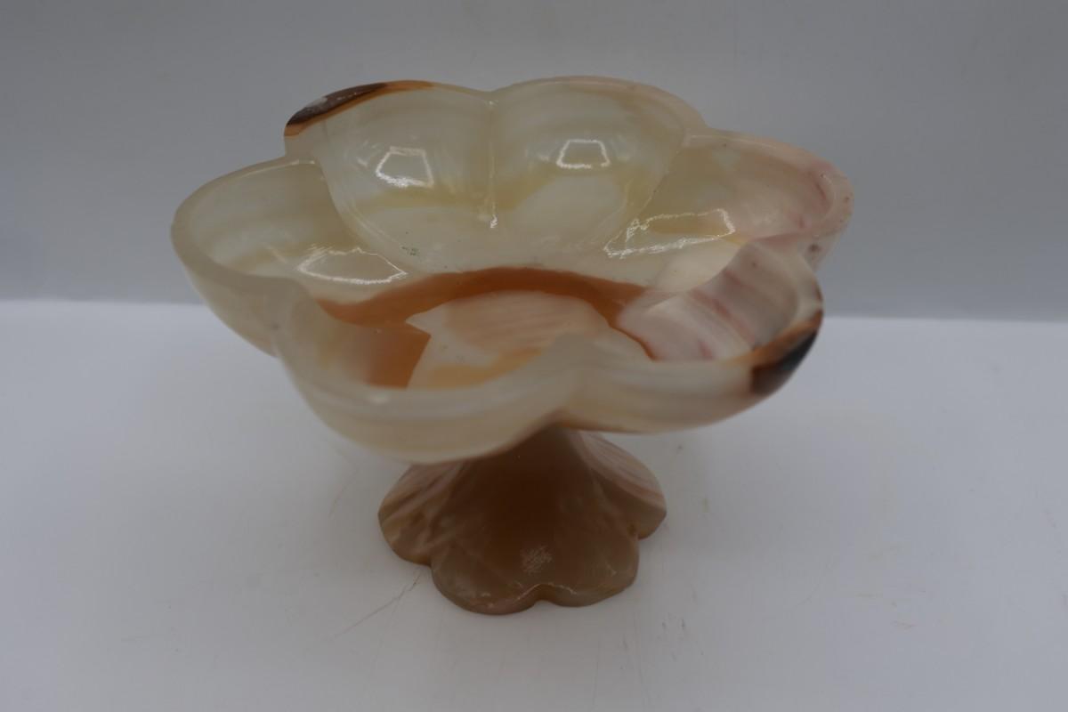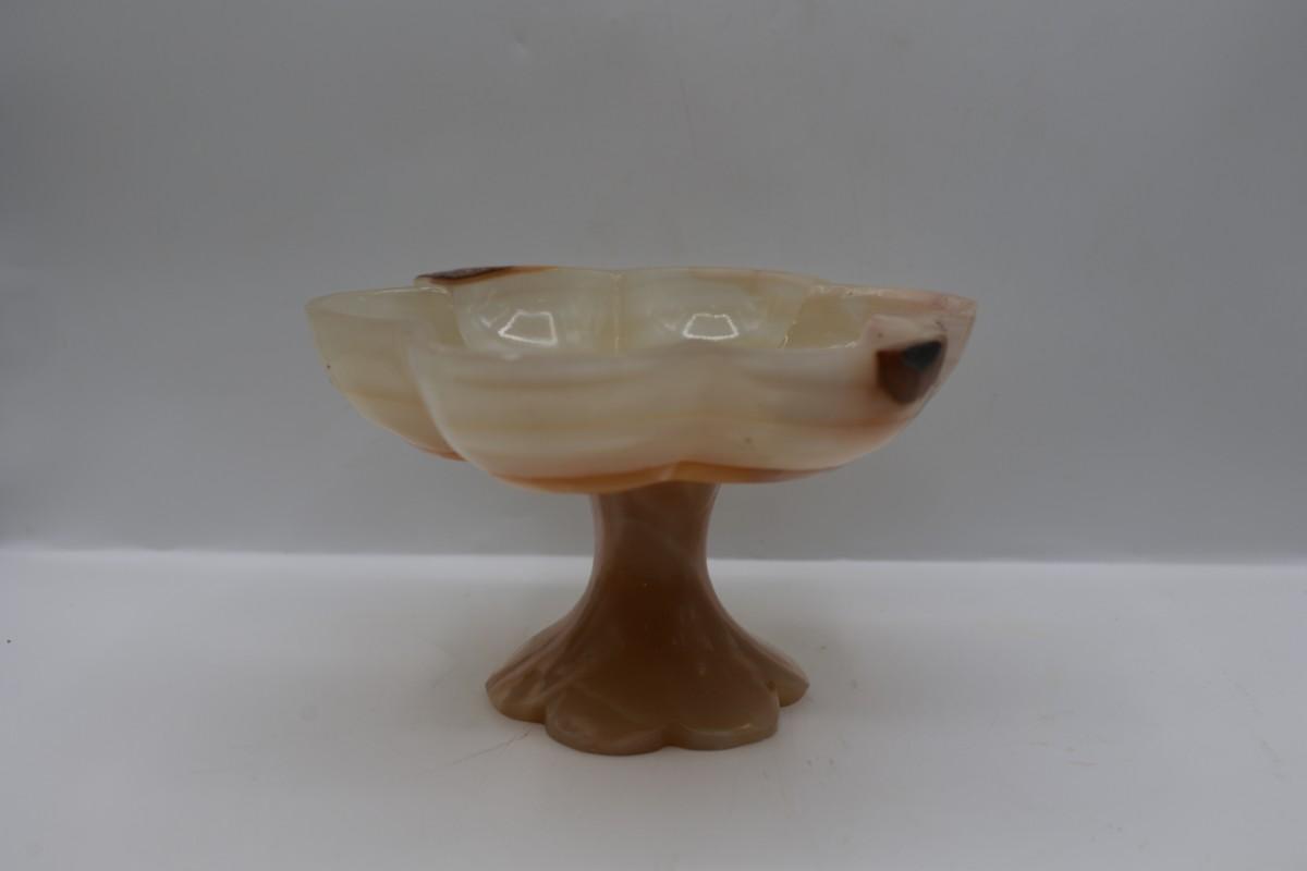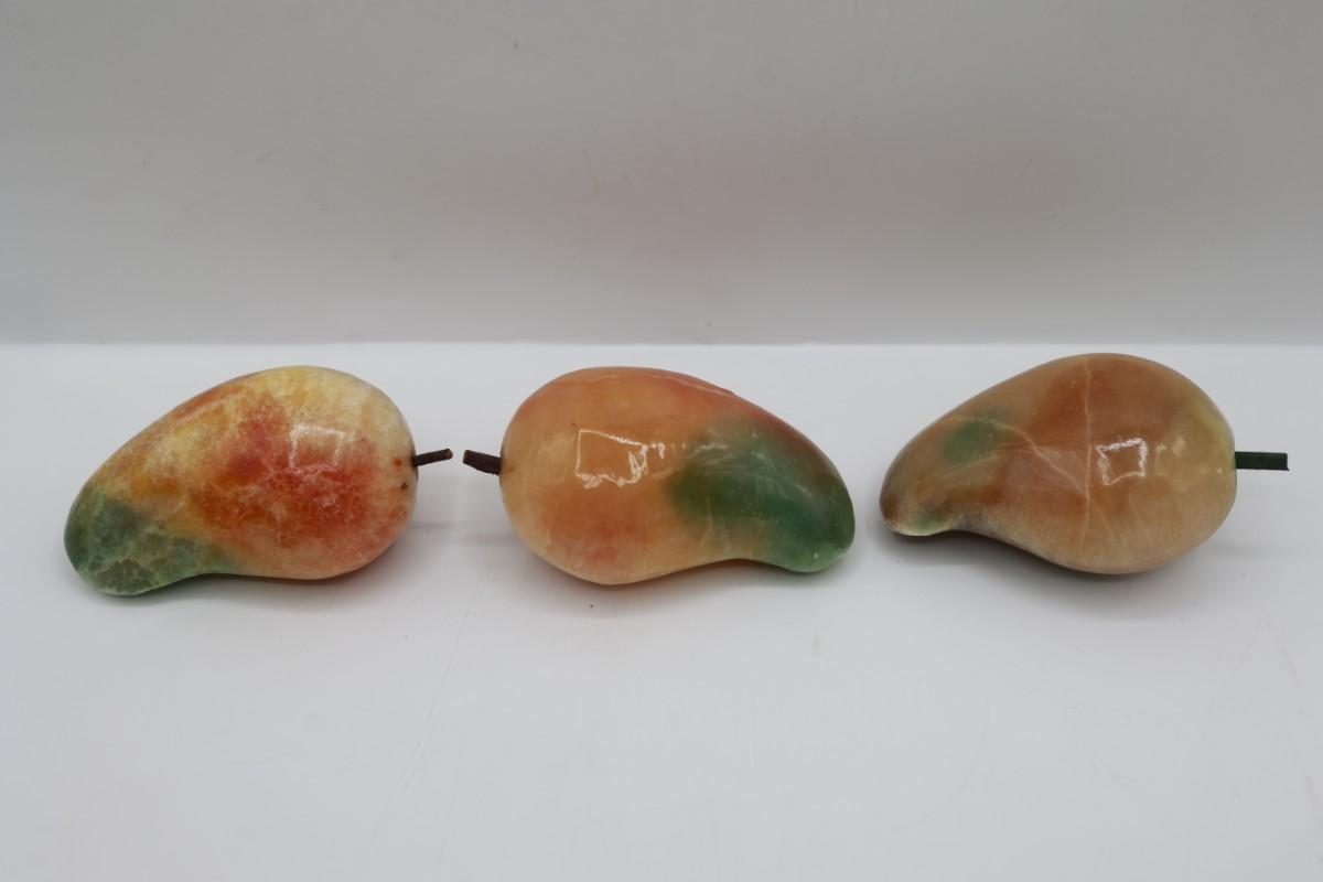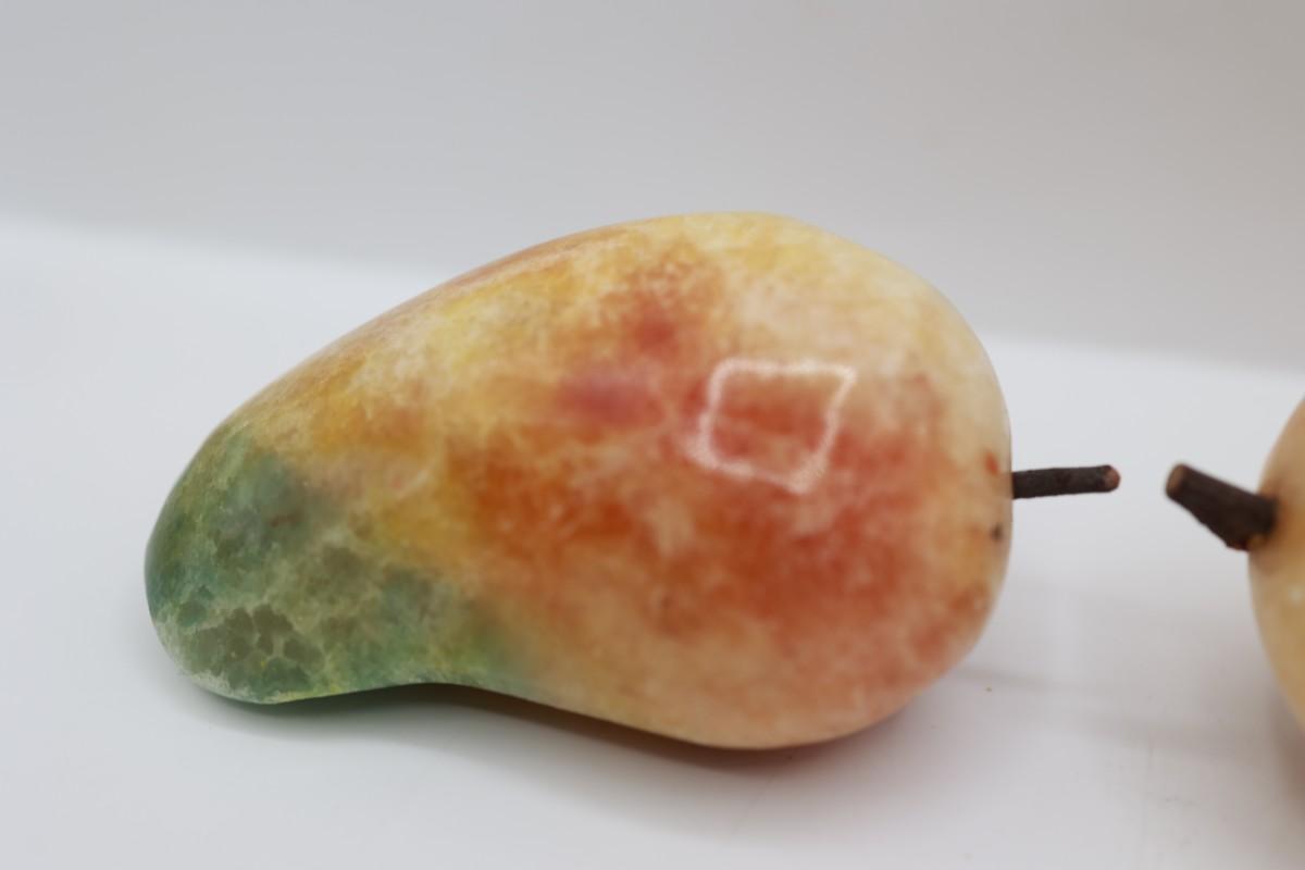 Carved stone fruit set in a scalloped footed bowl. Likely onyx or similar banded stone. Minor surface wear—see photos for details.