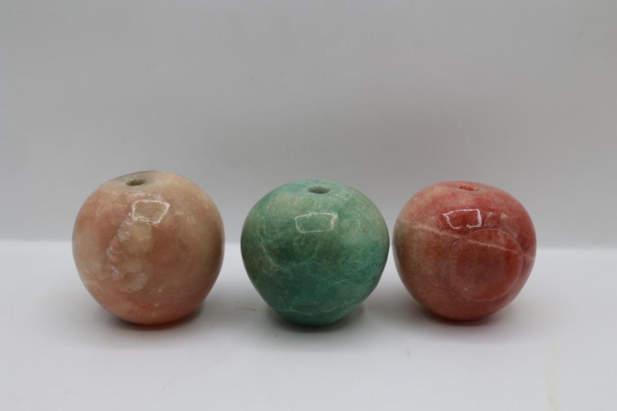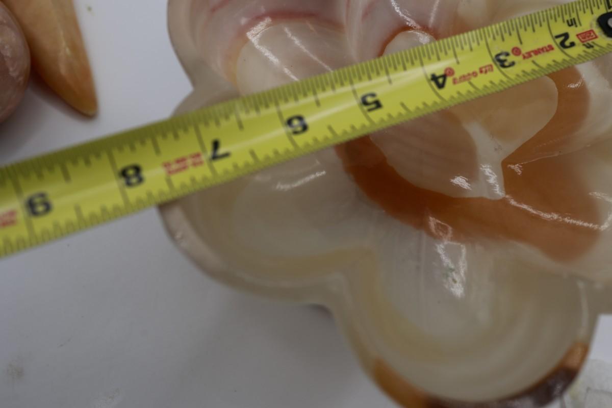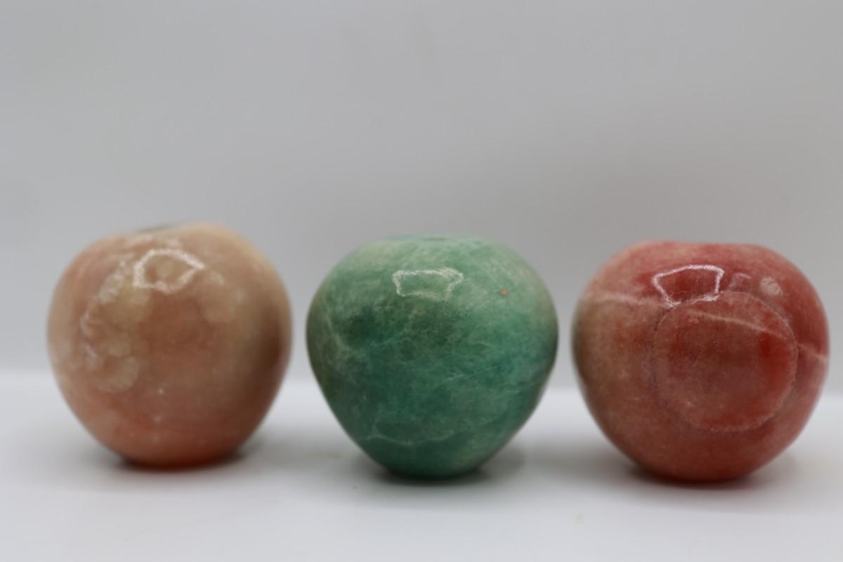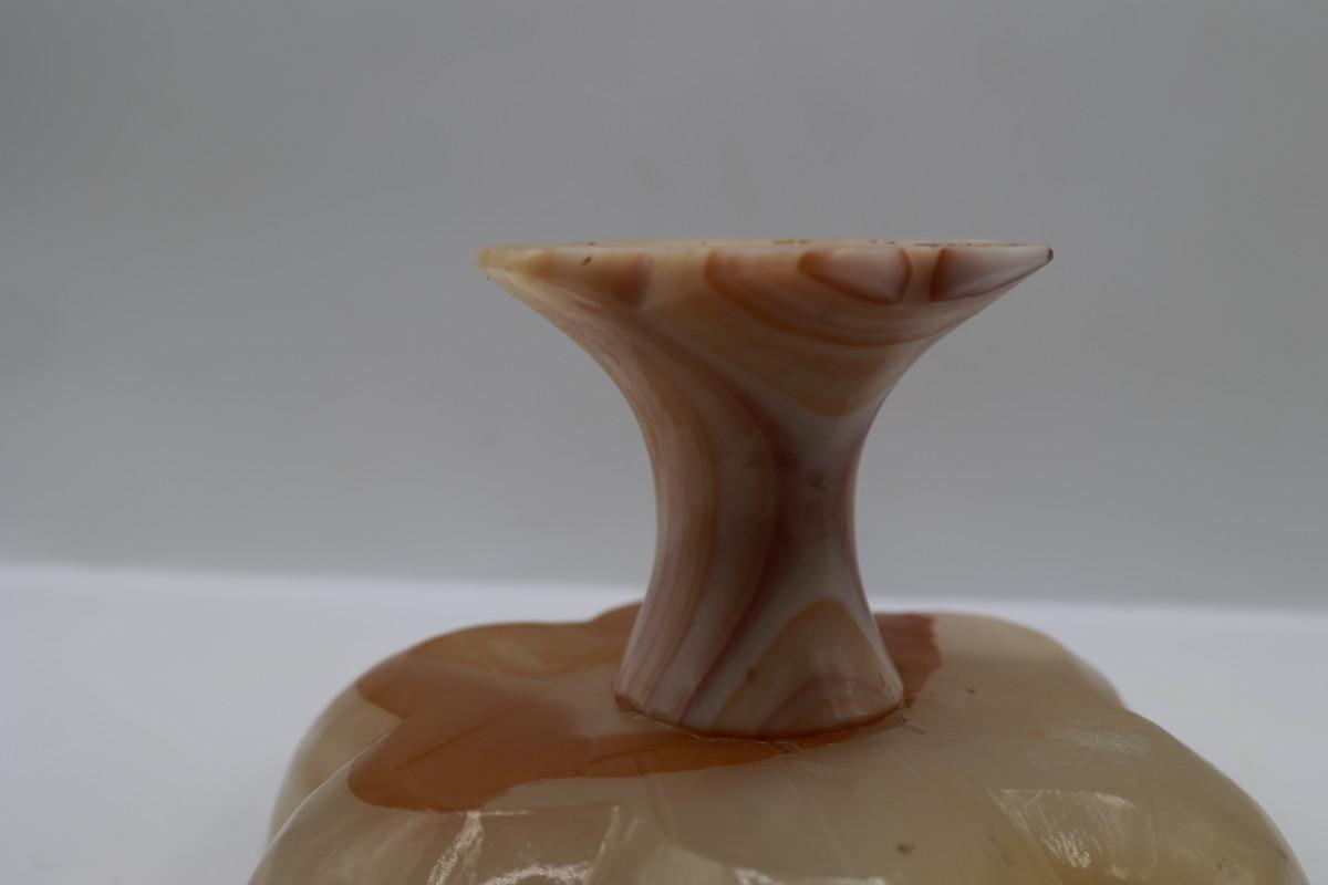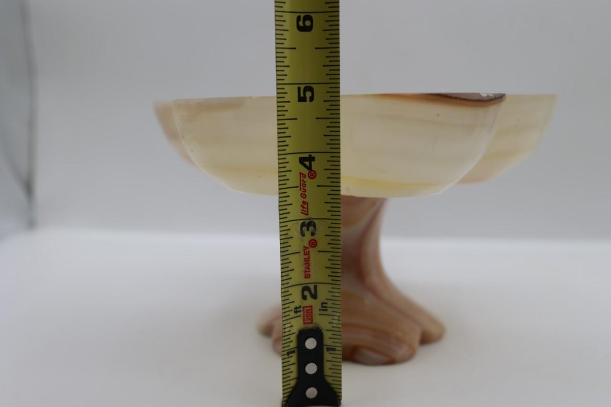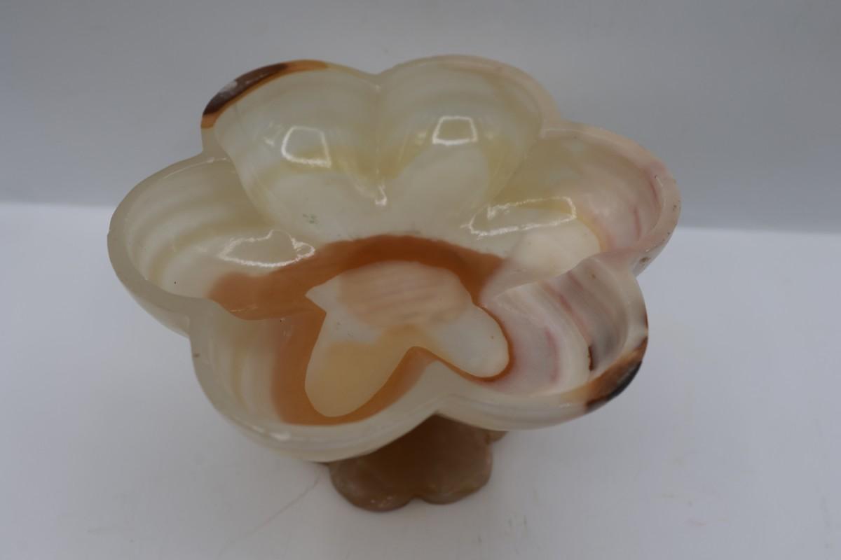 Carved stone fruit set in a scalloped footed bowl. Likely onyx or similar banded stone. Minor surface wear—see photos for details.