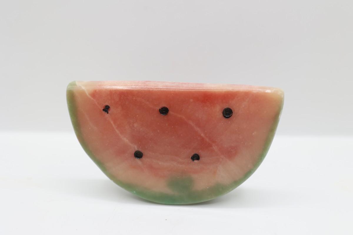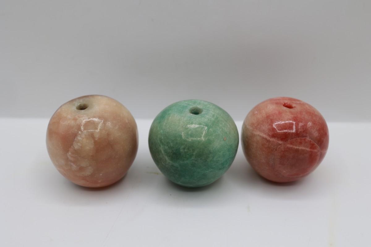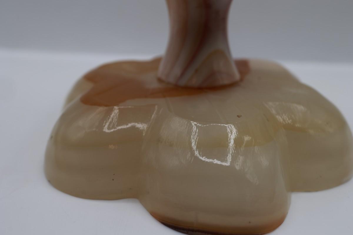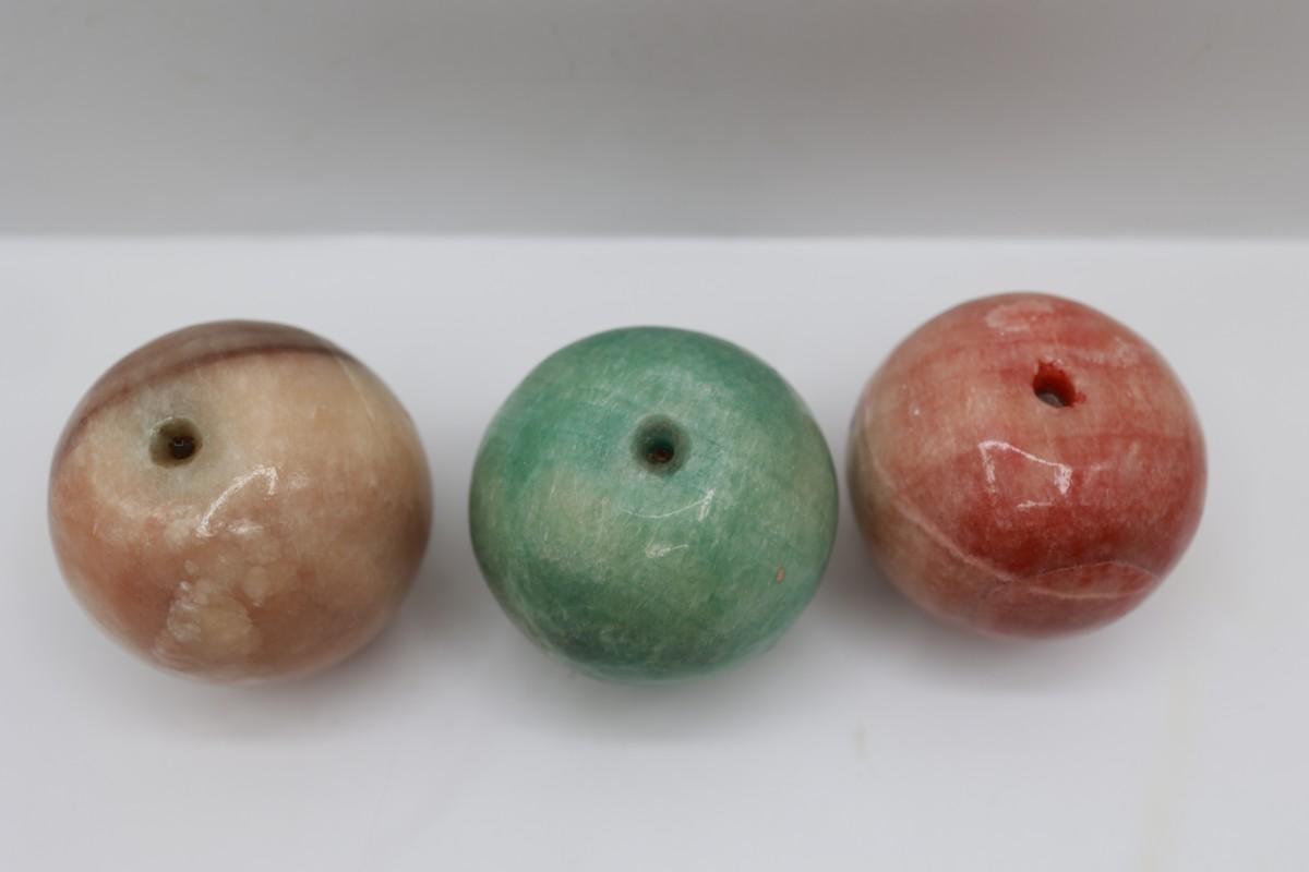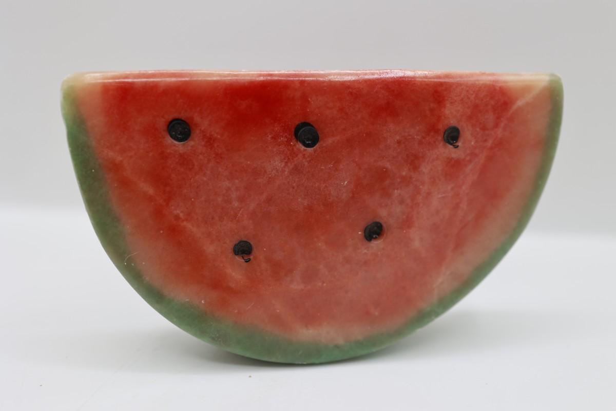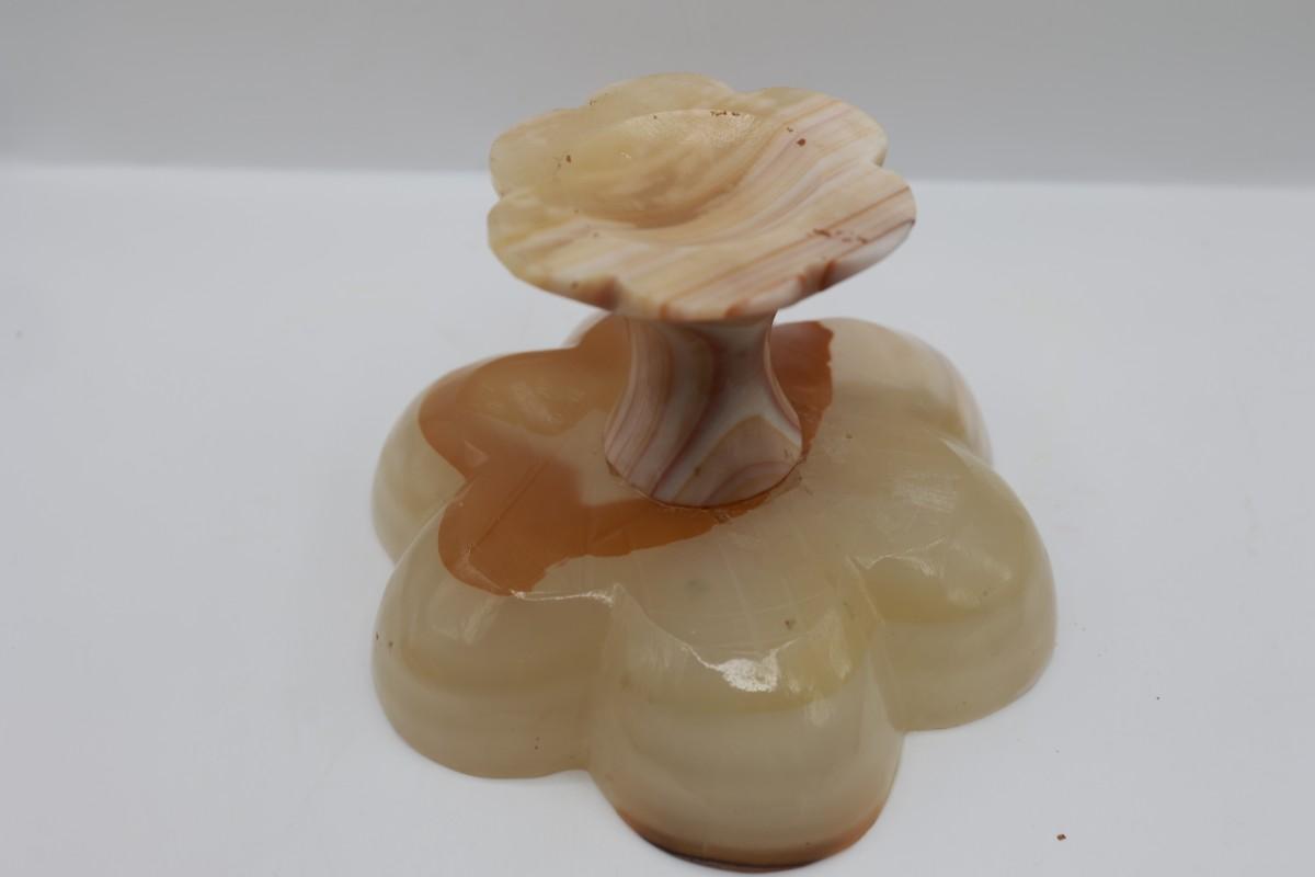 Carved stone fruit set in a scalloped footed bowl. Likely onyx or similar banded stone. Minor surface wear—see photos for details.