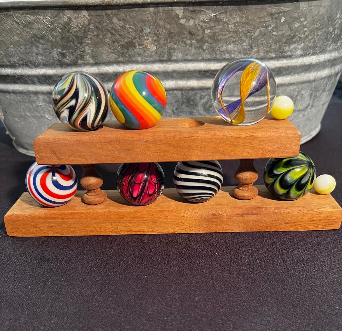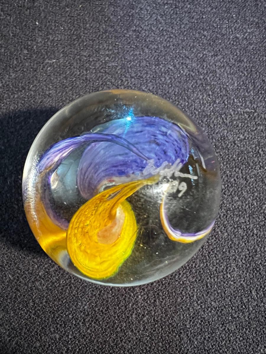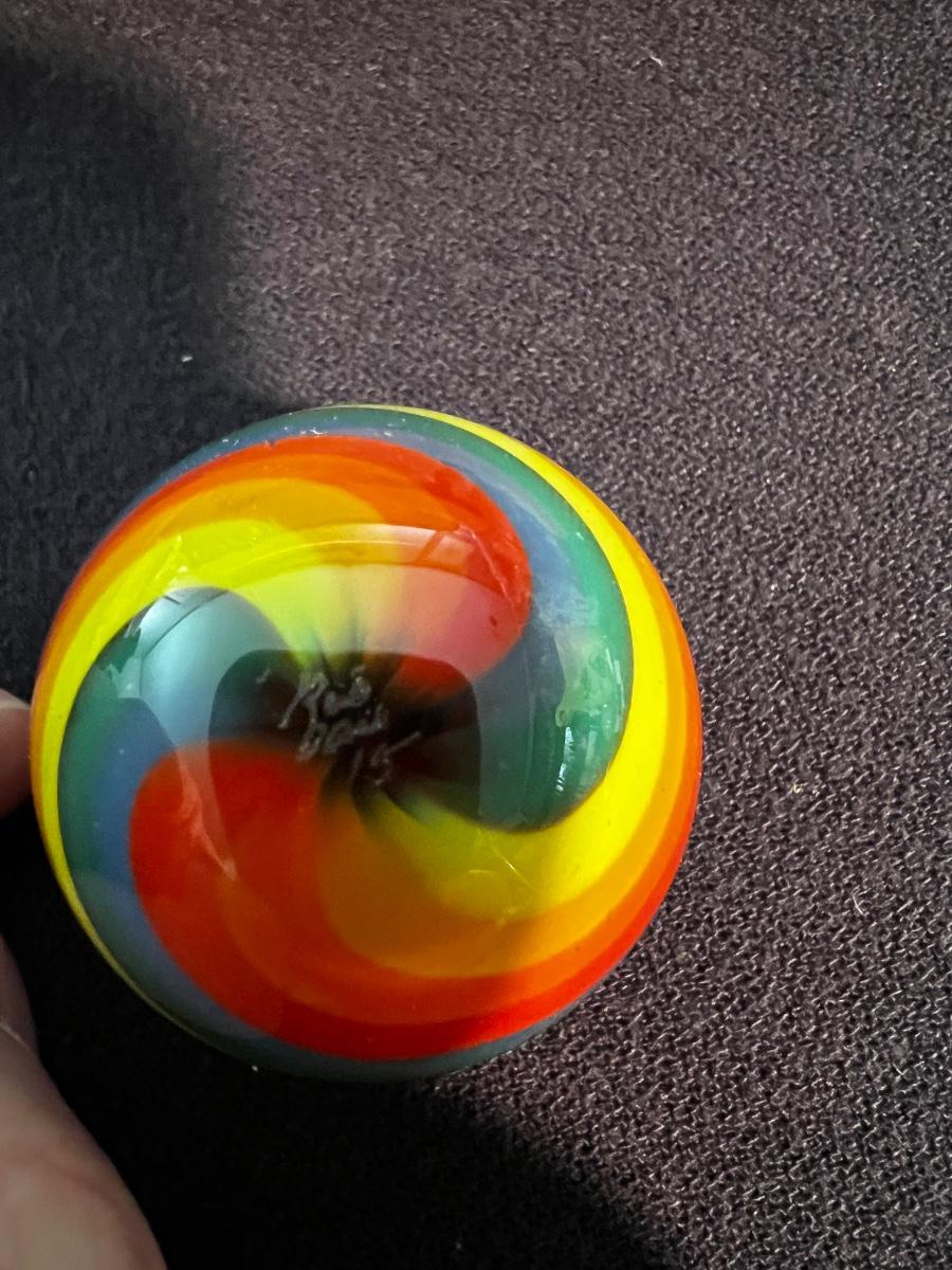 Lot of 7 Marbles all signed. The yellow marbles is for scale.