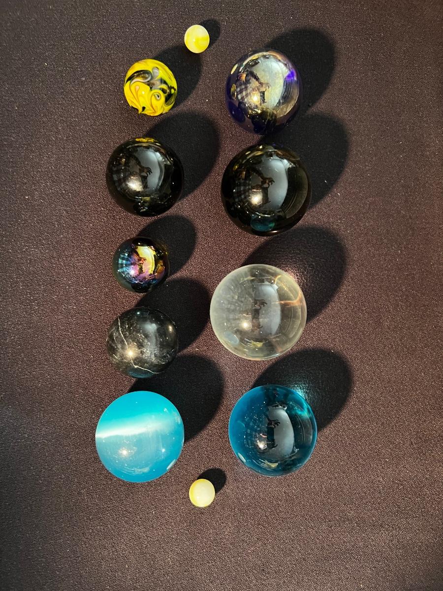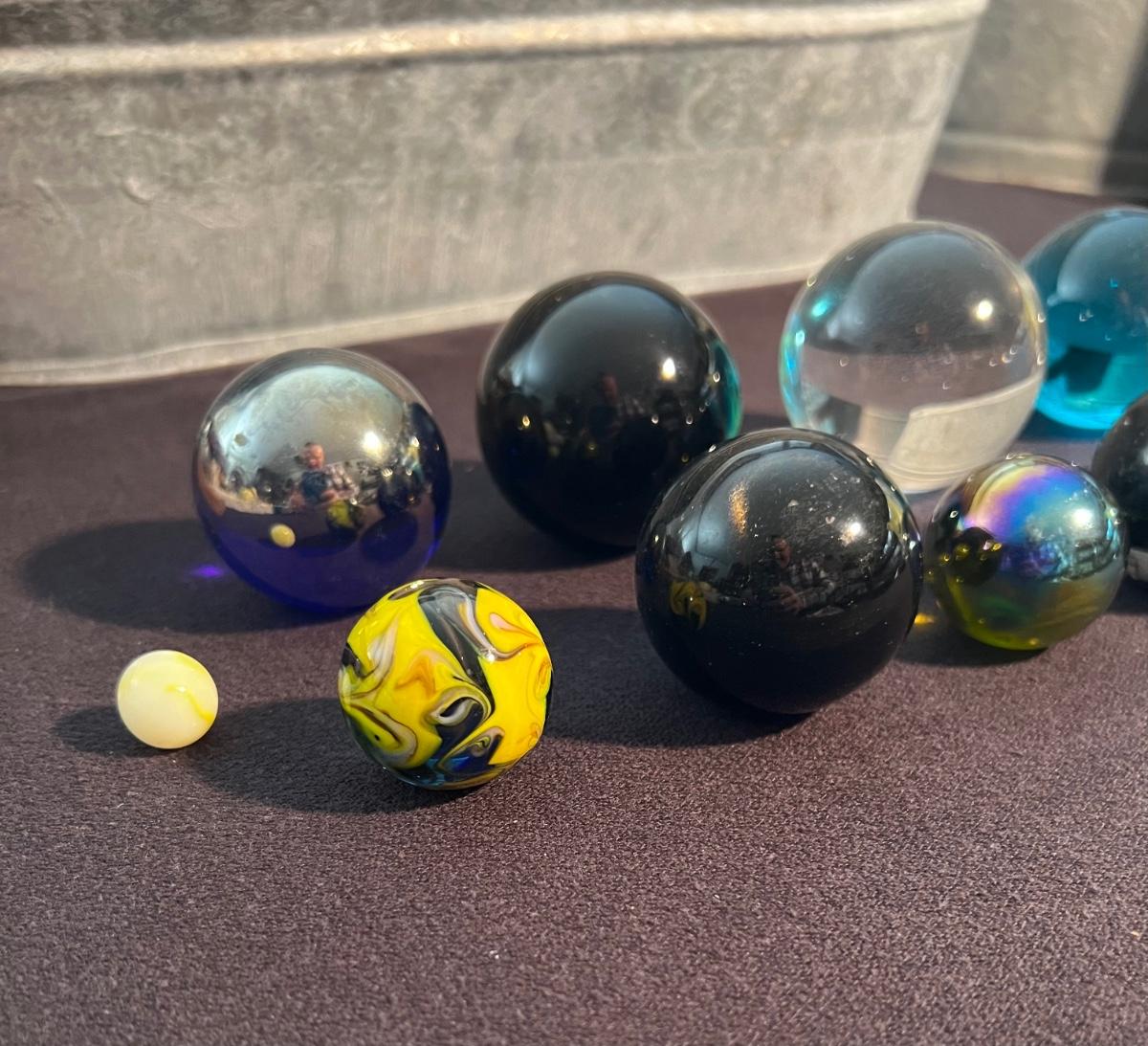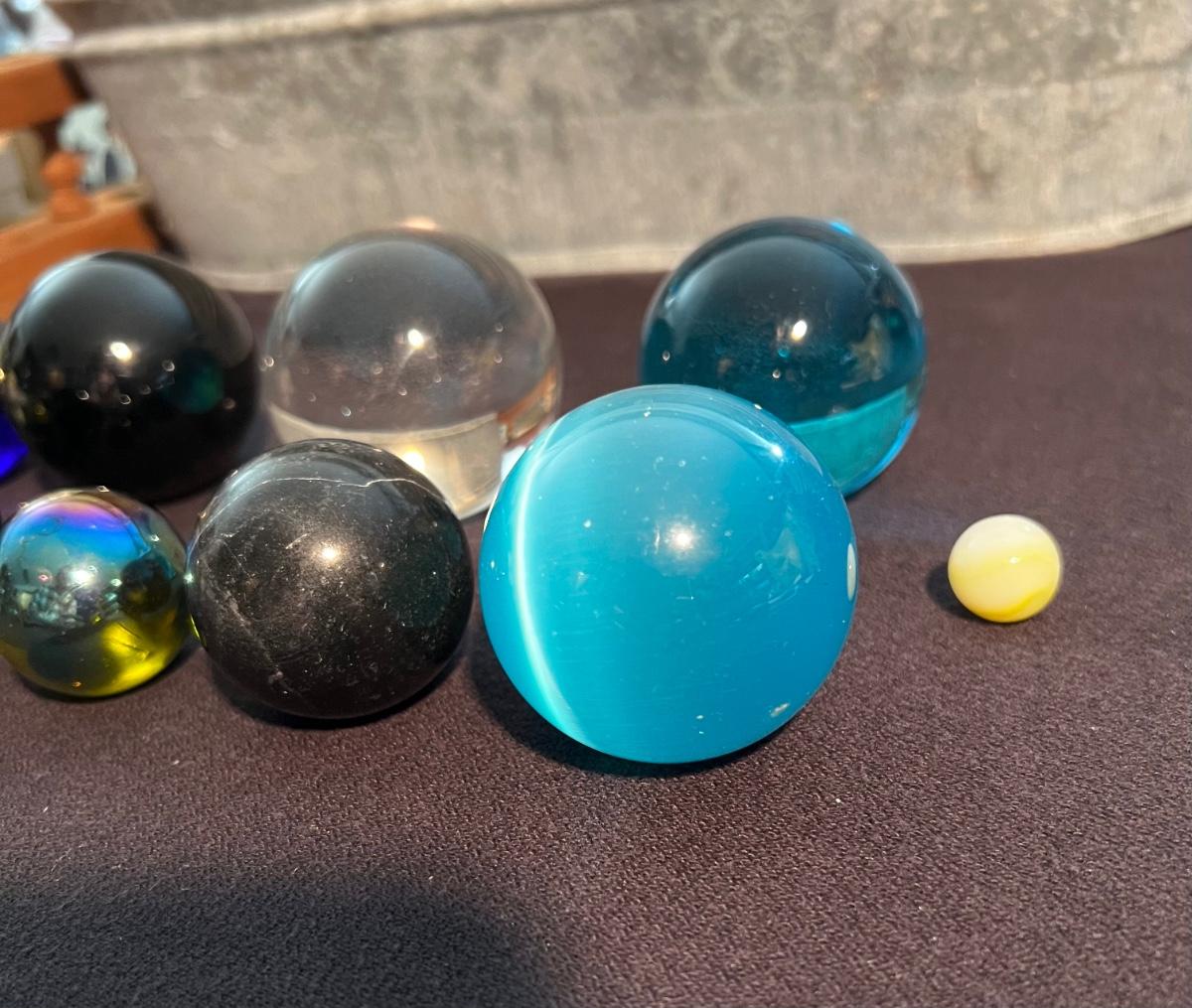 Lot of 9 marbles. The yellow marbles are for scale