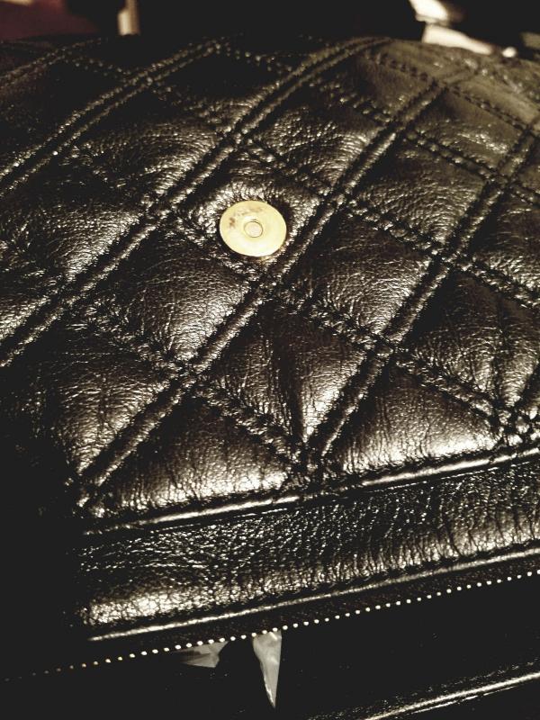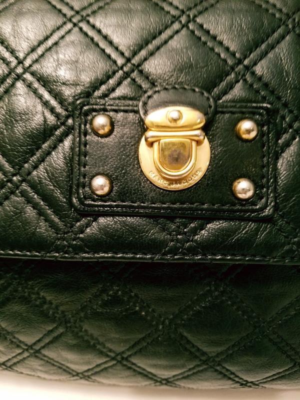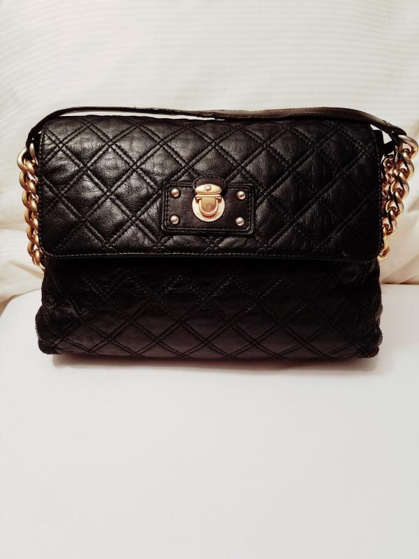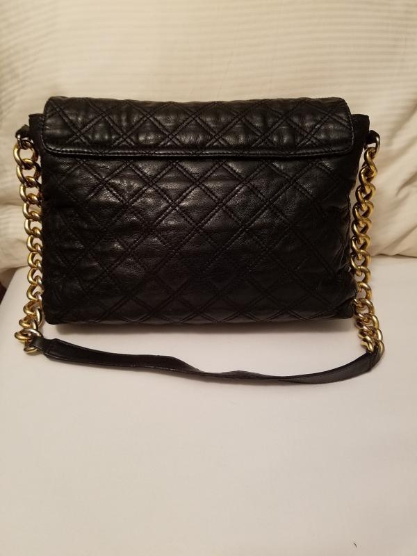 A stunner by Marc Jacobs. It is quilted with a heavy gold chain as strap. with a small part of leather strap at top . signed on the leather and the gold hardware. The inside is canvas with some leather .In very good vintage condition all outside and in. The only part that is a bit used is the top little part of leather on the strap and even that is fine.