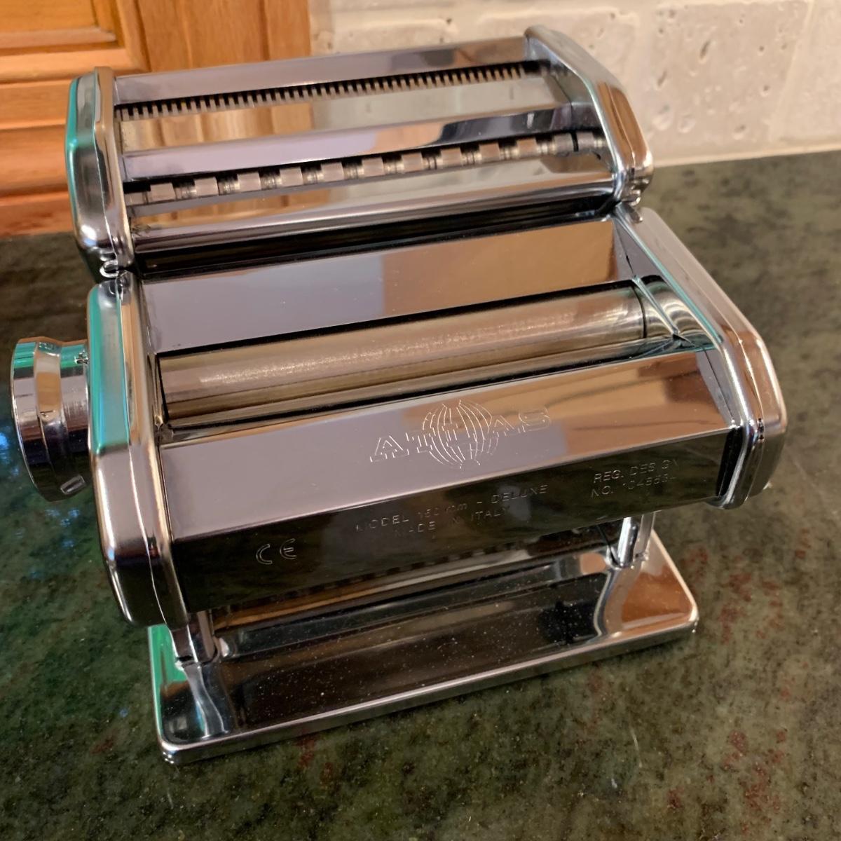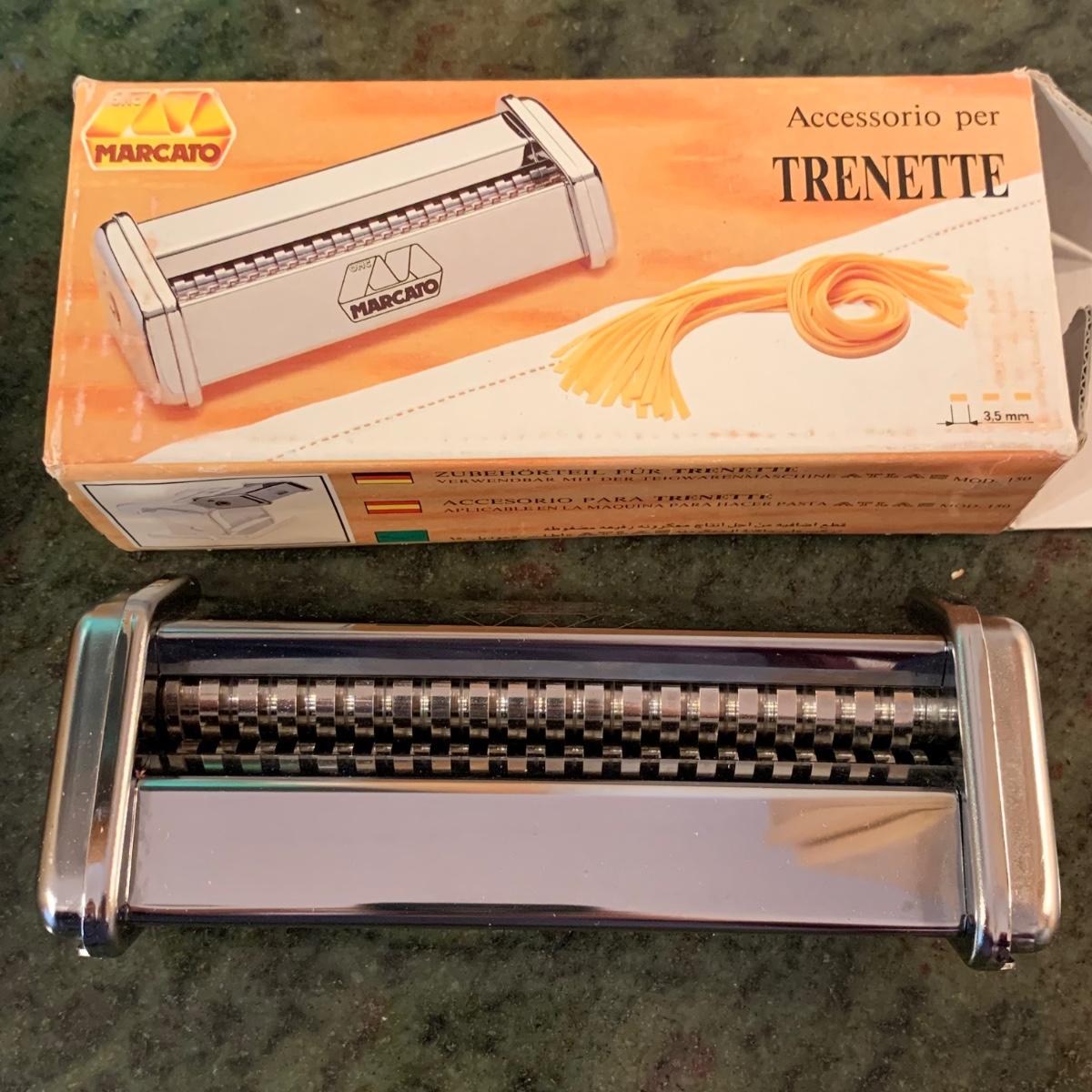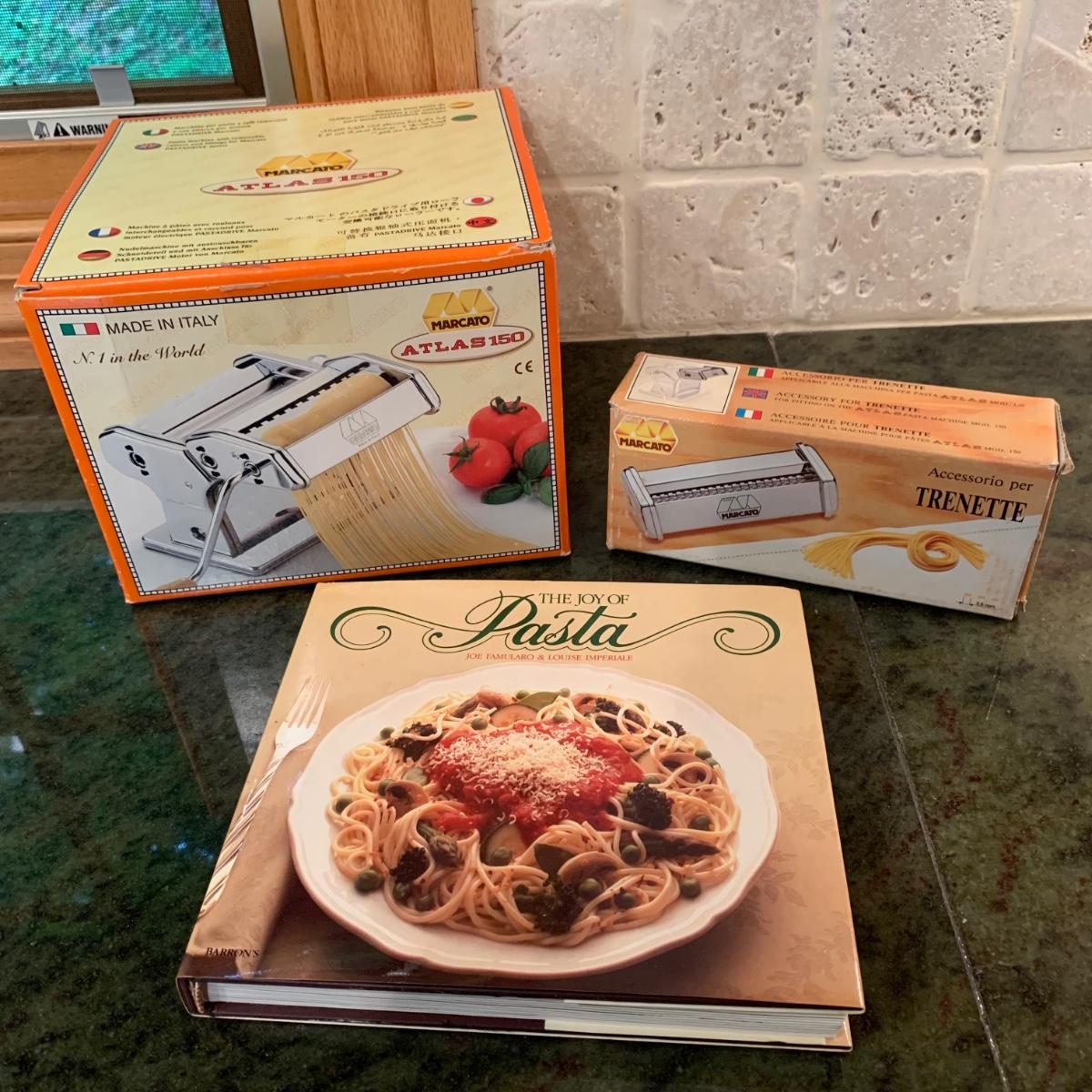 Marcato Atlas 150 pasta maker with its original box, Marcato Trenette accessory, and a ‘Joy of Pasta’ cookbook. Pasta maker and accessory are metal and appear to be in like-new condition.