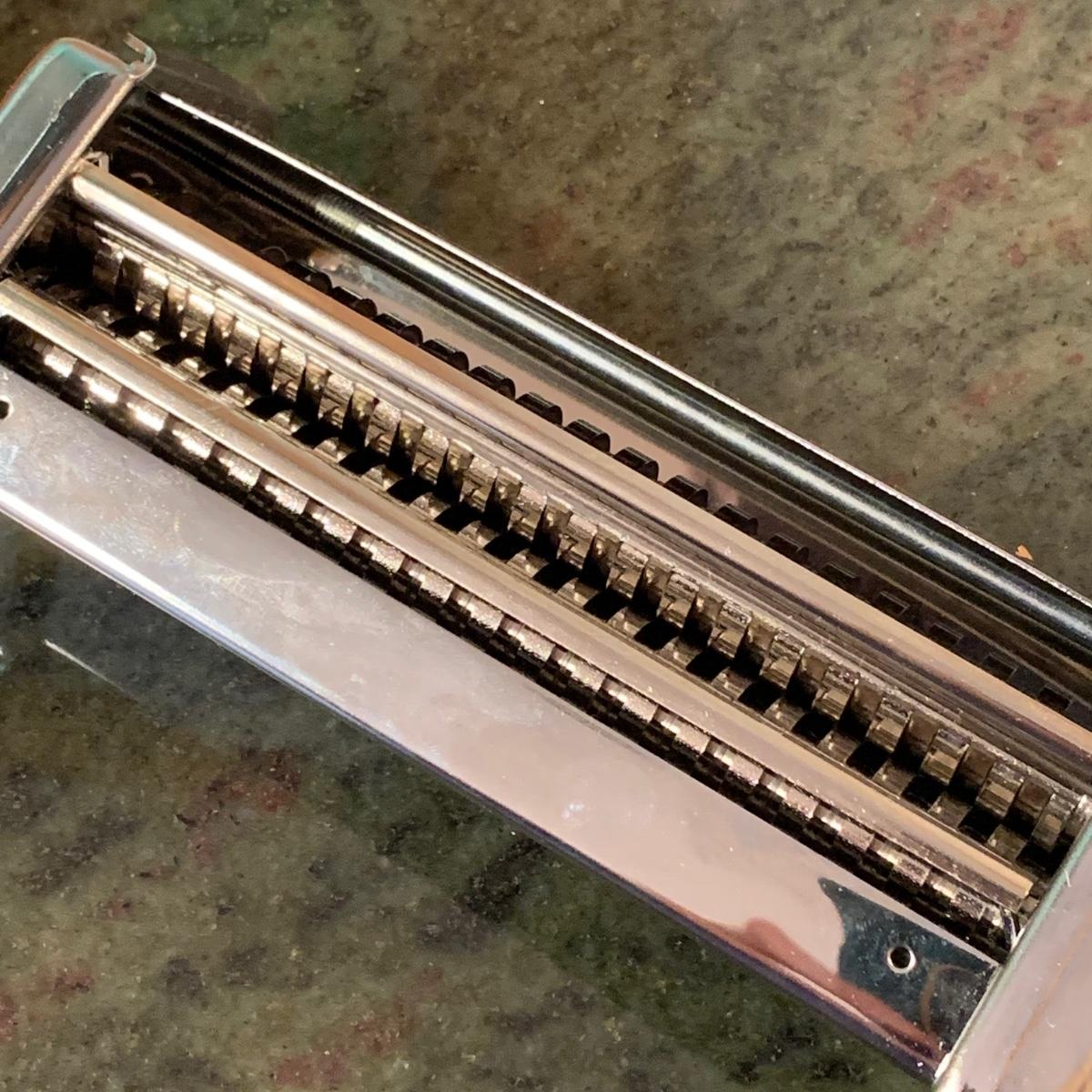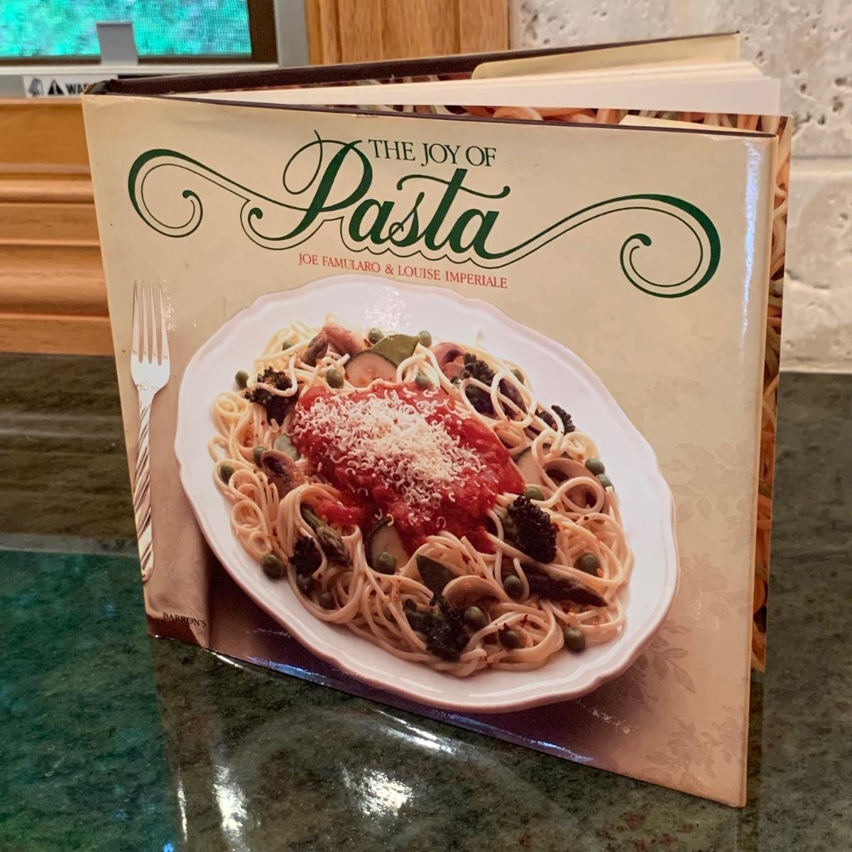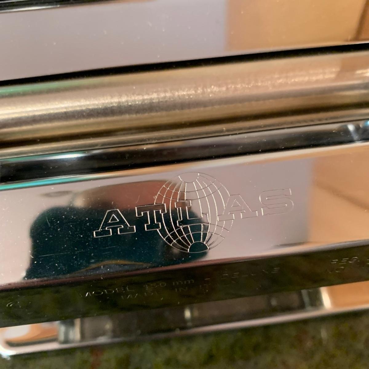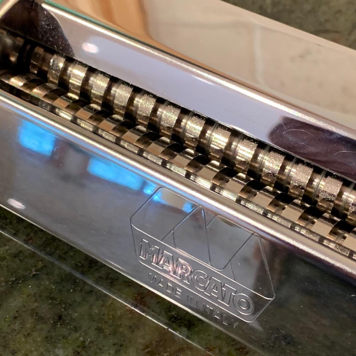 Marcato Atlas 150 pasta maker with its original box, Marcato Trenette accessory, and a ‘Joy of Pasta’ cookbook. Pasta maker and accessory are metal and appear to be in like-new condition.