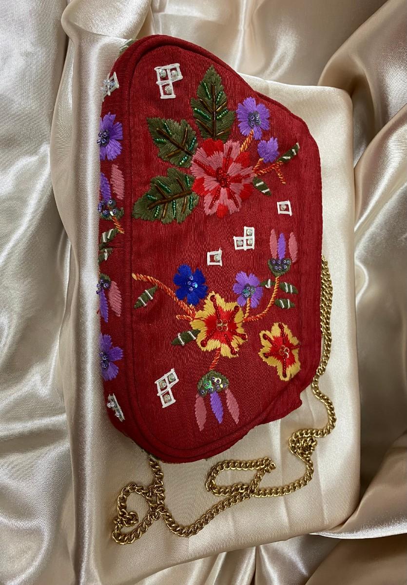 Beaded front and back, red background. Magnetic closure. 1 open interior pocket. good condition. 9.5 inches wide by 6 inches tall.