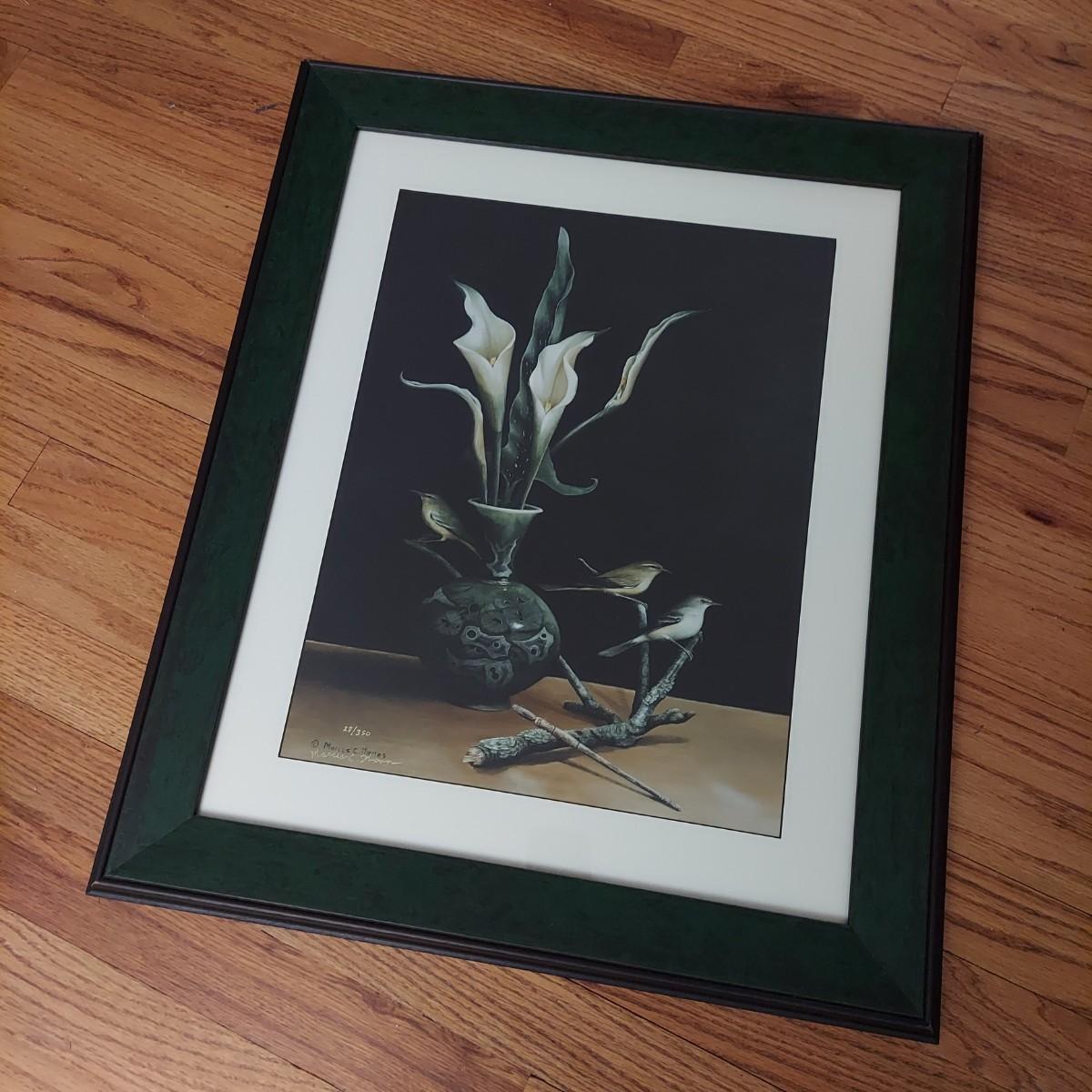 Framed and matted Marcus C. Thomas print. Signed and numbered. In a green wood-like frame that's 21" x 25"H. Shipping available. Shipping available. Shipping can be costly. We suggest contacting our preferred local shipping provider, Postage Express, with dimensions and getting an estimate before bidding: (828) 670-5501or postageexpress@yahoo.com.