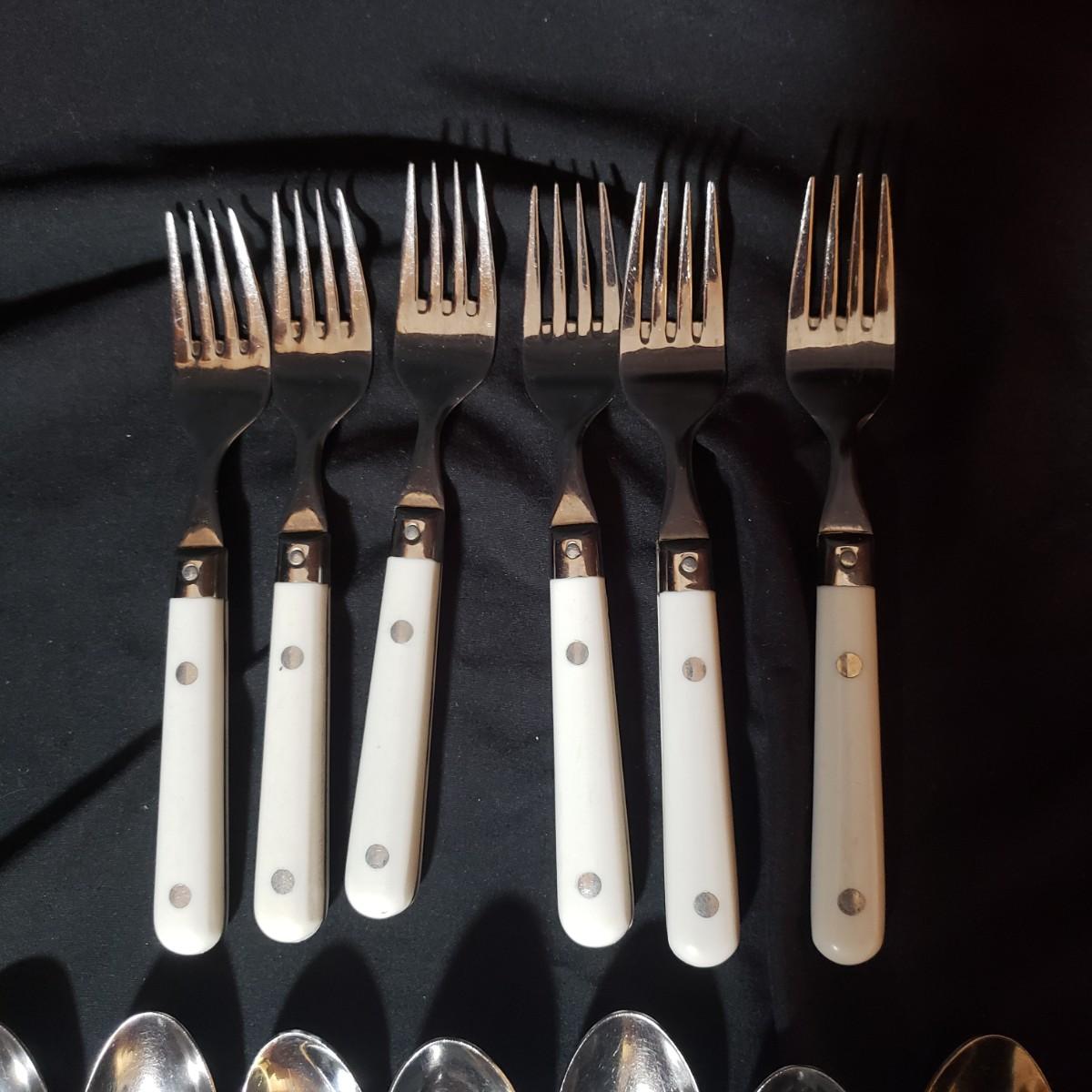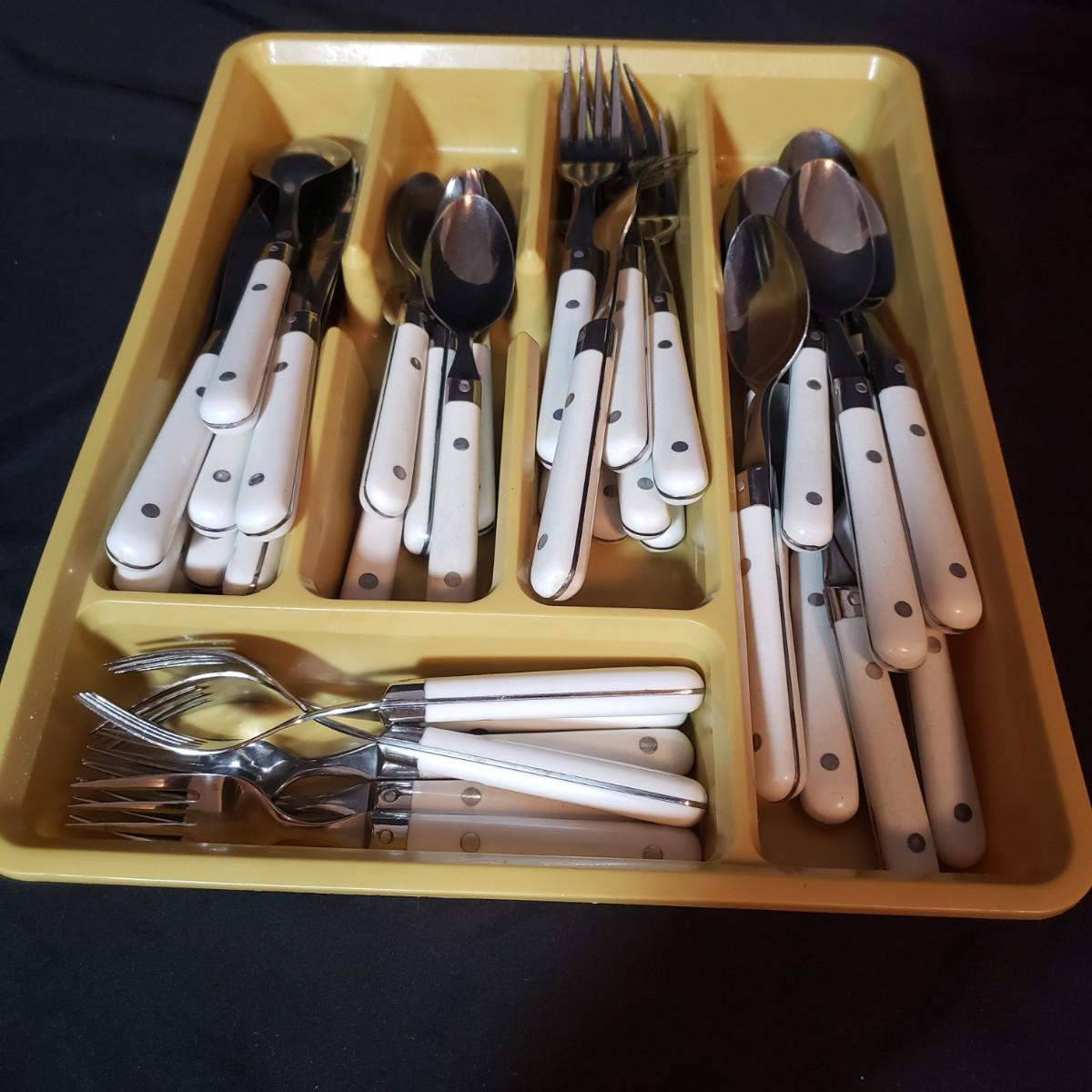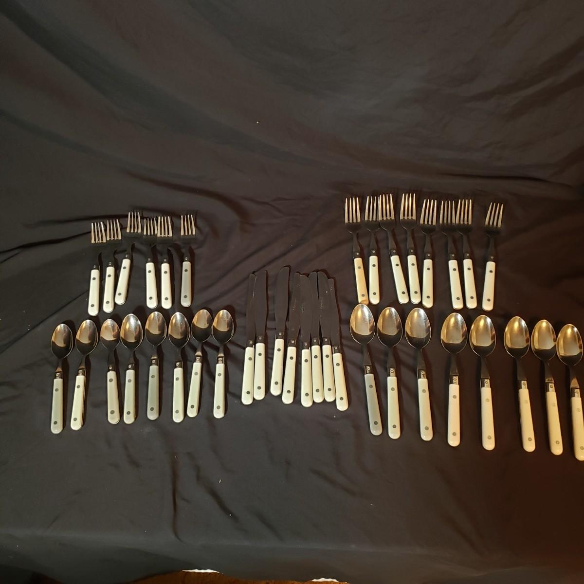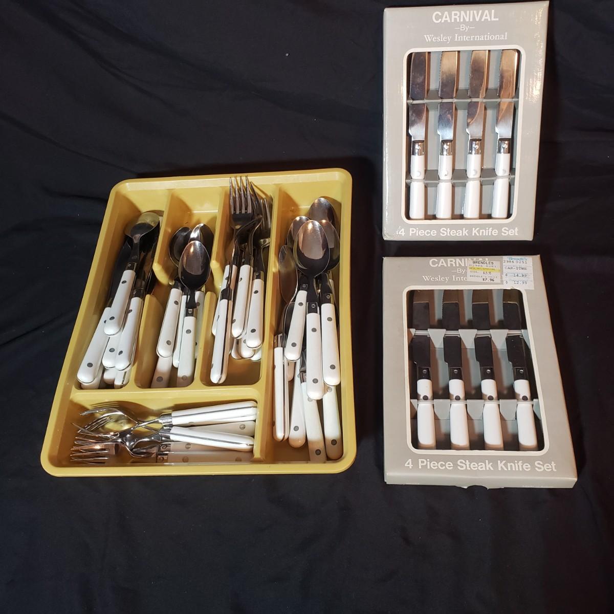 This silverware set comes with two NIB steak knives by Wesley International. The stainless steel silver set is by Mardi Gras. The set comes with six small forks, eight small spoons, eight knives, and eight large forks and spoons. The handle is a hard plastic and feels sturdy.