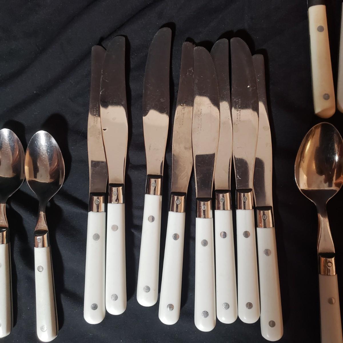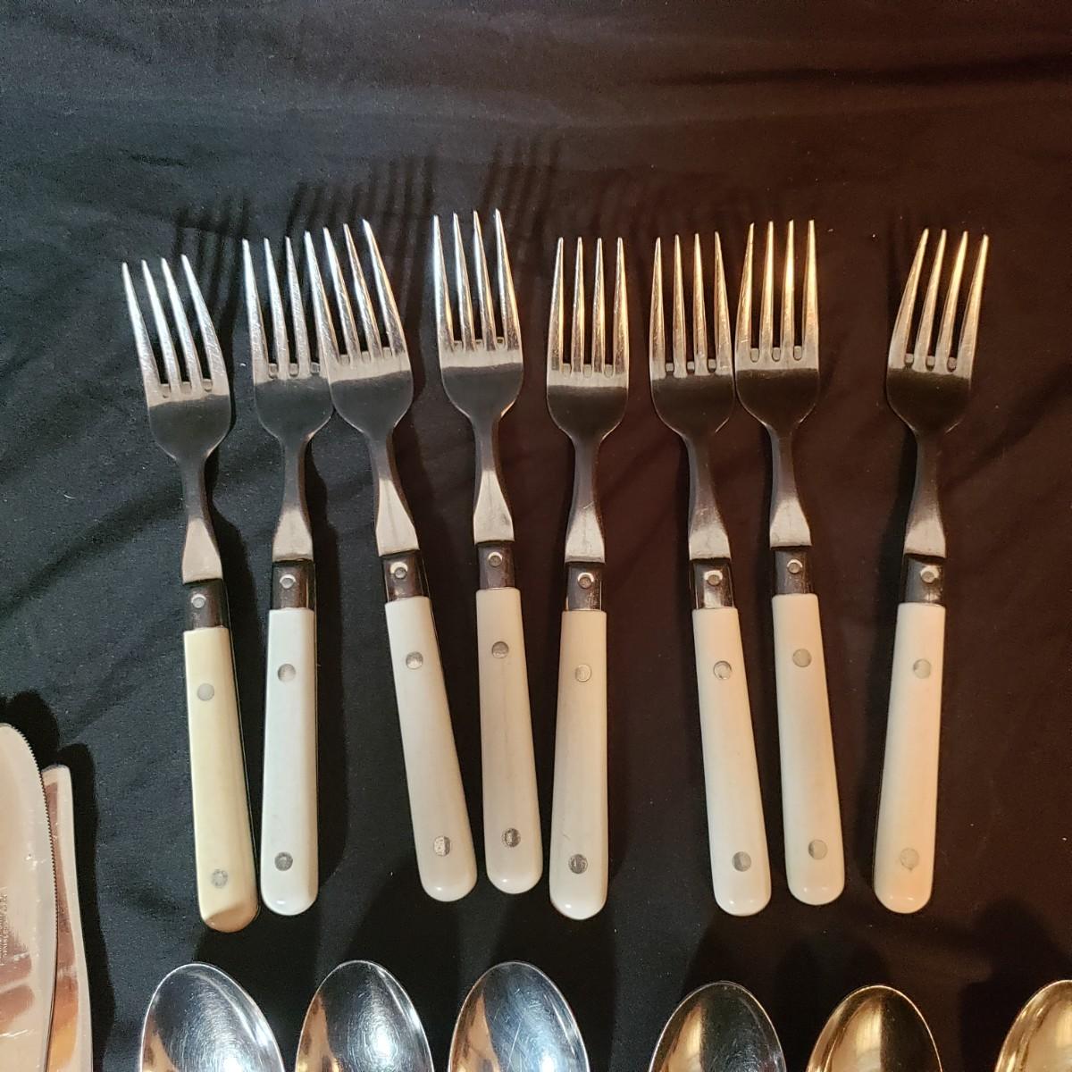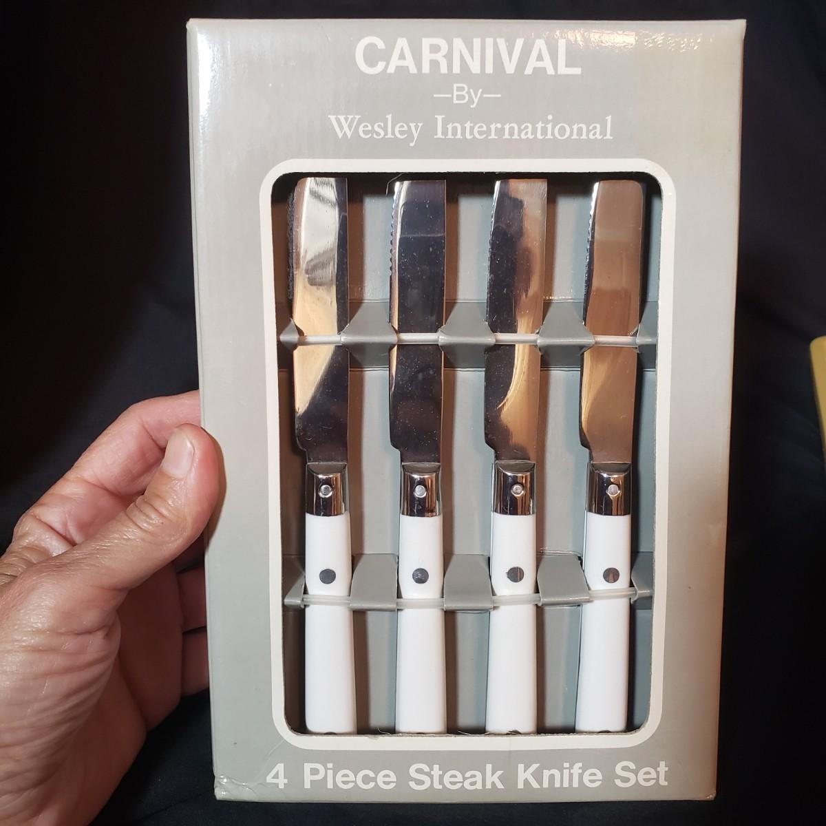 This silverware set comes with two NIB steak knives by Wesley International. The stainless steel silver set is by Mardi Gras. The set comes with six small forks, eight small spoons, eight knives, and eight large forks and spoons. The handle is a hard plastic and feels sturdy.