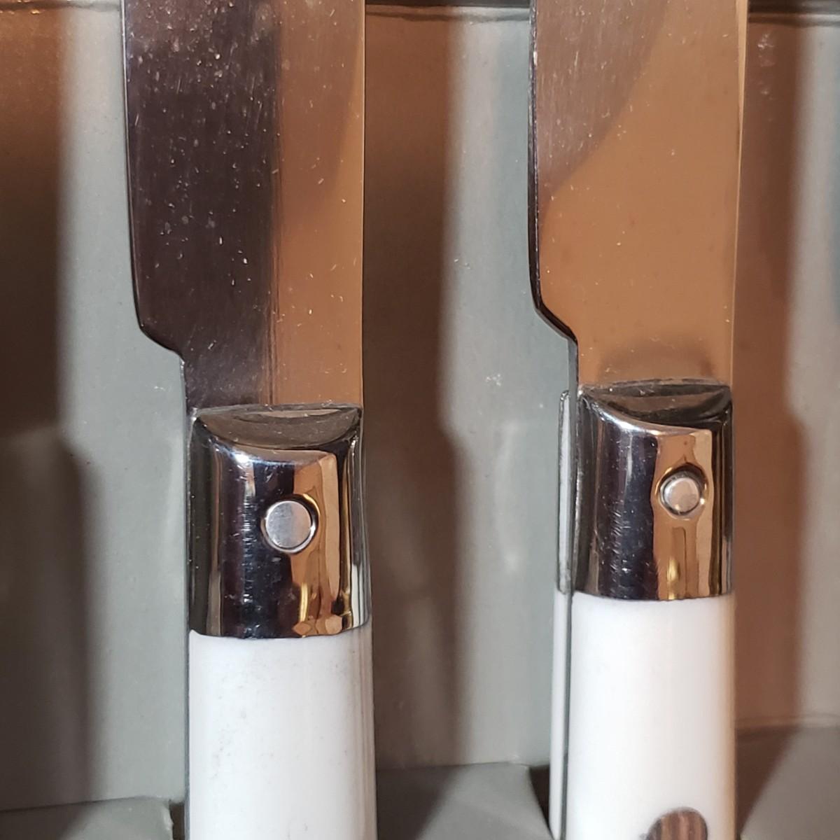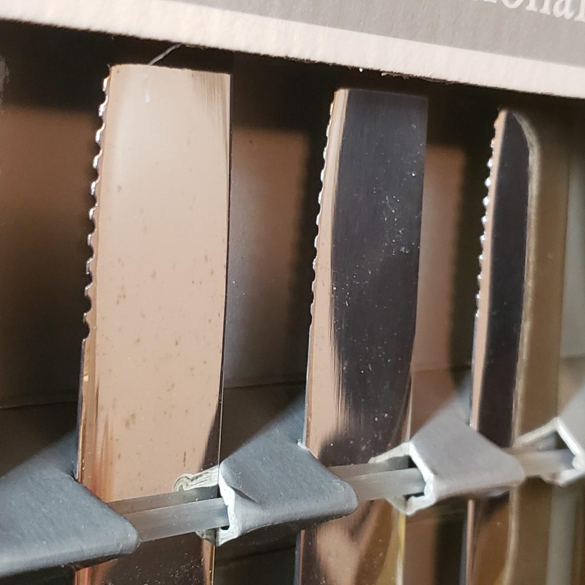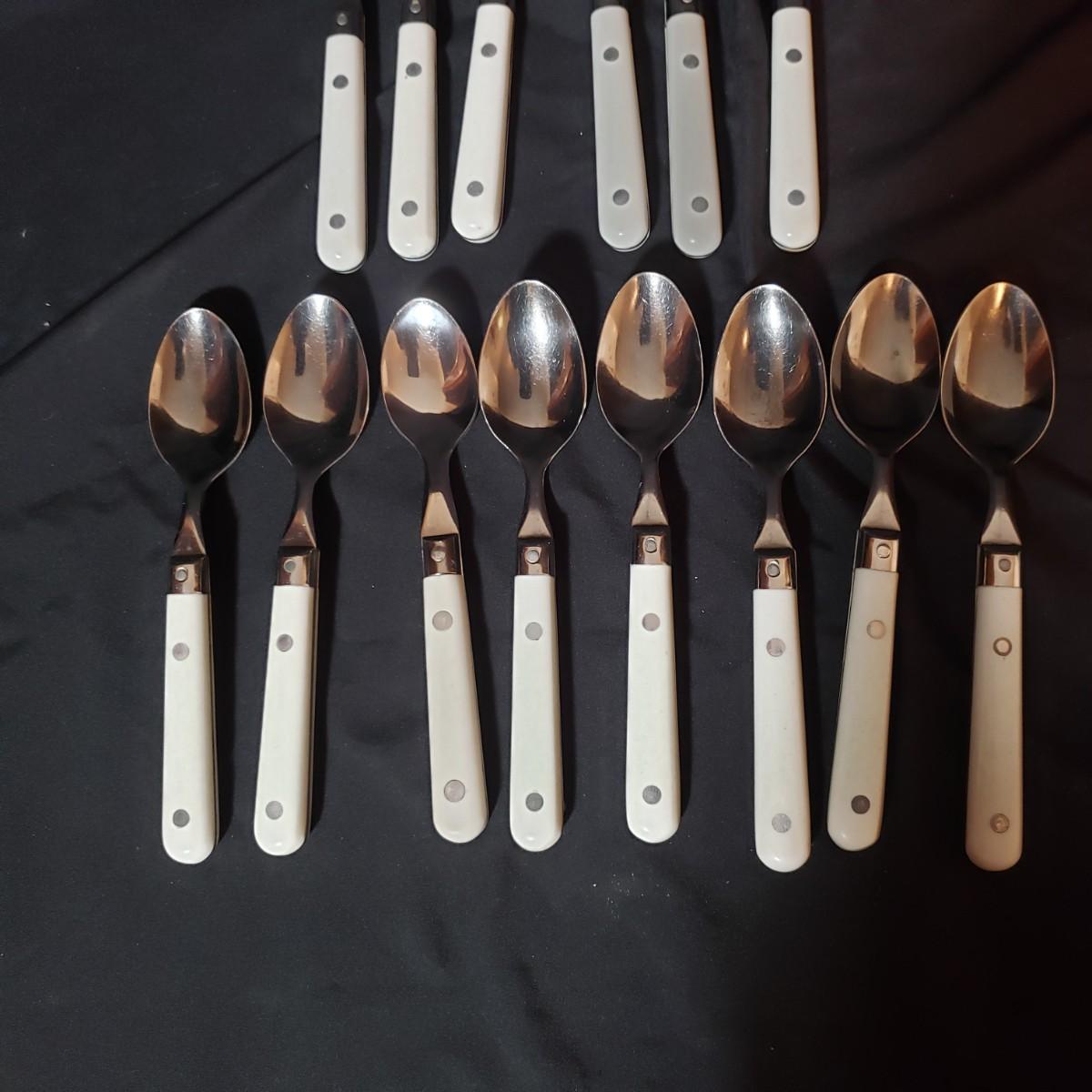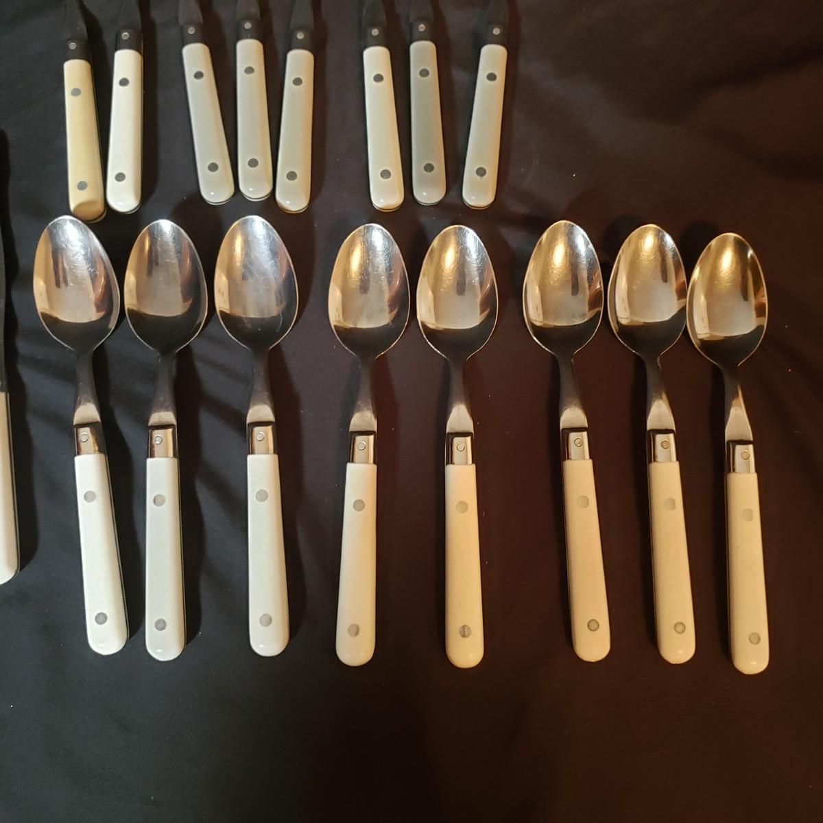 This silverware set comes with two NIB steak knives by Wesley International. The stainless steel silver set is by Mardi Gras. The set comes with six small forks, eight small spoons, eight knives, and eight large forks and spoons. The handle is a hard plastic and feels sturdy.