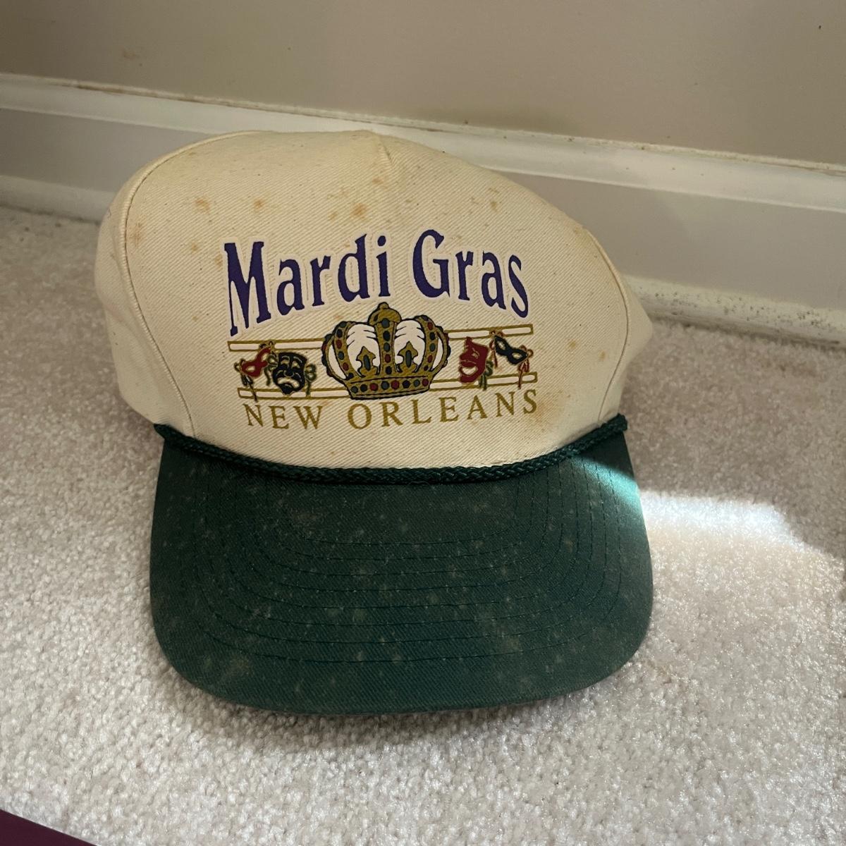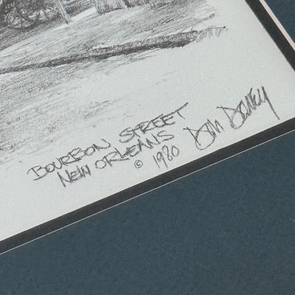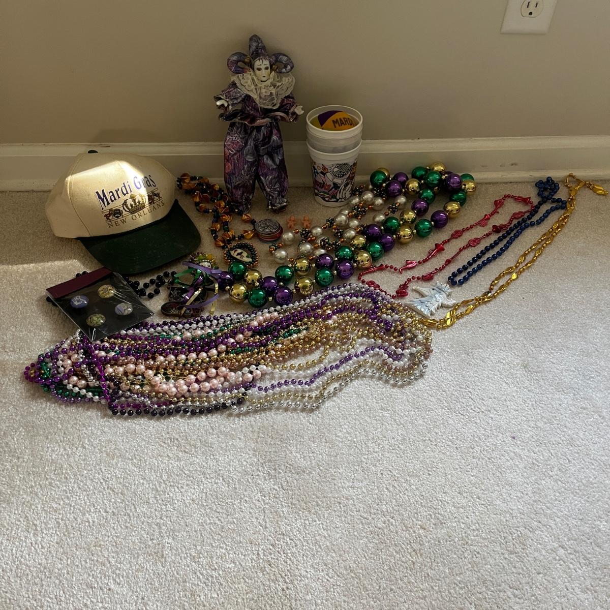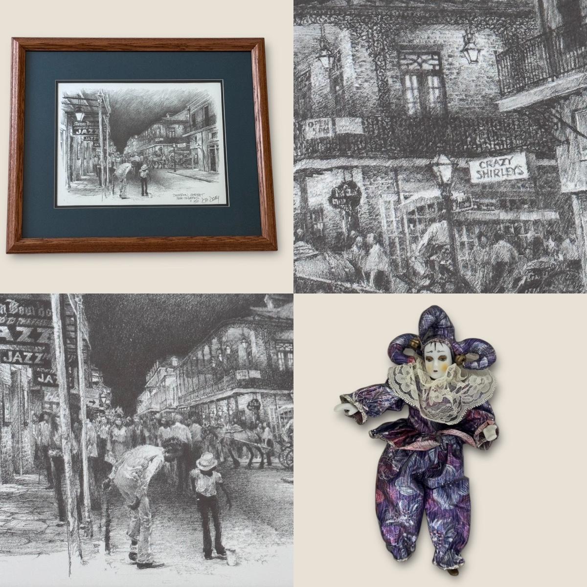 Lot includes one framed print of Bourbon Street, New Orleans by Don Davey. It is protected with glass, a double matting, and a wooden frame. It also includes one vintage Mardi Gras hat, one porcelain face jester doll, ten metal tokens, four plastic cups, four pack of magnets and a collection of metal beads. Doll measures 6” x 3” x 11”H and the frame measures 18” x 15”H. Hat could use a cleaning.