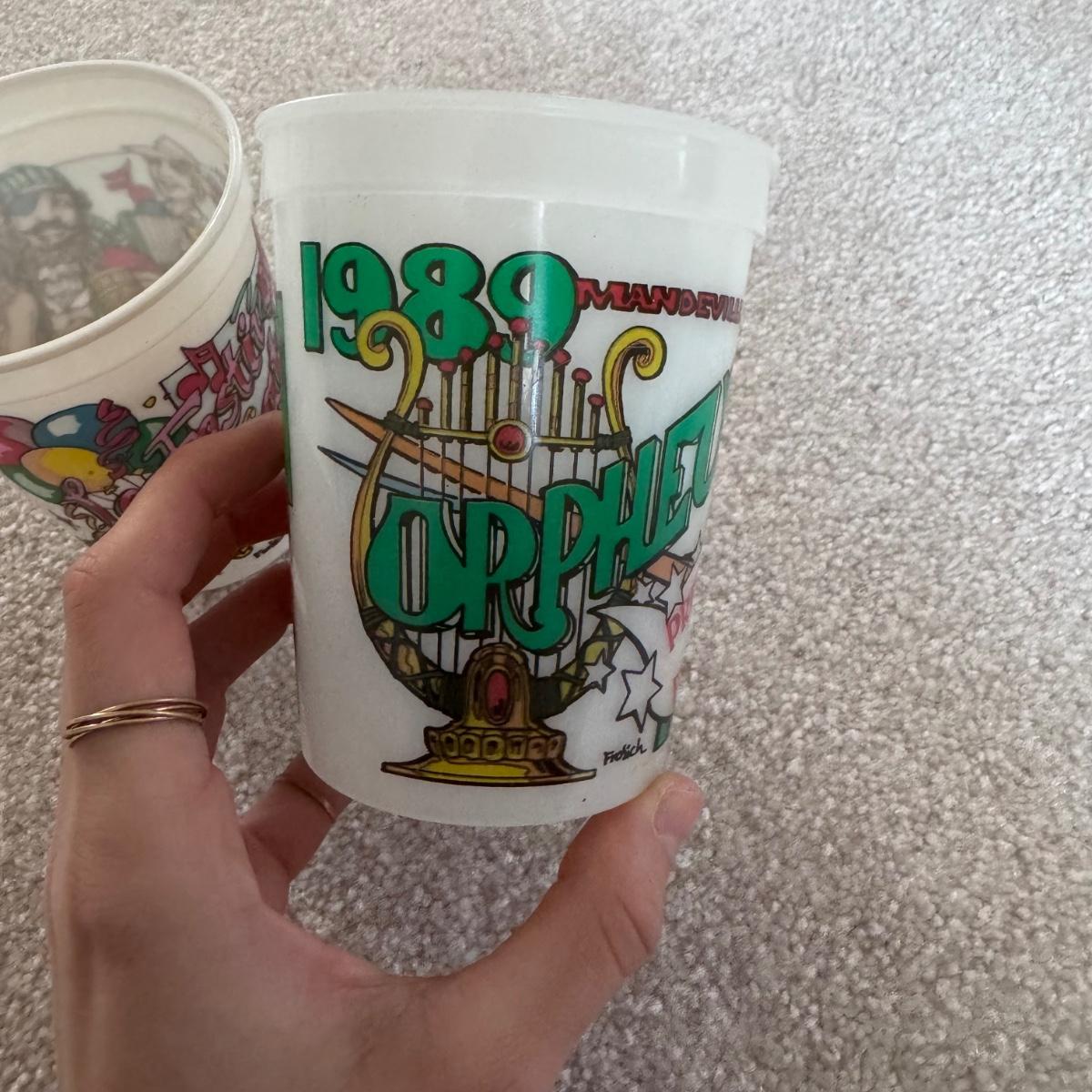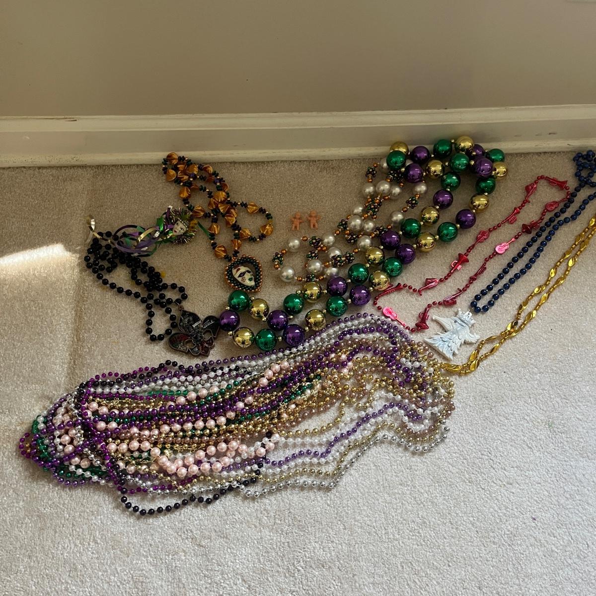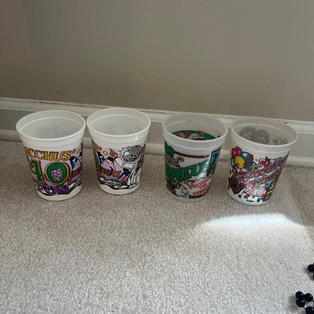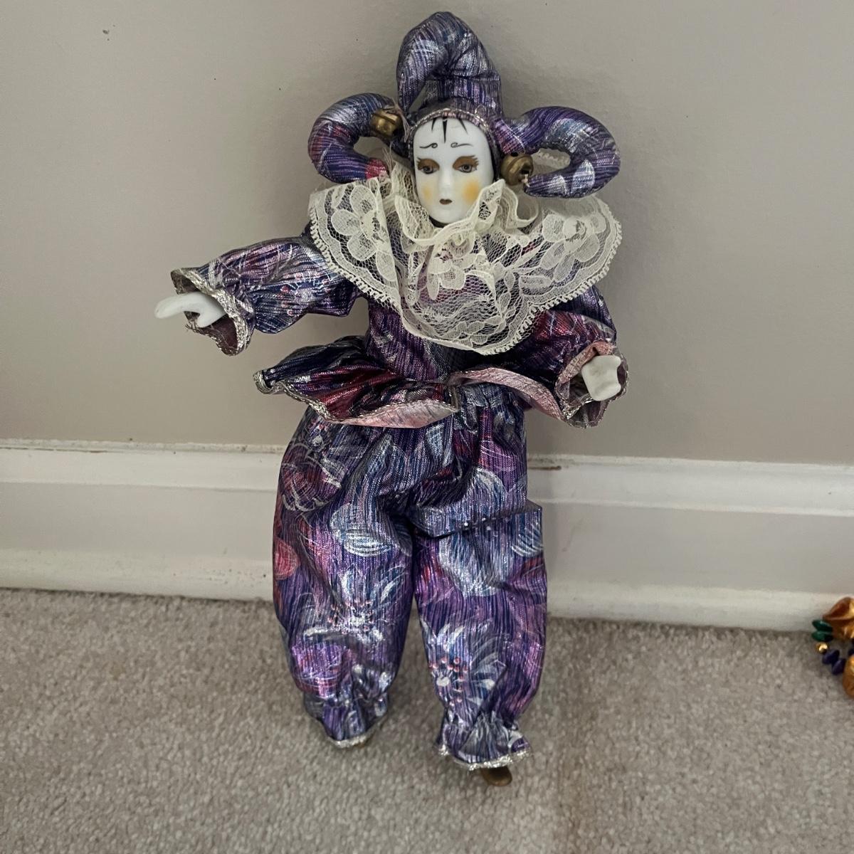 Lot includes one framed print of Bourbon Street, New Orleans by Don Davey. It is protected with glass, a double matting, and a wooden frame. It also includes one vintage Mardi Gras hat, one porcelain face jester doll, ten metal tokens, four plastic cups, four pack of magnets and a collection of metal beads. Doll measures 6” x 3” x 11”H and the frame measures 18” x 15”H. Hat could use a cleaning.