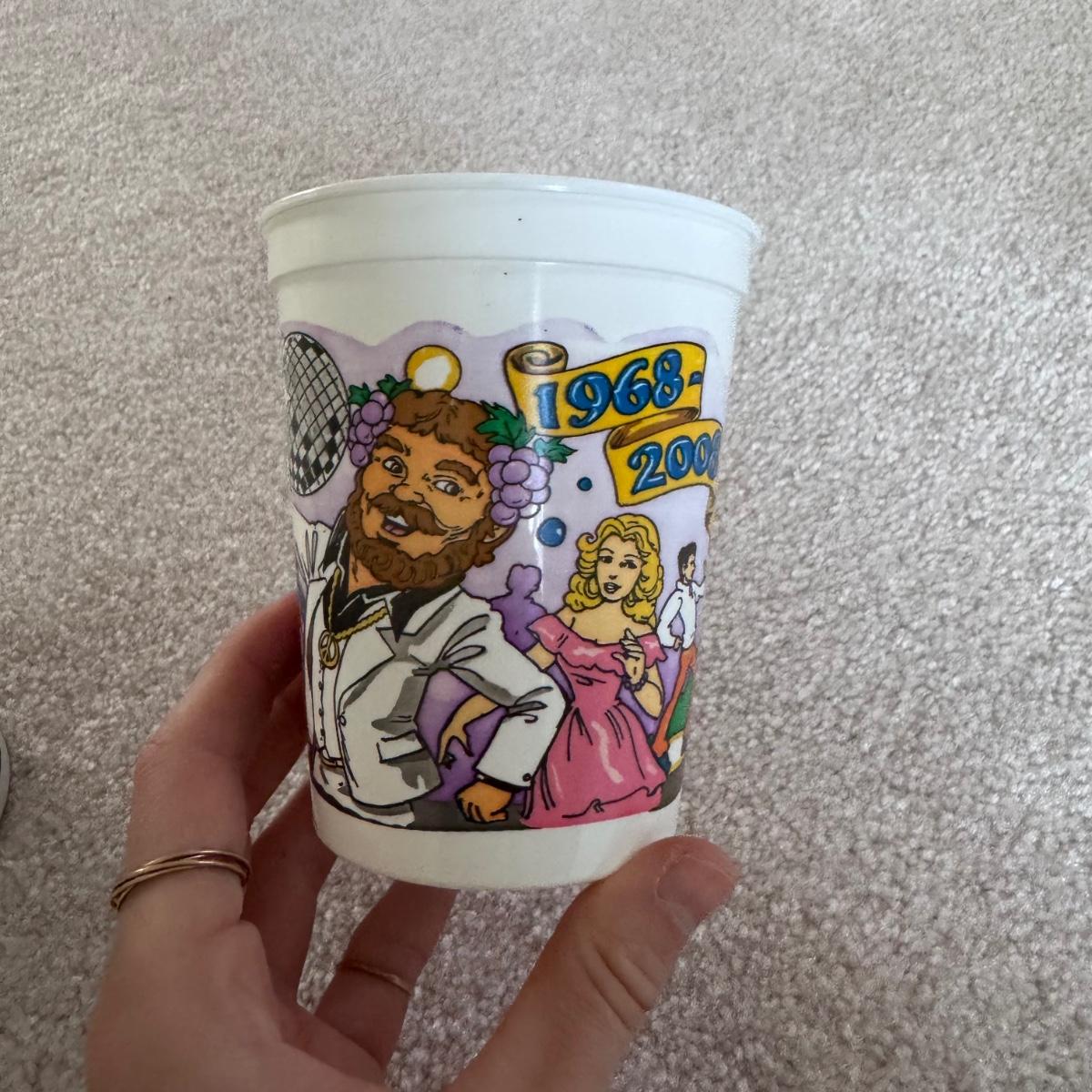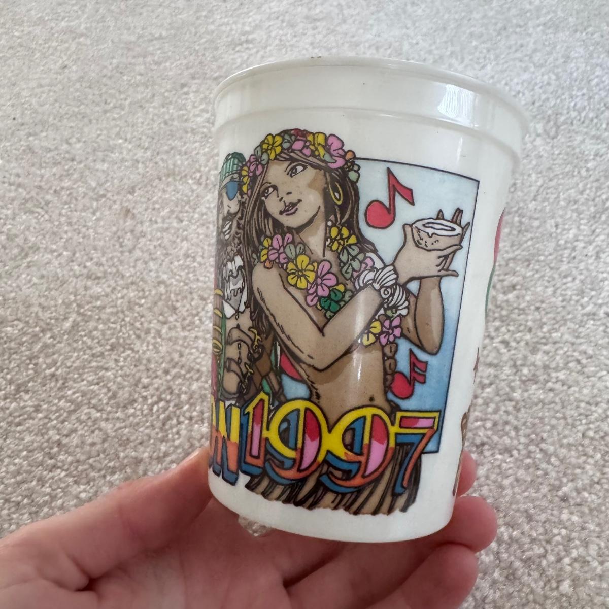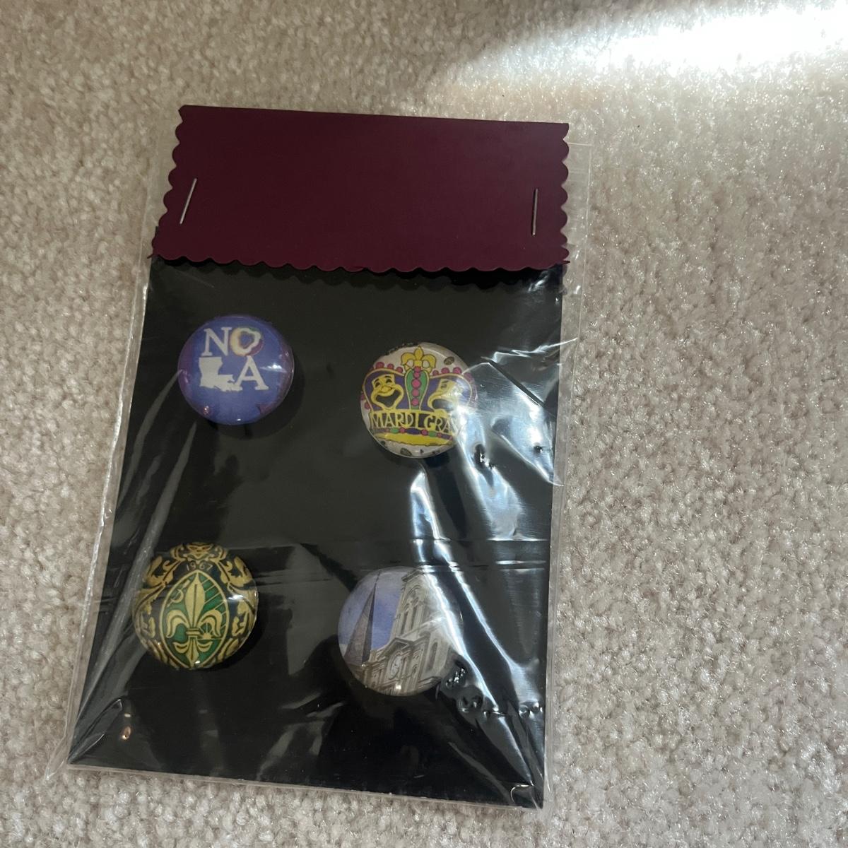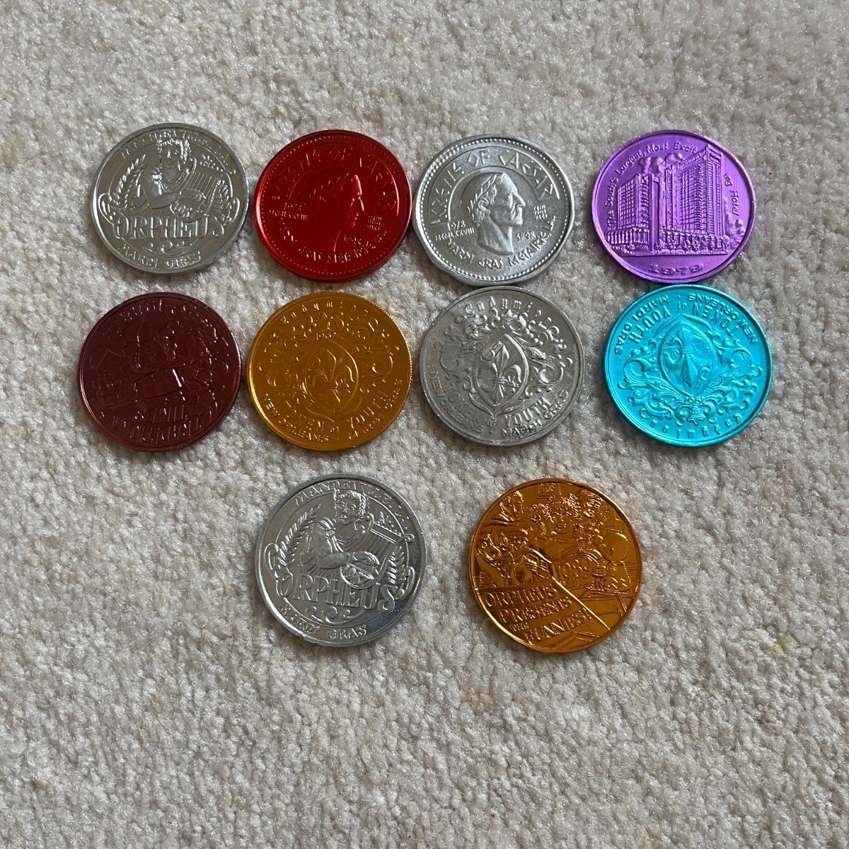 Lot includes one framed print of Bourbon Street, New Orleans by Don Davey. It is protected with glass, a double matting, and a wooden frame. It also includes one vintage Mardi Gras hat, one porcelain face jester doll, ten metal tokens, four plastic cups, four pack of magnets and a collection of metal beads. Doll measures 6” x 3” x 11”H and the frame measures 18” x 15”H. Hat could use a cleaning.