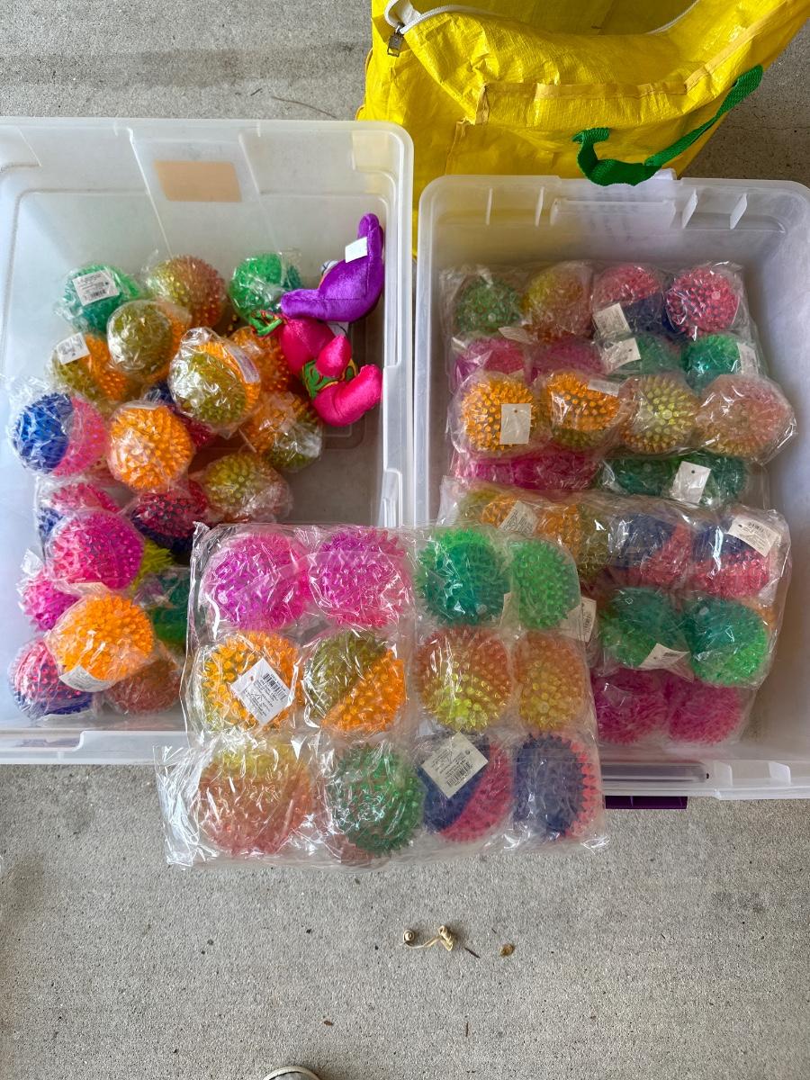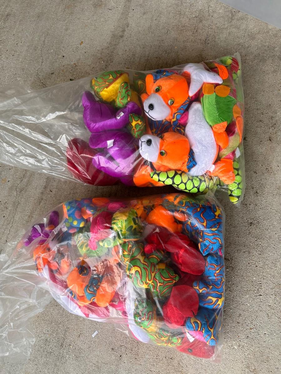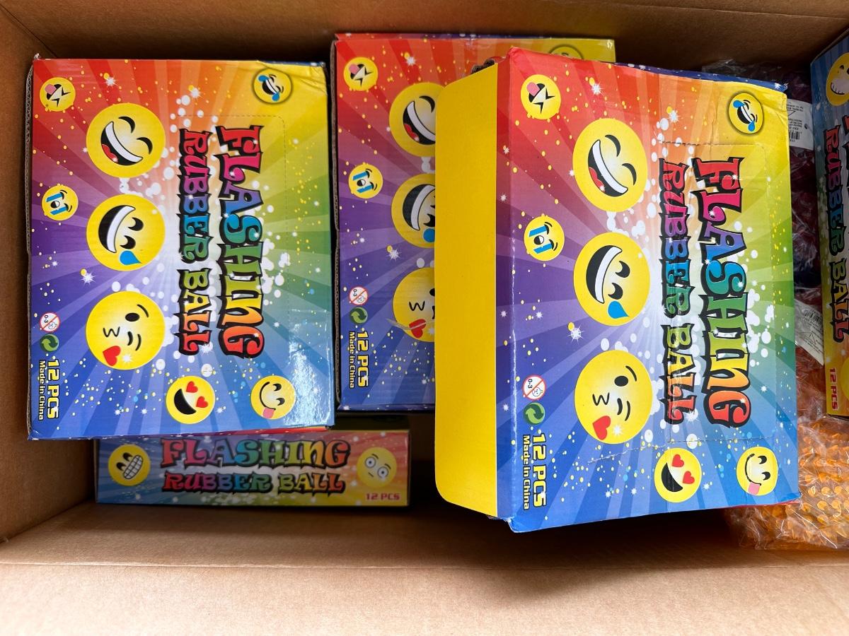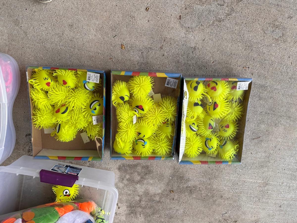 8 bags of beads that contain 5 Dozen Beads ~ 4 boxes of rubber balls~ 3 boxes of emoji rubber balls ~ 4 bags plus some loose spiky balls ~ assorted plastic swords ~ 3 bags of stuffed animals.