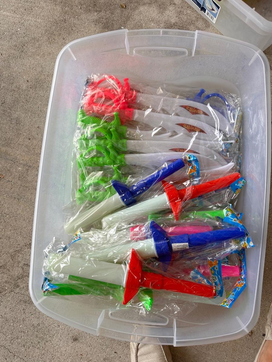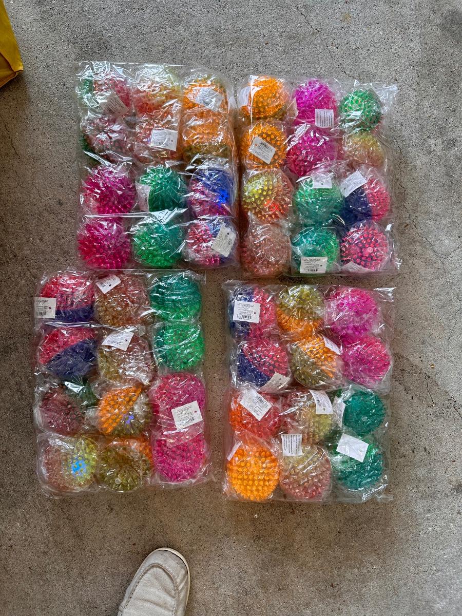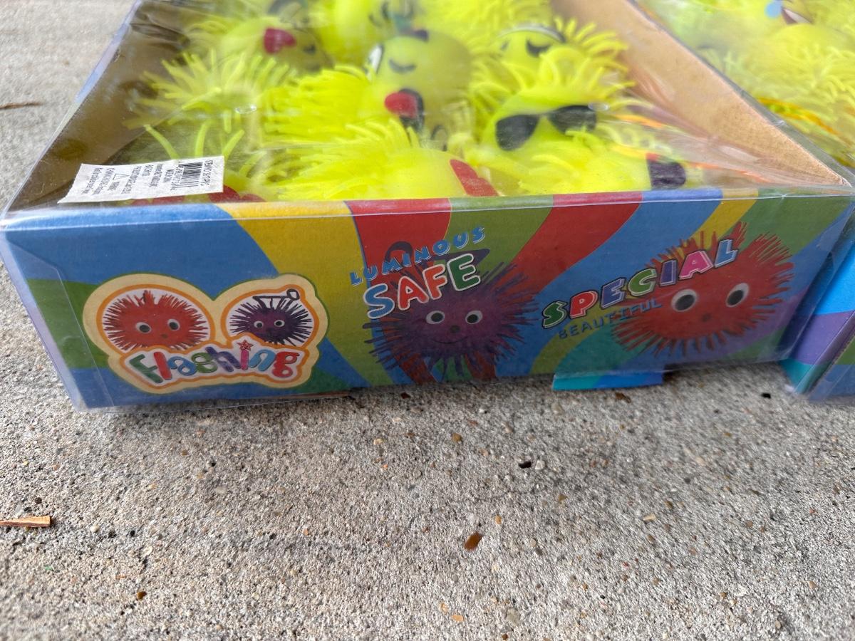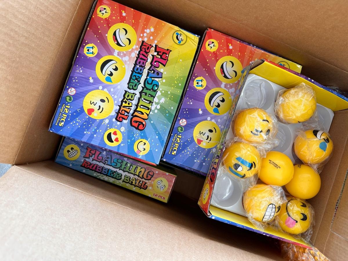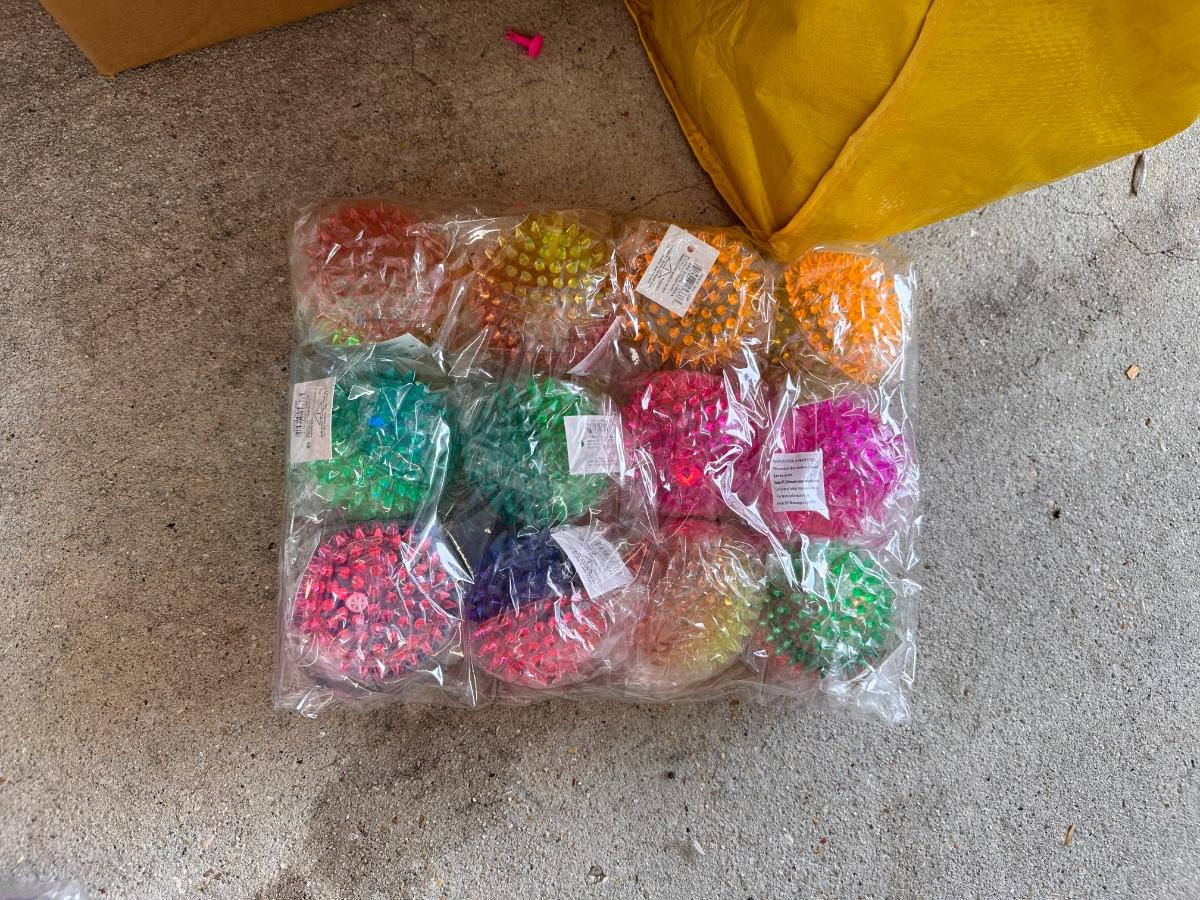 8 bags of beads that contain 5 Dozen Beads ~ 4 boxes of rubber balls~ 3 boxes of emoji rubber balls ~ 4 bags plus some loose spiky balls ~ assorted plastic swords ~ 3 bags of stuffed animals.