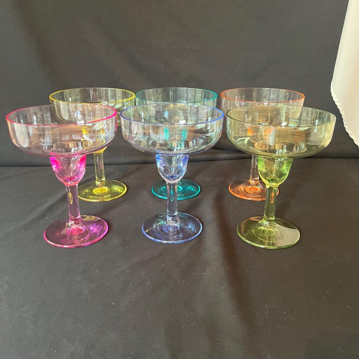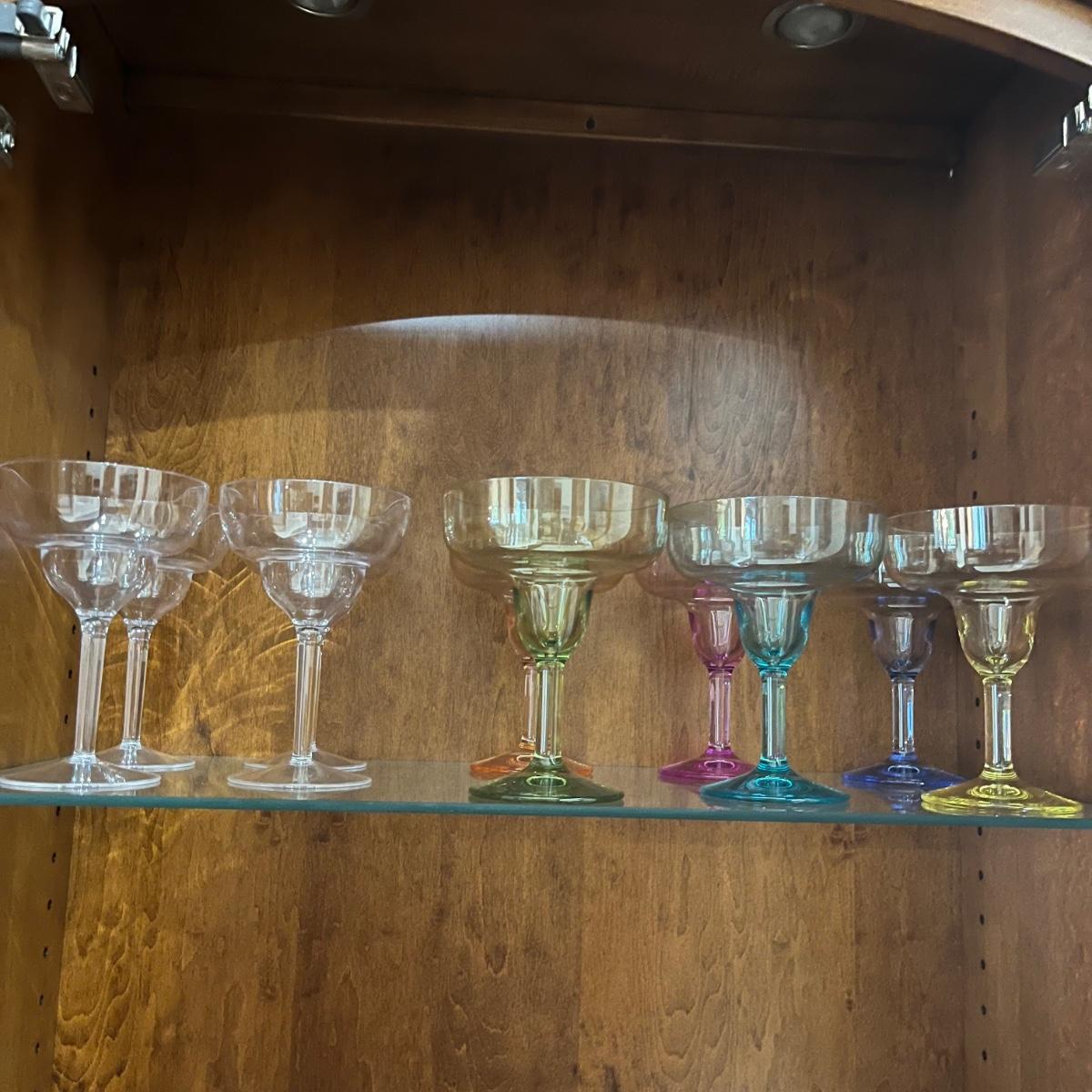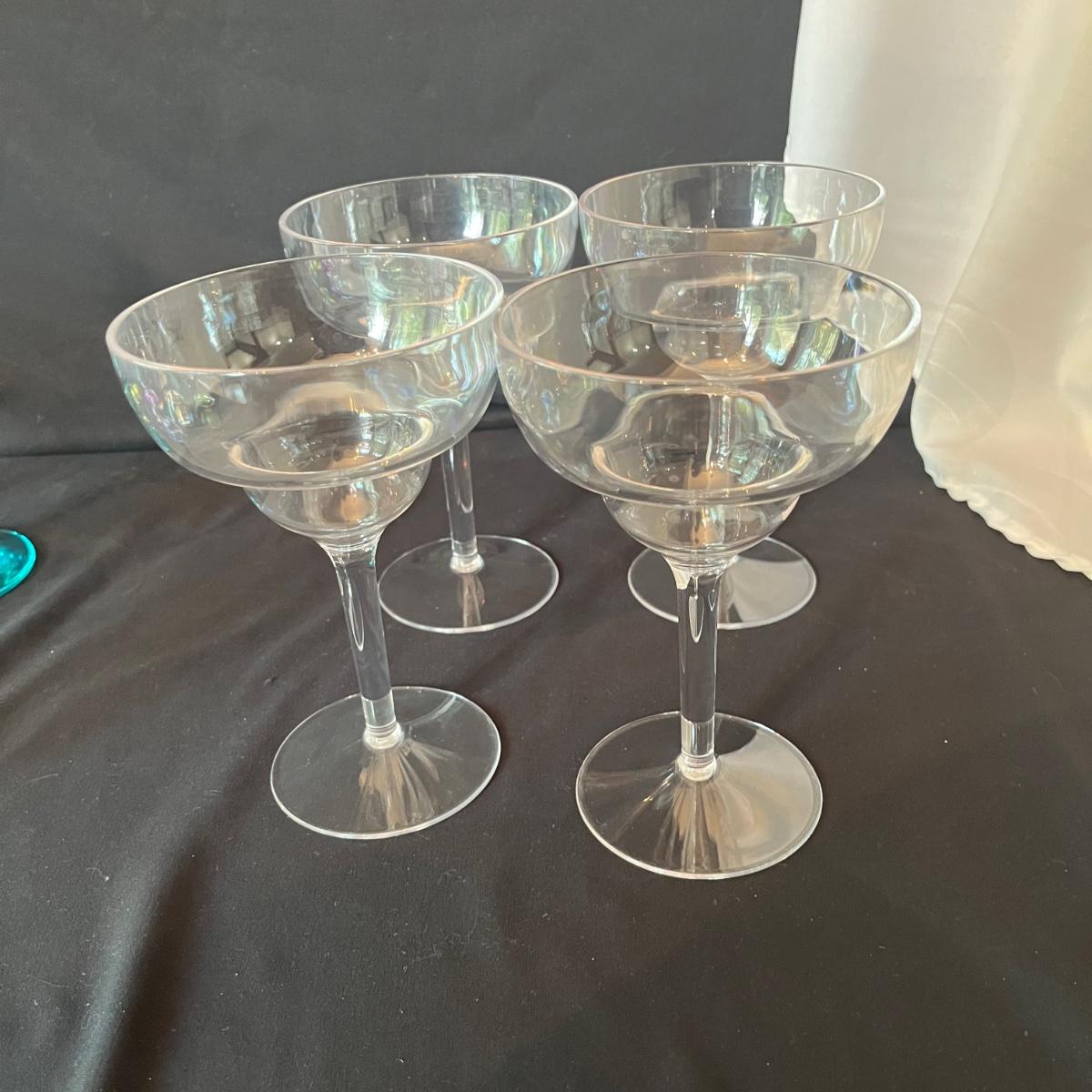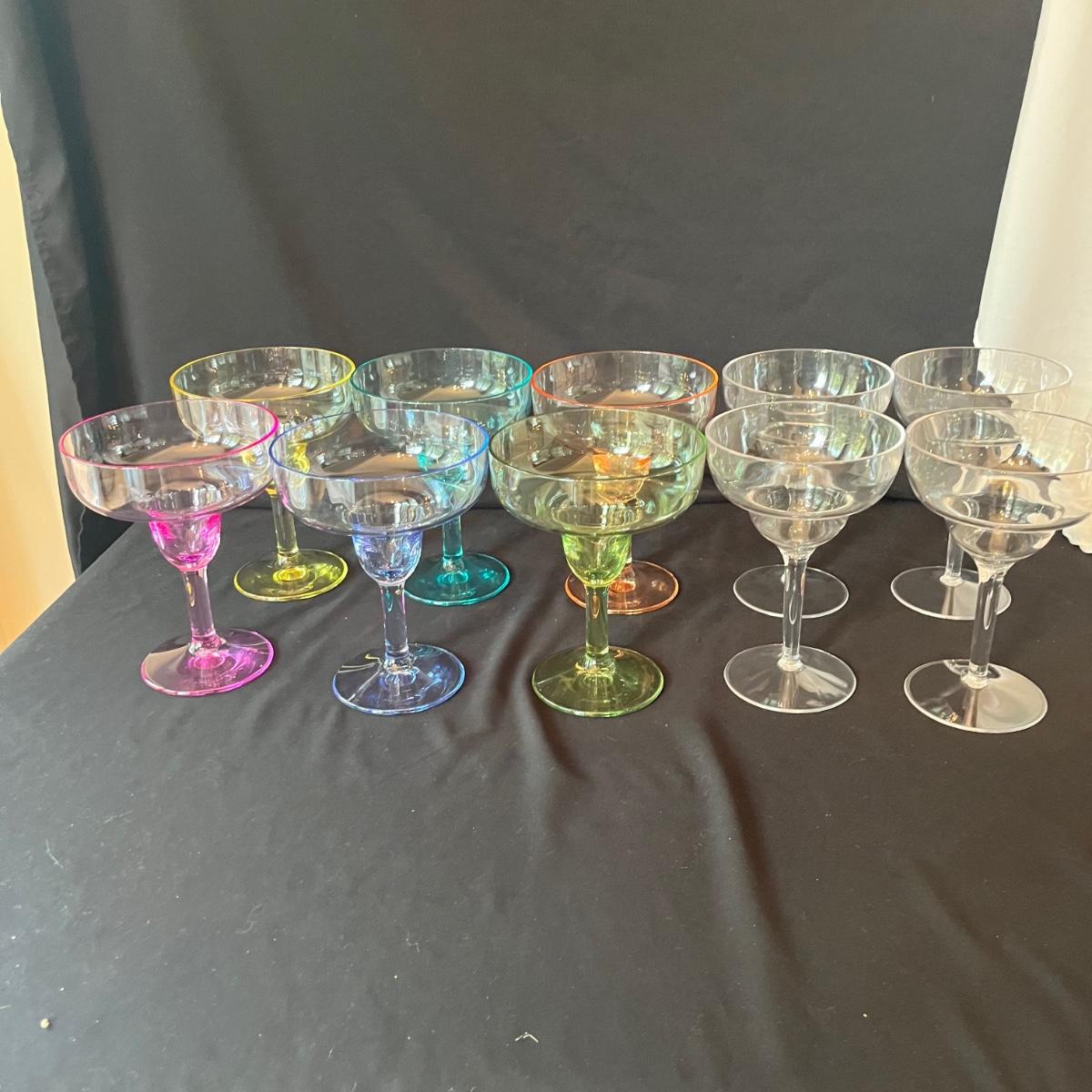 Lot includes ten plastic margarita glasses; six are colored and four are clear. Lot also includes a melamine like large floral tray that measures 20.5” x 15.5” x 2”H.