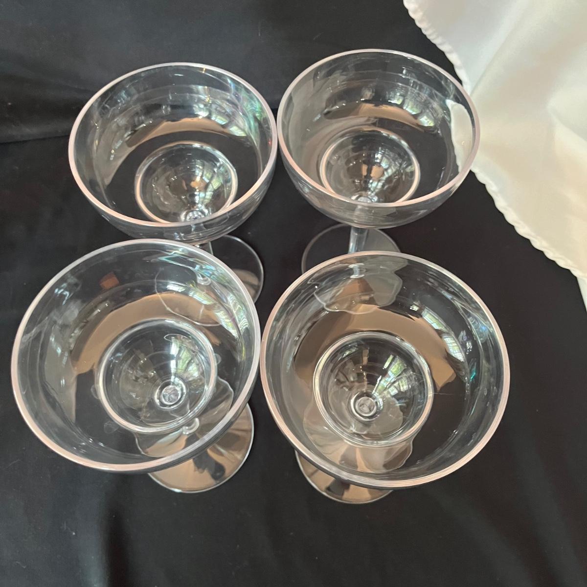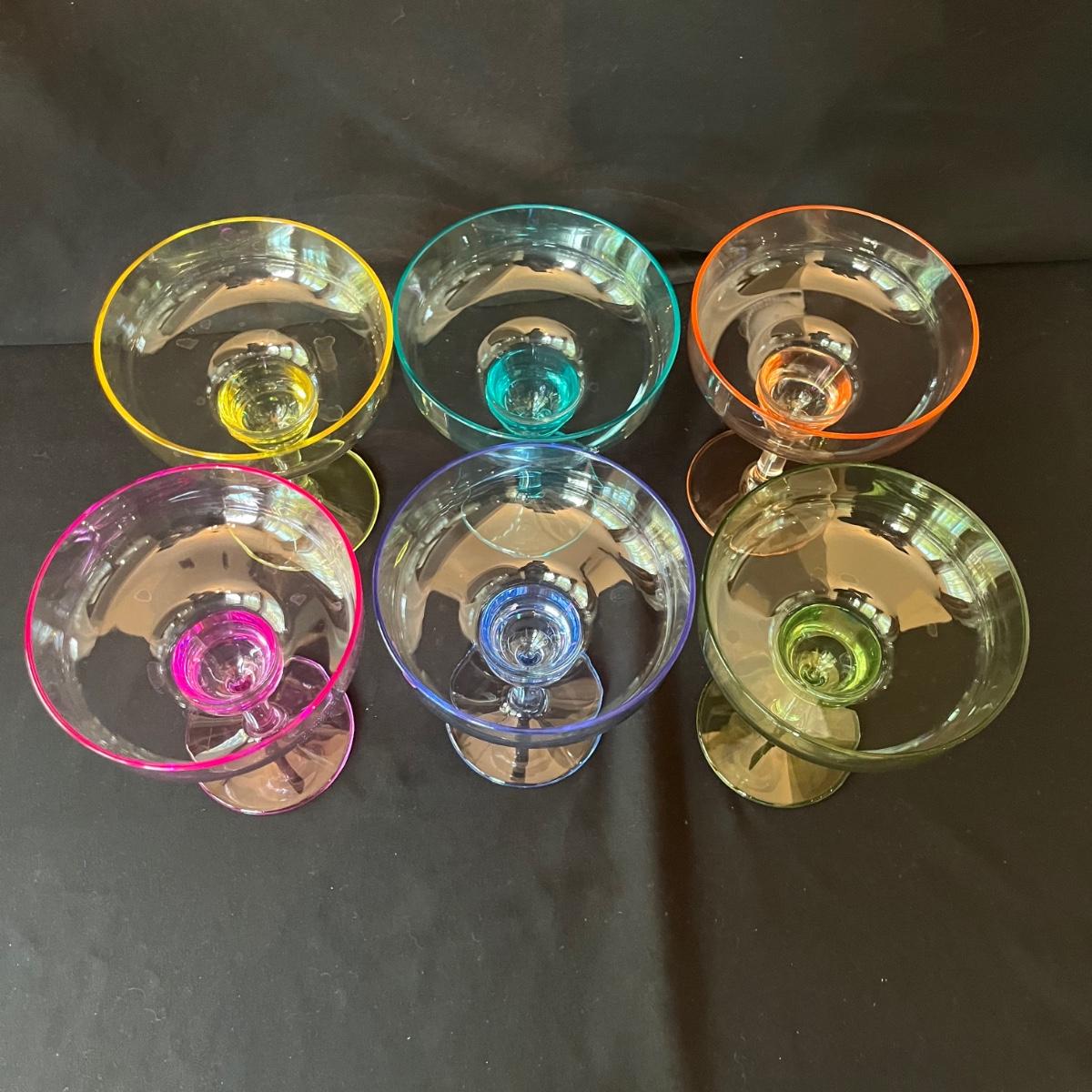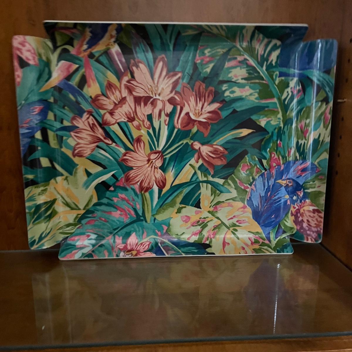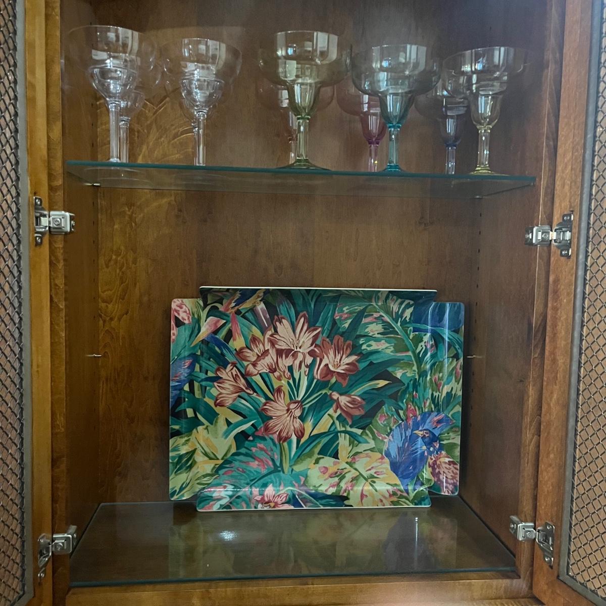 Lot includes ten plastic margarita glasses; six are colored and four are clear. Lot also includes a melamine like large floral tray that measures 20.5” x 15.5” x 2”H.