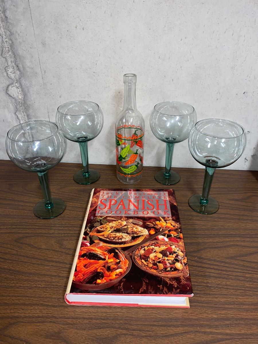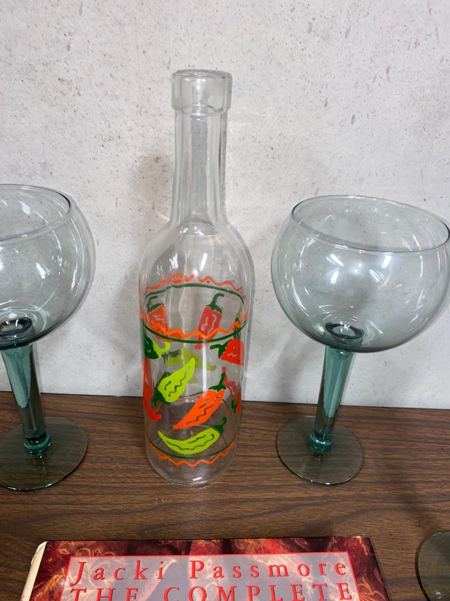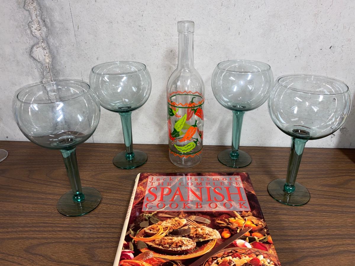 MARGARITA GLASSES, SPANISH COOKBOOK, AND DECORATIVE PEPPER BOTTLE