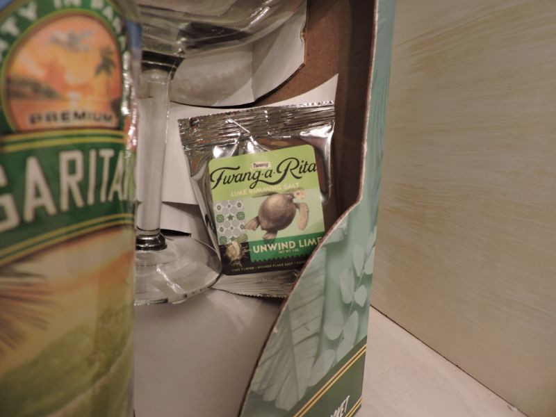 Gift set box includes 2 margarita glasses, margarita mix, and one salt packet.