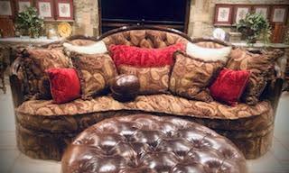 116" x 59" D x 46 1/2" H. Seat Height 20". Deep seating, feather pillows. Beautiful & elegant in any setting. EJ Victor fabrics, Marge Carson leather and German nail heads. $3000 in EJ Victor Fabrics and $1400 in Marge Carson leather. Retail $15,400.