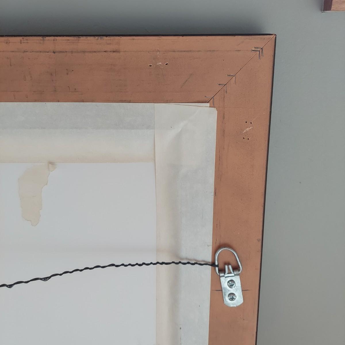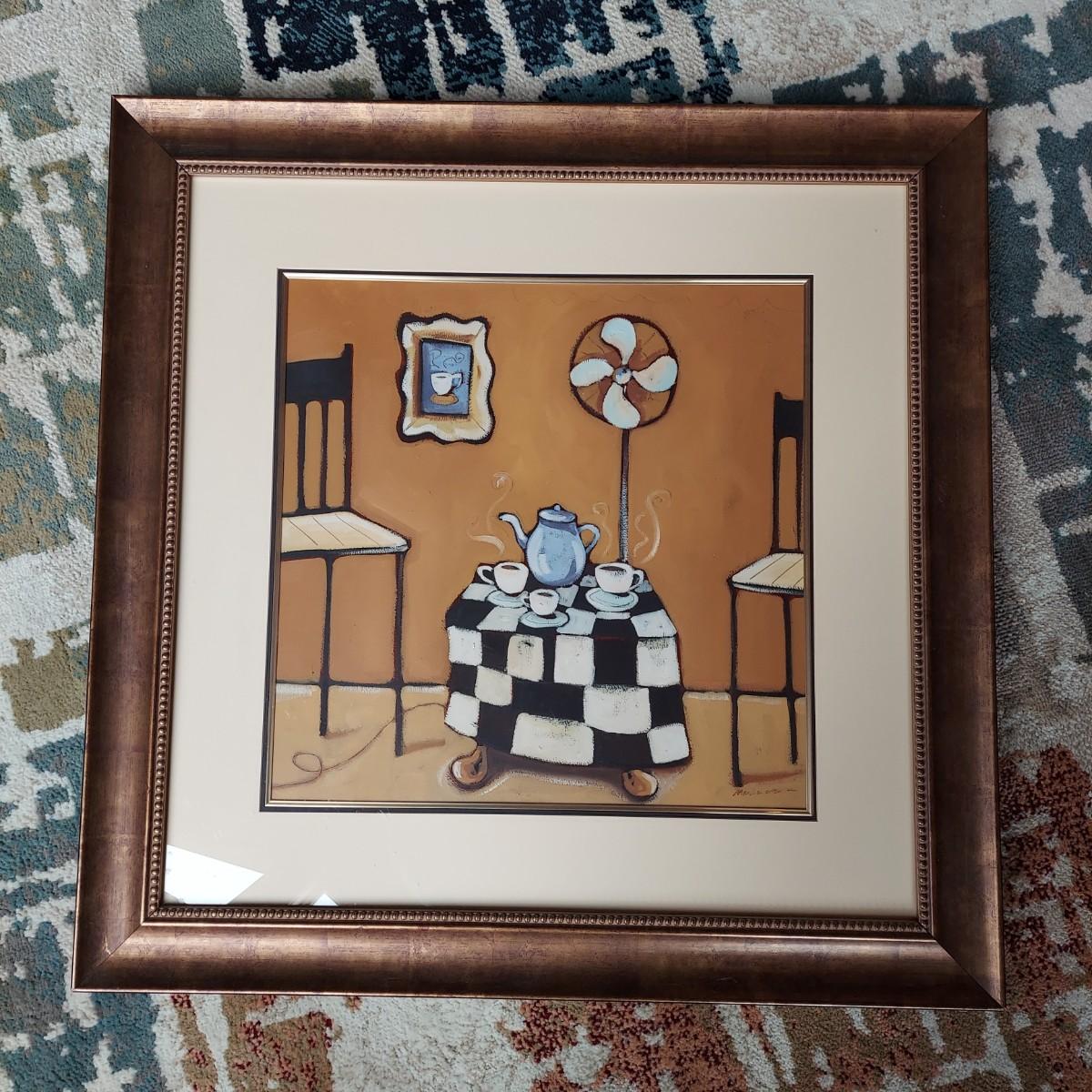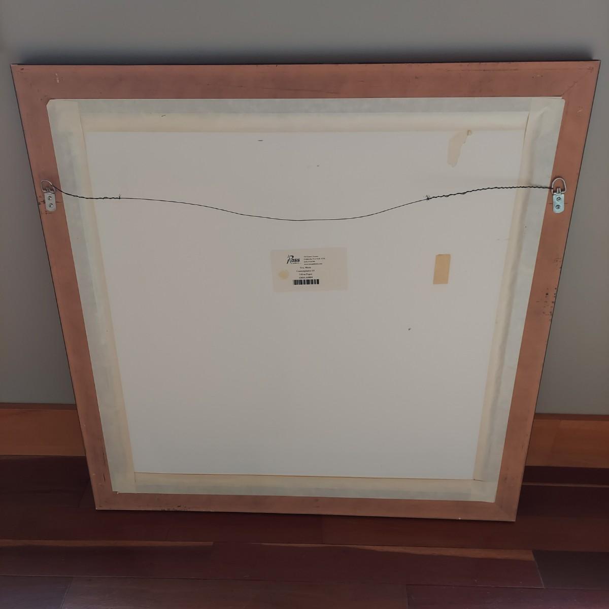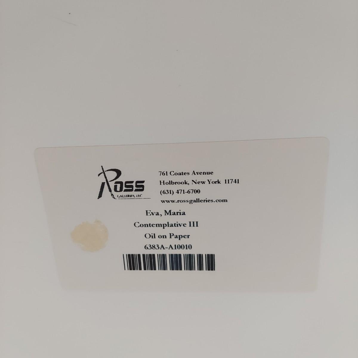 Large framed original cafe style art by Maria Eva. Tag states that it's Contemplative III oil on paper framed and sold by Ross Galleries, LLC. Measures 33.5" square and 1.5" deep. Shipping available. Shipping art can be costly. We suggest contacting our preferred local shipping provider, Postage Express, with dimensions and getting an estimate before bidding: (828) 670-5501 or postageexpress@yahoo.com.