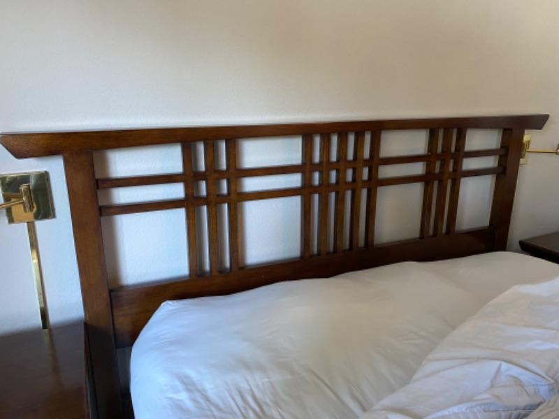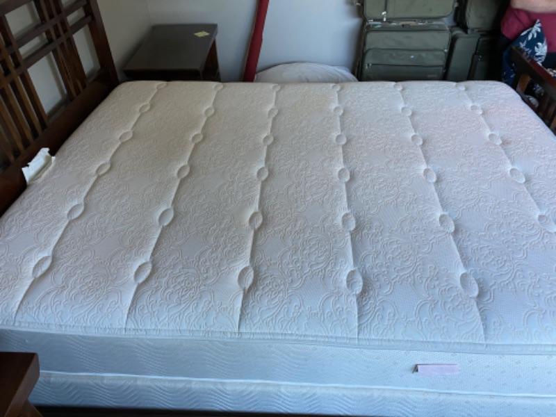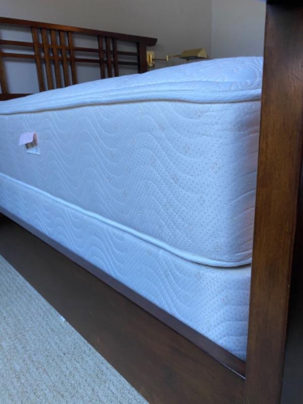 1990’s Queen bed frame designed by Maria Yee. Comes with Beauty Rest Mattress and box spring that are clean and in very good condition. Some wear on bed frame.