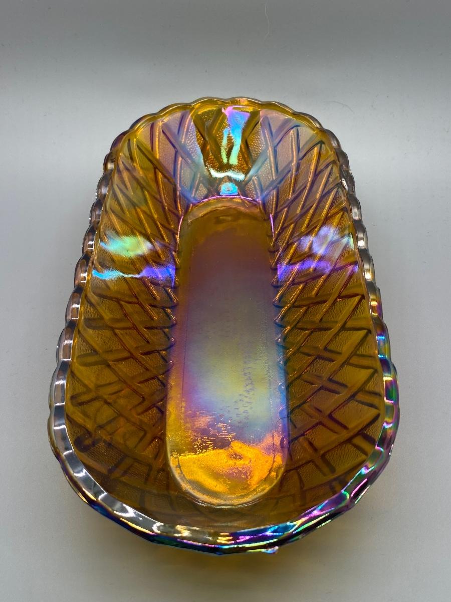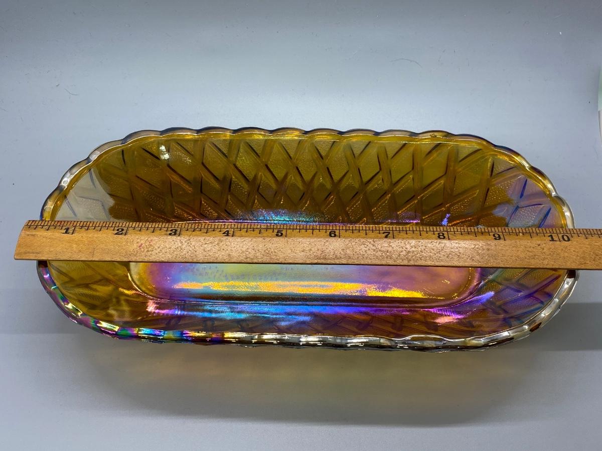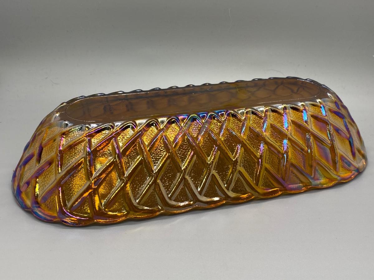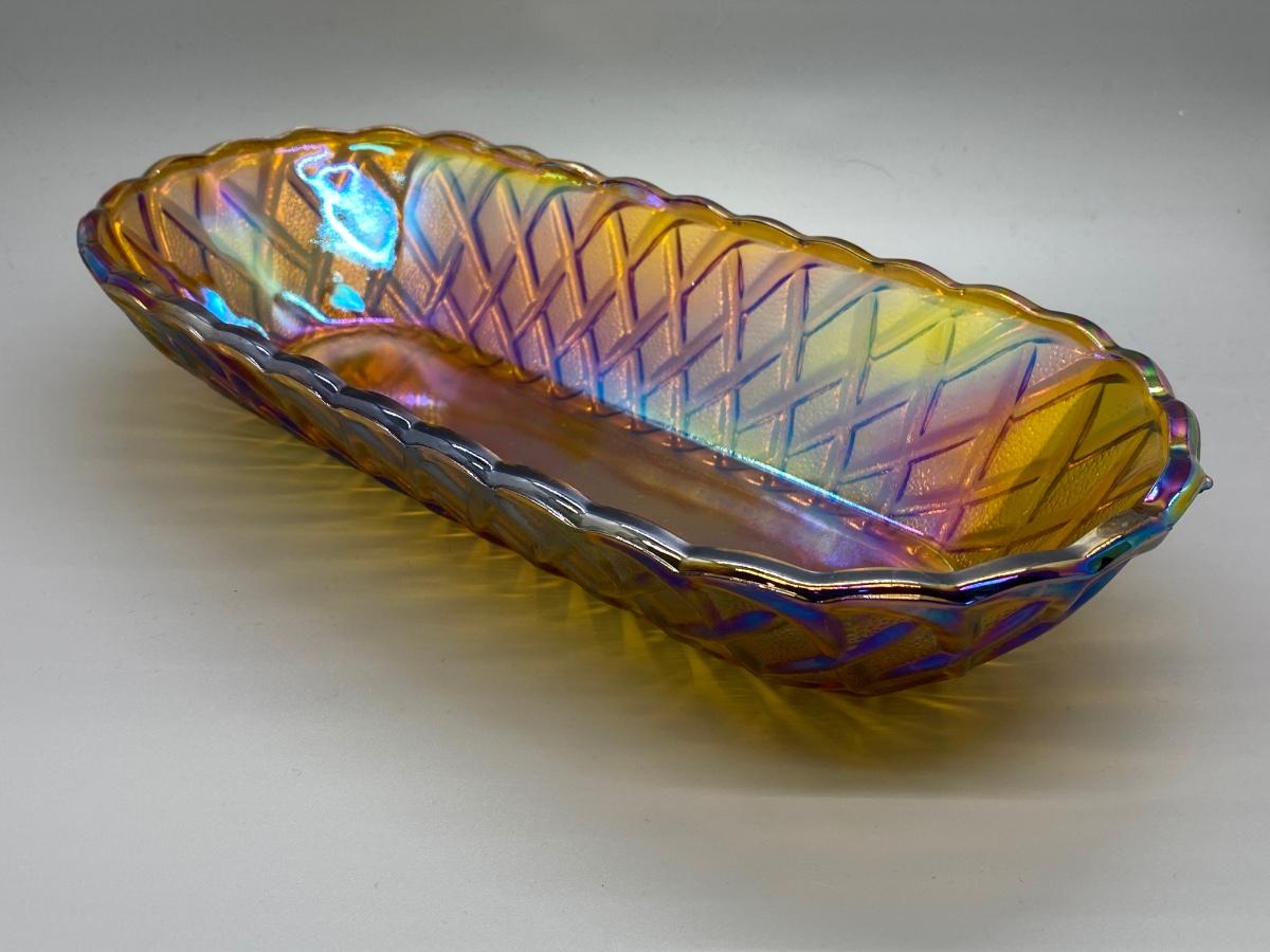 Basket Weave style carnival glass serving dish. Oblong shape. In good condition. About 12" size.