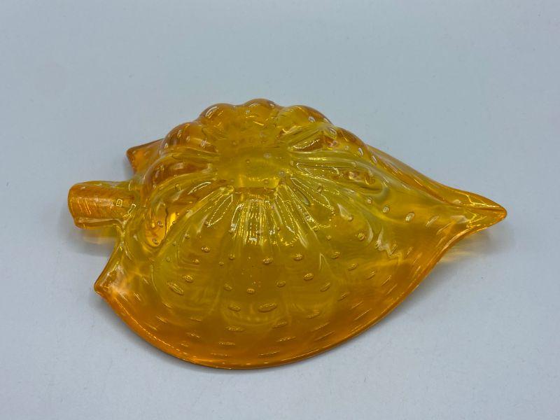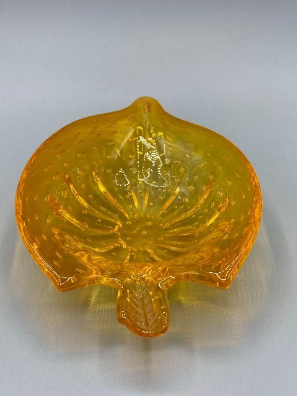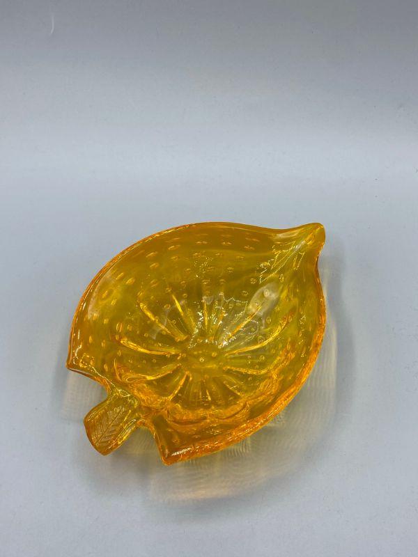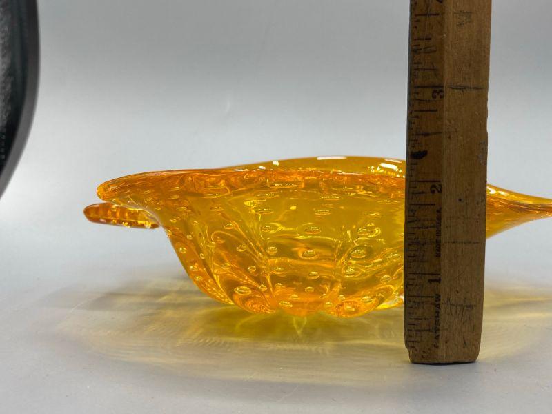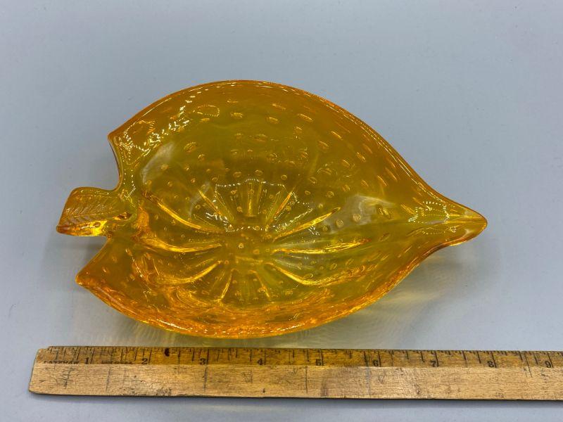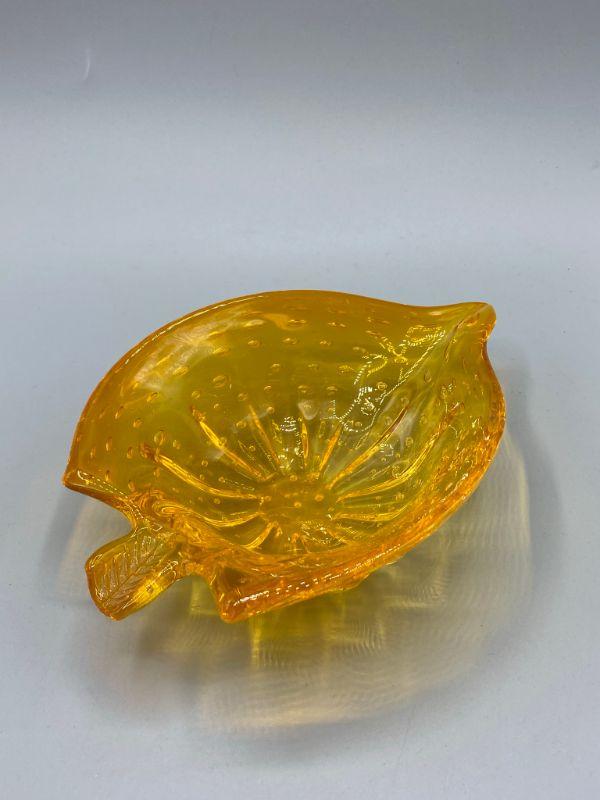 Vintage marigold yellow leaf shaped dish. Bubble glass dish I believe might be an ashtray would be great as a decor piece or a candy/nut dish. About 8" in length, it is shallow about 2" at the deepest spot. Great color. I did find a small chip along the bottom edge (last photo), not really noticeable unless you feel for it.