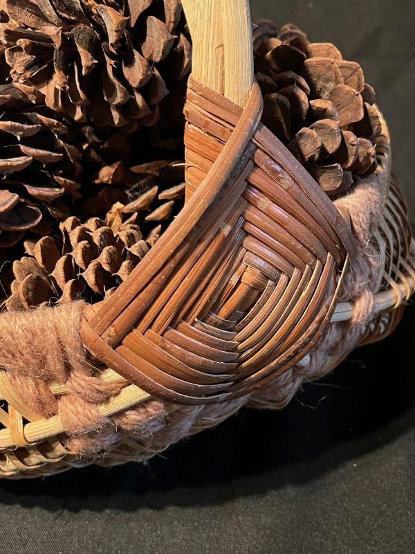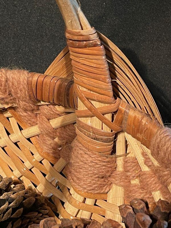 This is a handmade melon basket by Native American artisan Marilyn Bushyhead Kindsvatter. The sturdy fixed bale handle is attached to the body of the basket with a diamond-shaped shoulder and detailed with twisted wool fiber woven into and re-enforcing the body of the basket.