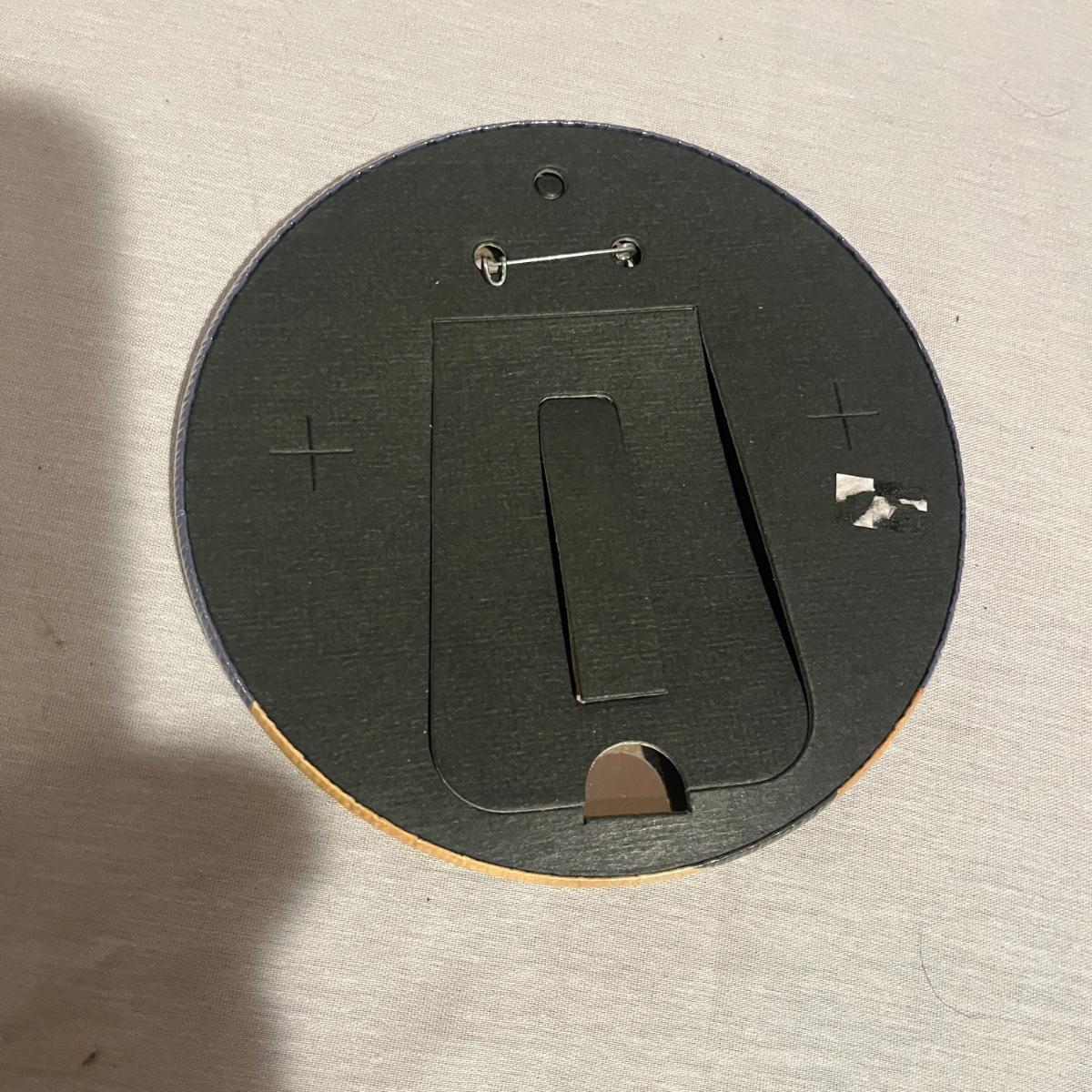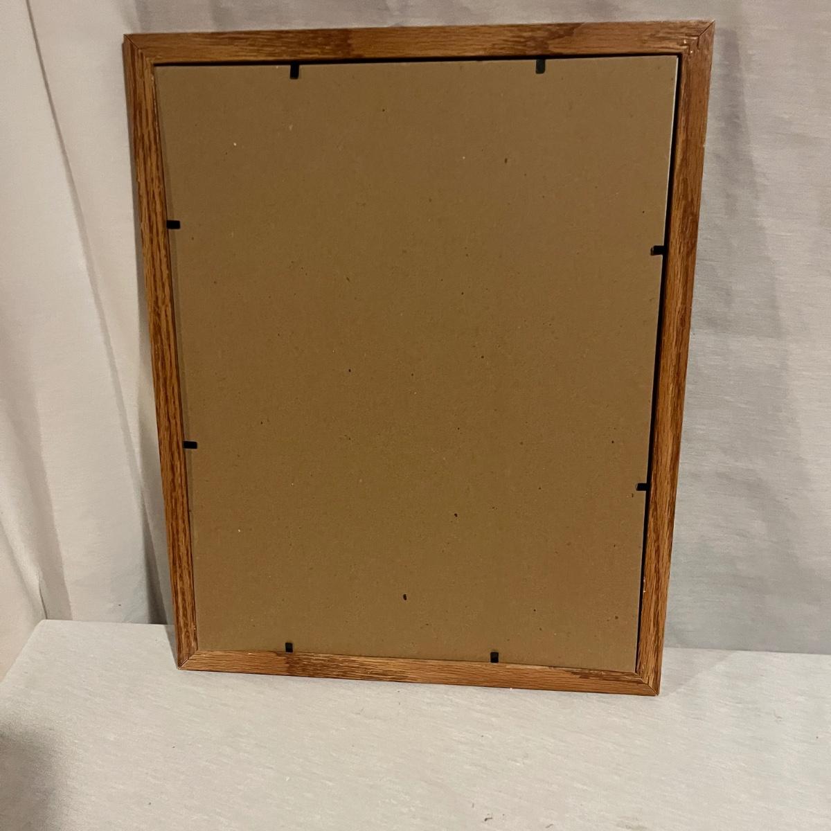 Lot includes wooden framed picture, six plastic ornaments, ceramic coffee cup, metal button, deck of cards, small metal box and Bradford numbered collectible. Frame measures 12.5” x 15.5”H.