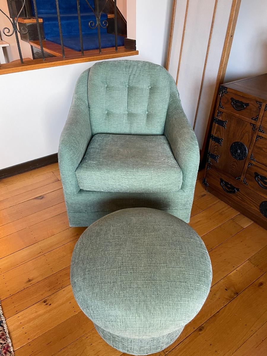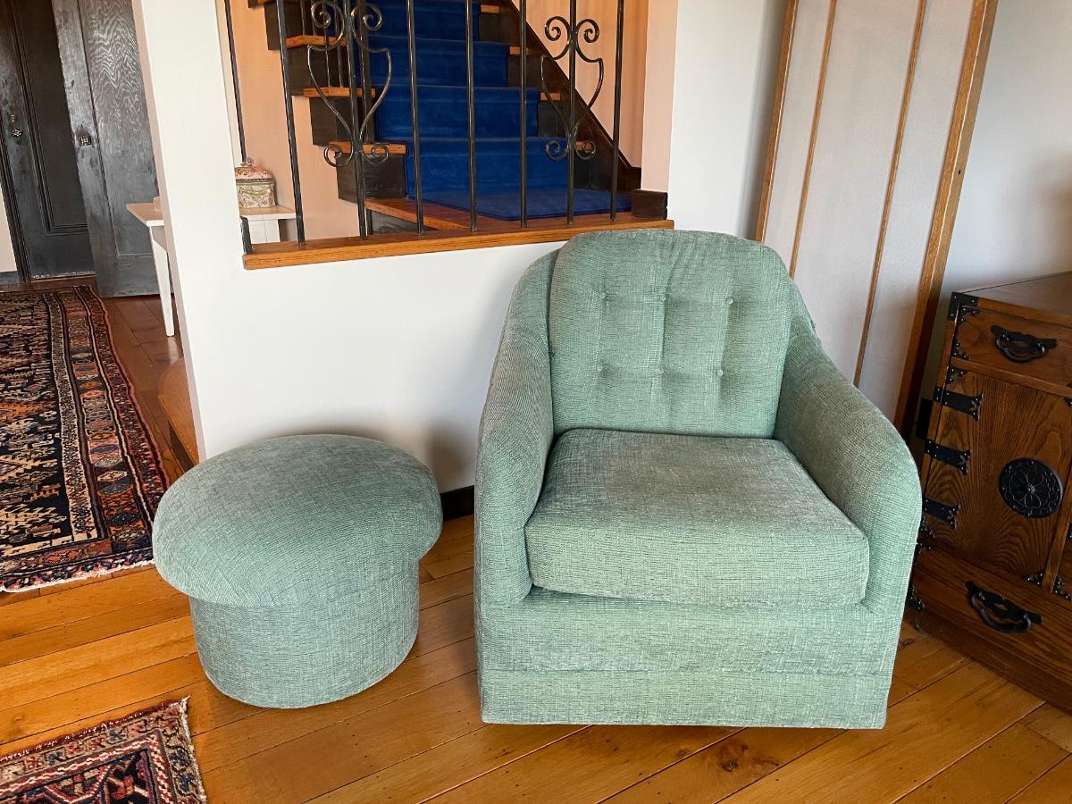 Marine green chair with mushroom ottoman. Sold as a set. Petite size chair originally used for bedrooms or small corners. No rip, tears, or stains . Excellent condition.