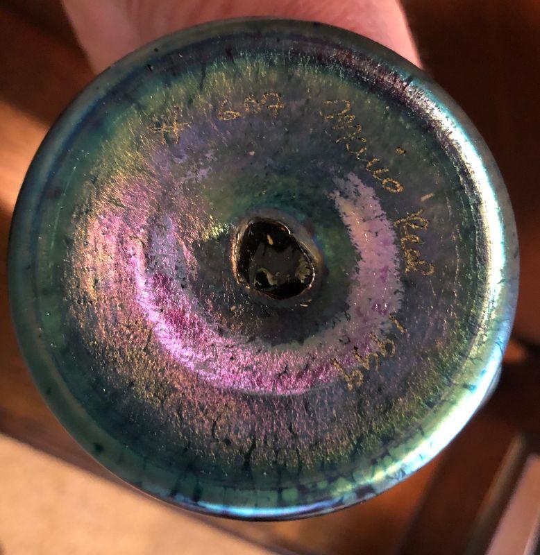 Beautiful dusty blue iridescent Jack in the Pulpit vase. 5.75” tall x 4.75” wide.