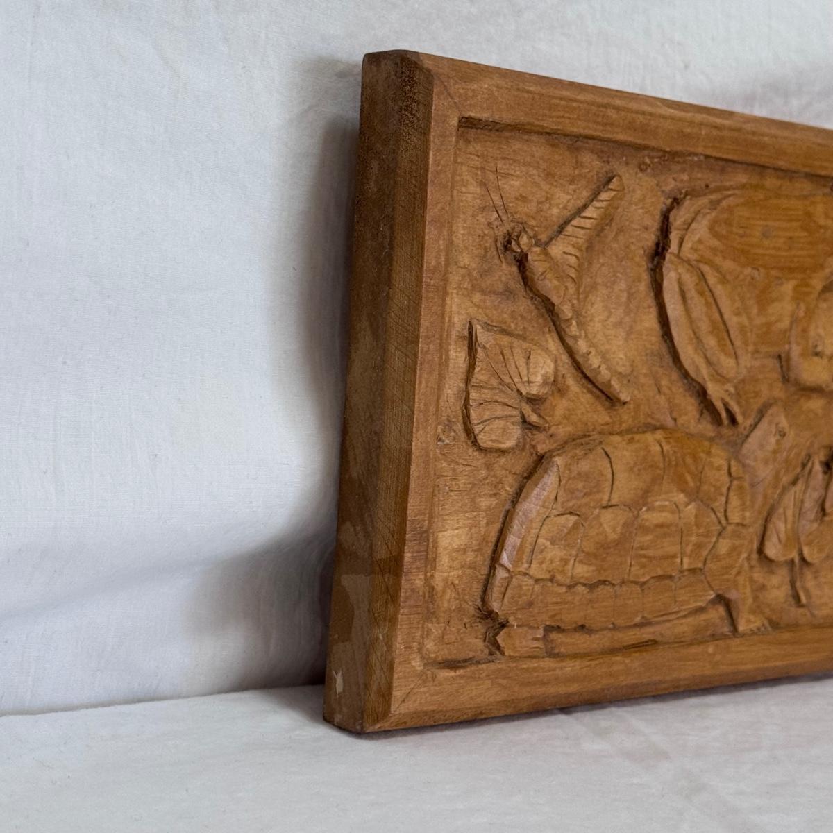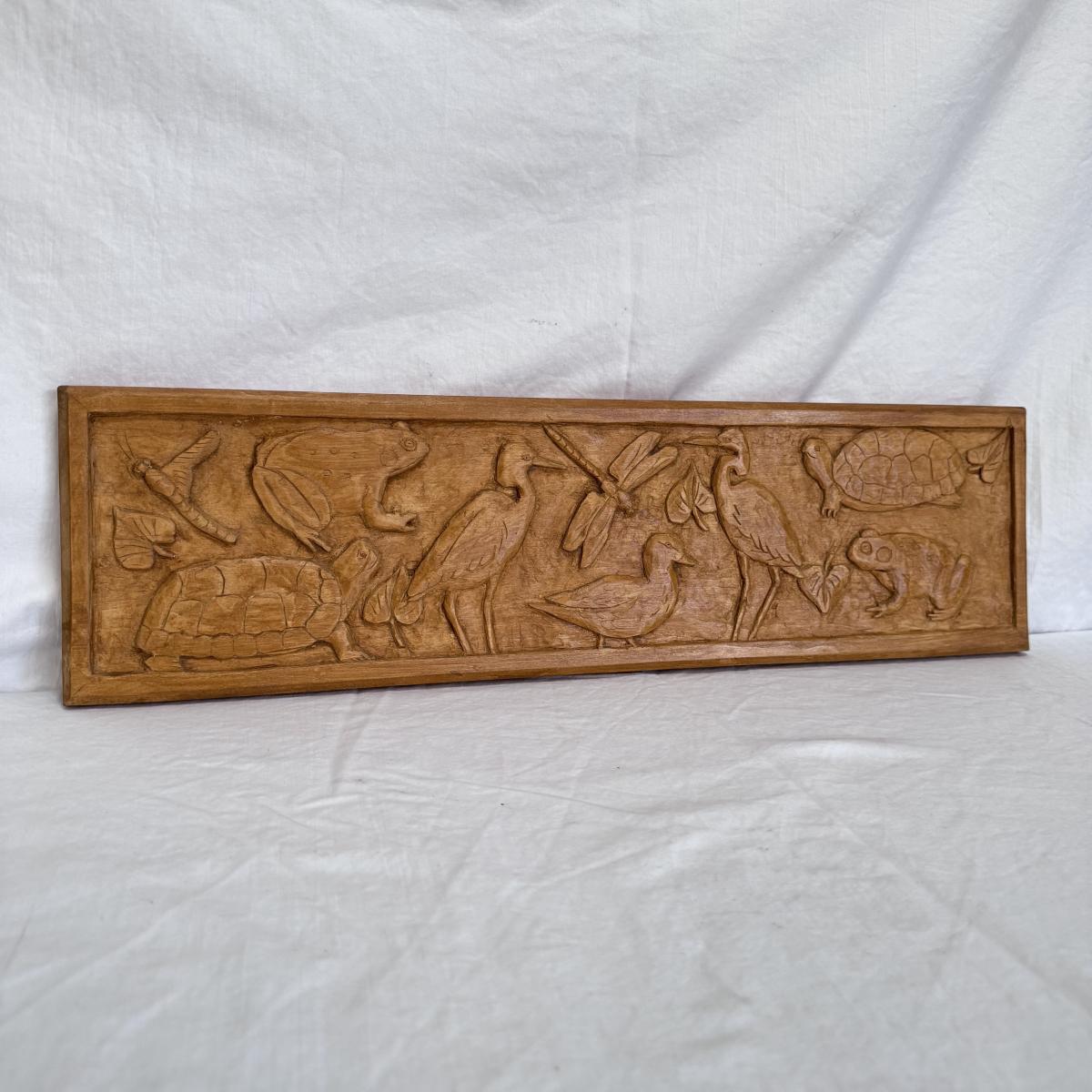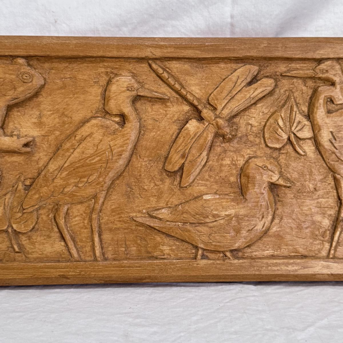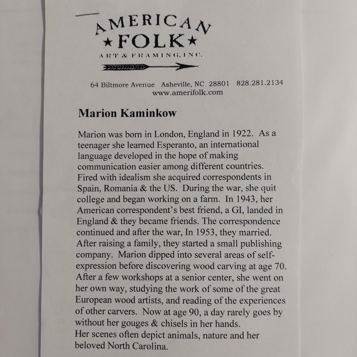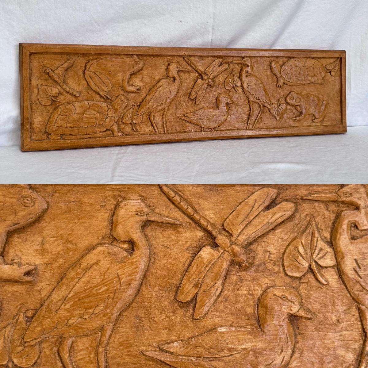 This lot includes one beautiful, rectangular wood carving depicting animals in North Carolina. The carving has a sawtooth hanger on the back for wall-hanging purposes. The carving measures 22” x 6”H. This piece appears to be "Pond Life" by Marion Kaminkow per information provided by the homeowner. It is signed in pen on the back. Shipping available. Shipping can be costly. We suggest contacting our preferred local shipping provider, Postage Express, with dimensions and getting an estimate before bidding: (828) 255-9250 or shipping@postageexpressnc.com.