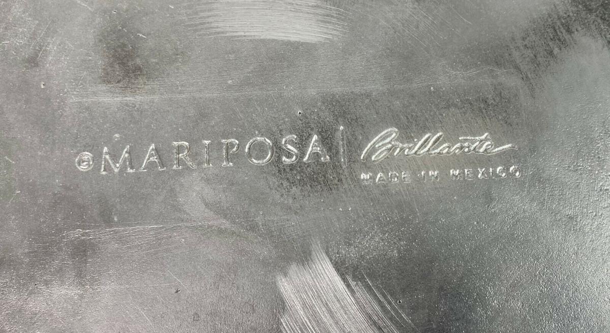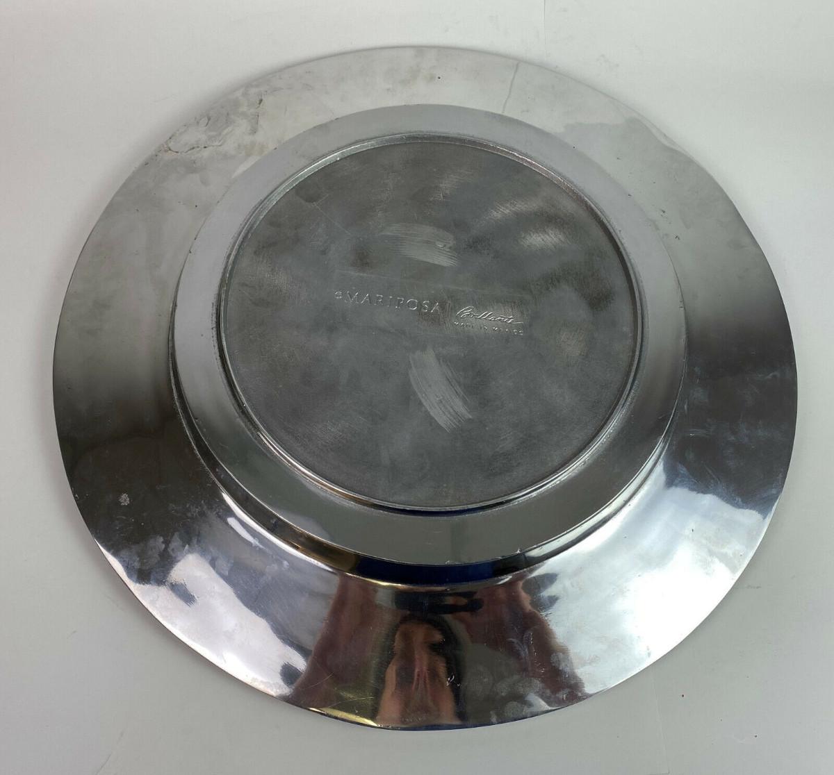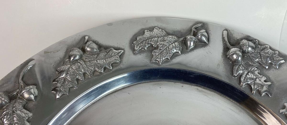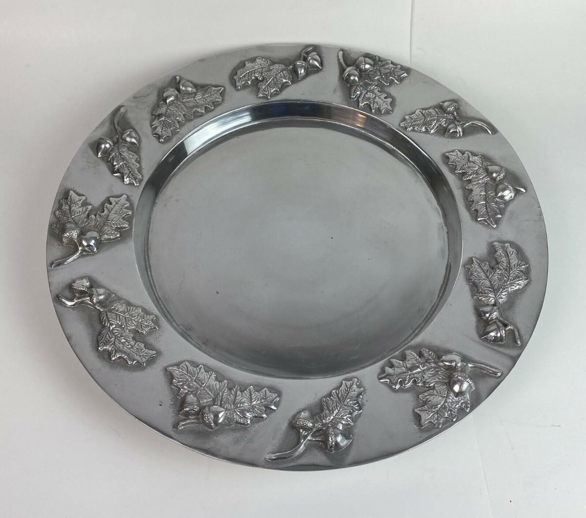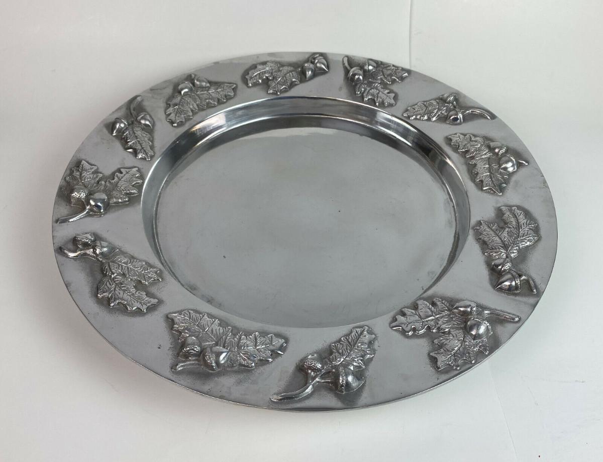 Handcrafted in Mexico of 100% recycled, buffed-until-brilliant aluminum...Rimmed with oak leaves and acorns here is a large round 19 inch serving platter..recessed center...Light use wear only on this older piece from the Mariposa Brillante line of tableware.