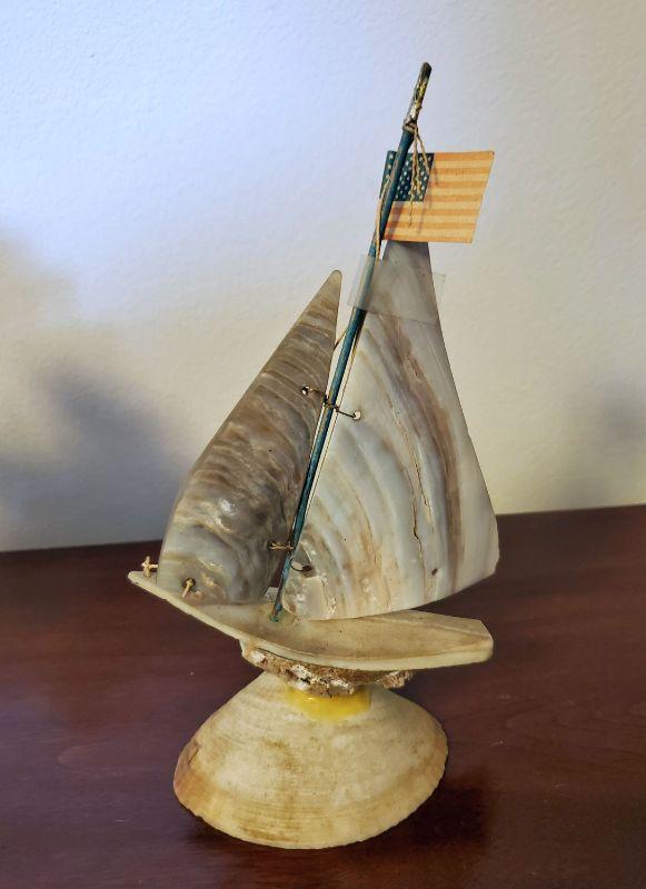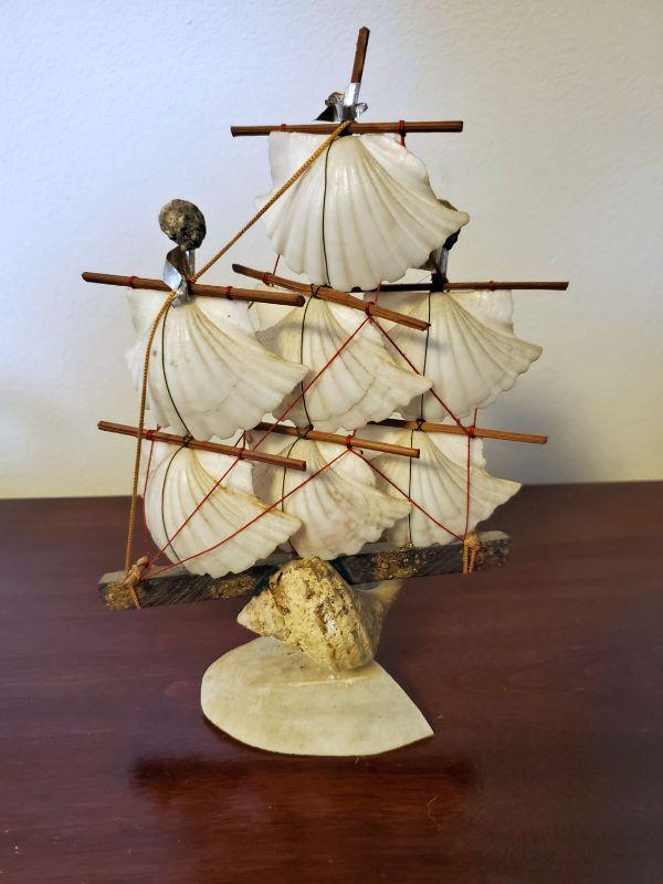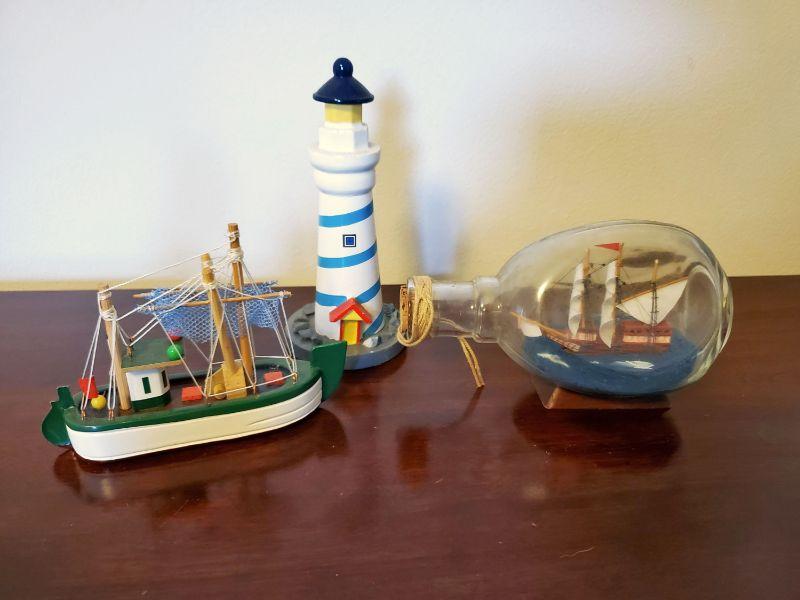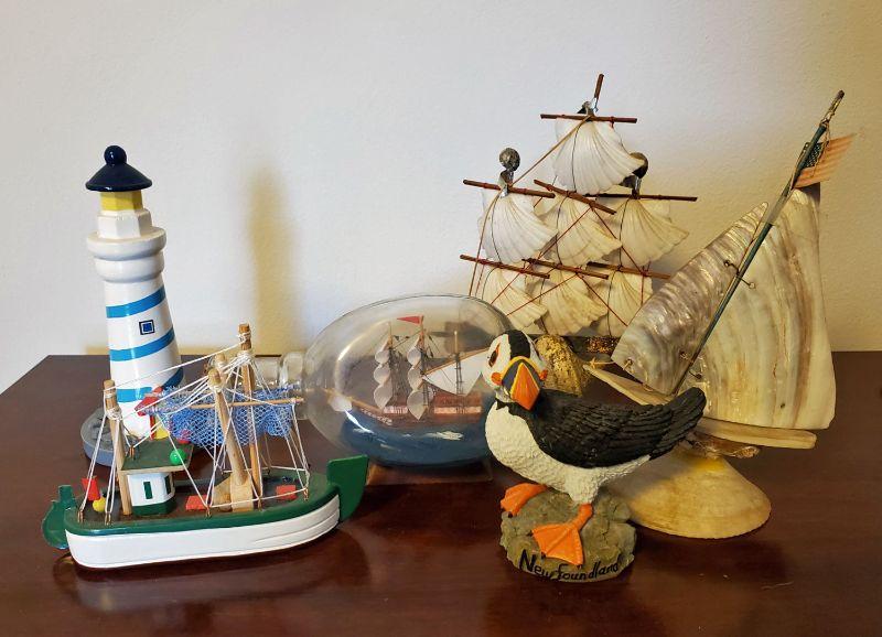 Includes 2 ships made from shell (one has a broken shell at the base) , a small ship in a bottle, a Newfoundland Puffin (resin), a small decorator boat, and a lighthouse. The lighthouse is 6" tall.