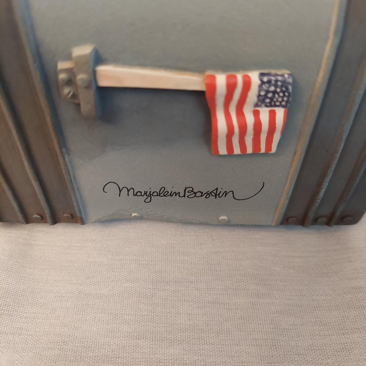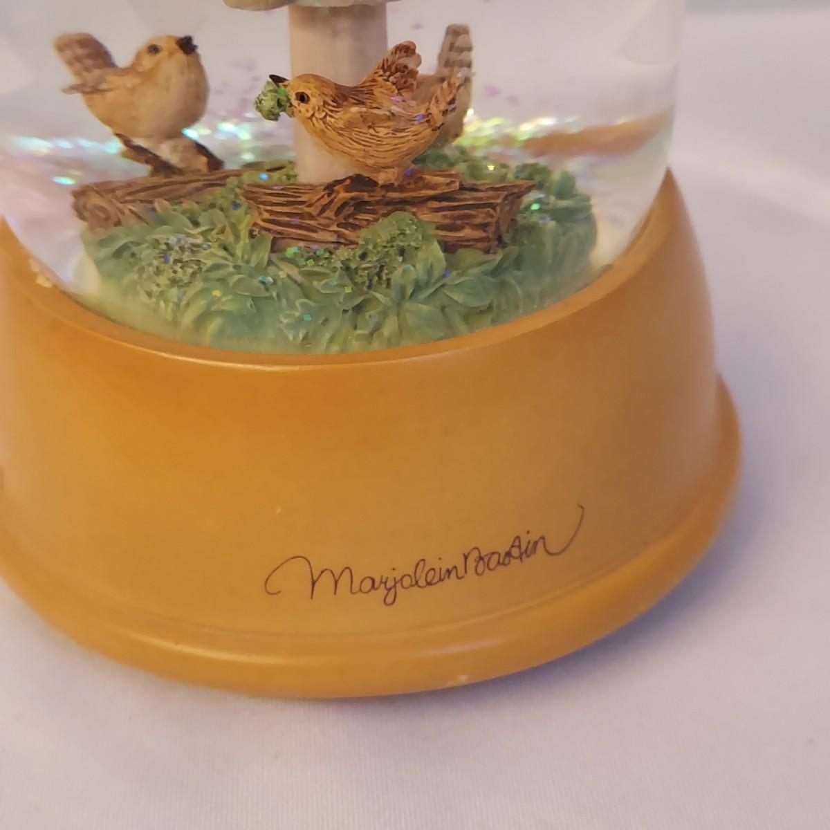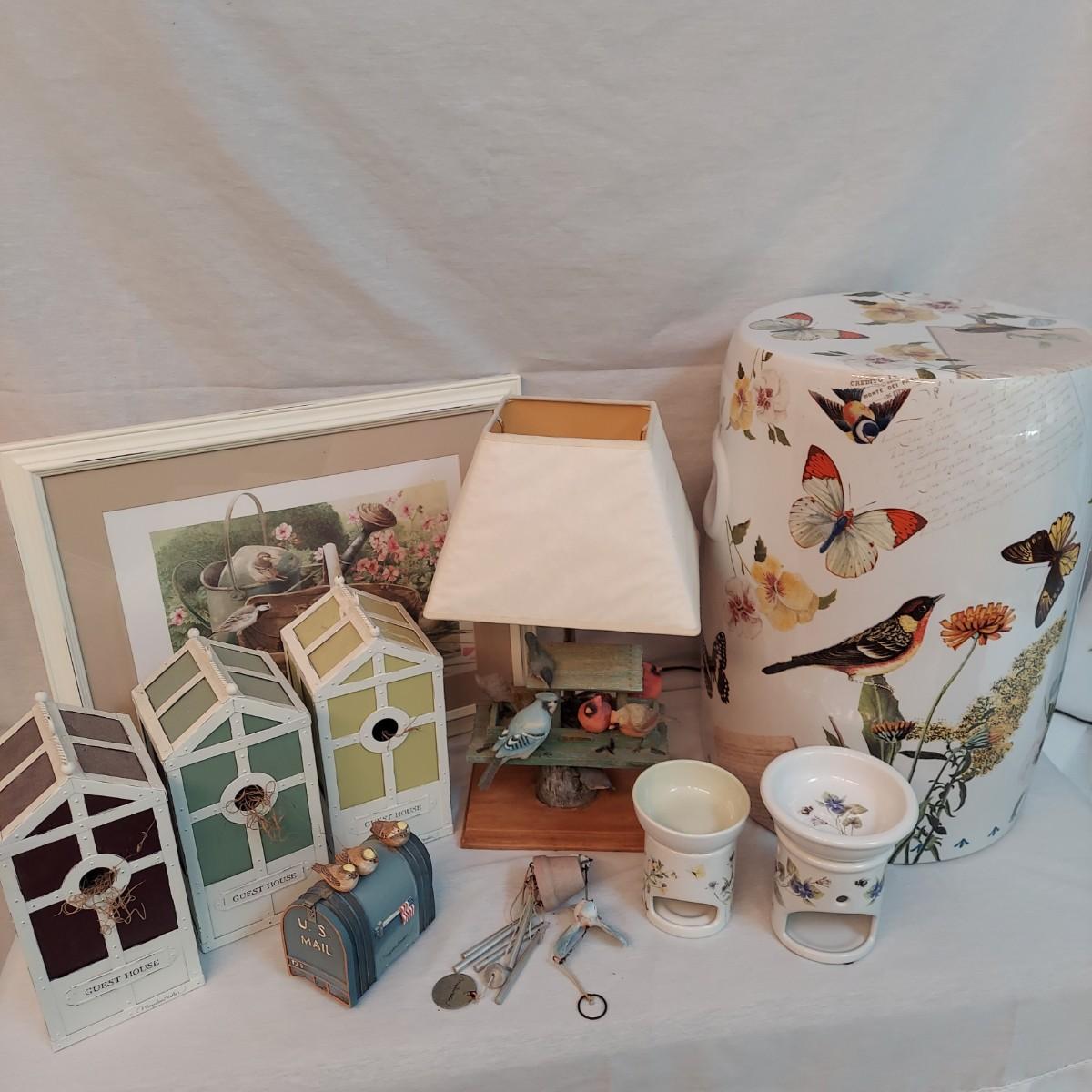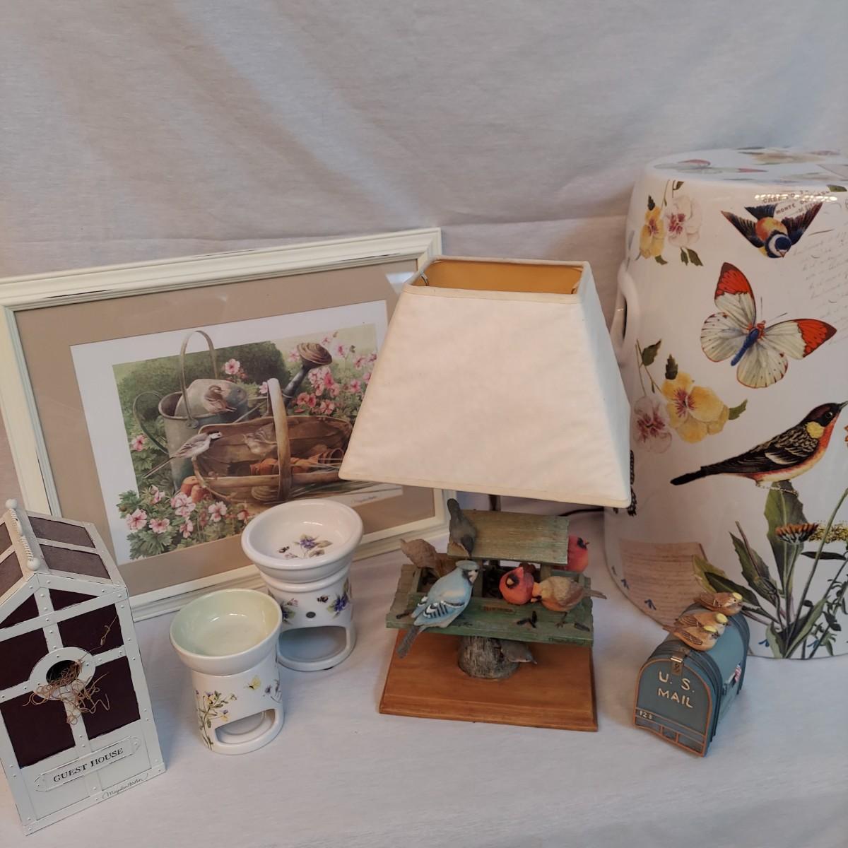 This lot is full of Marjolein Bastin pieces. There are three metal Hallmark bird houses that are 9.5" tall. There are some paint issues on a few of them please see photos. Also includes two ceramic candle holders/tart warmers, a mailbox music box and a small wind chime. The wind chime has some rust. Please see photos. There is also a lamp that is 16" tall and a framed print that is 19" x 15"H. A large stoneware stool is also in this lot. It is not a Marjolein Bastin piece. It measures 12" around and 18" high. The glitter globe is 7" tall. Local Pickup Only.