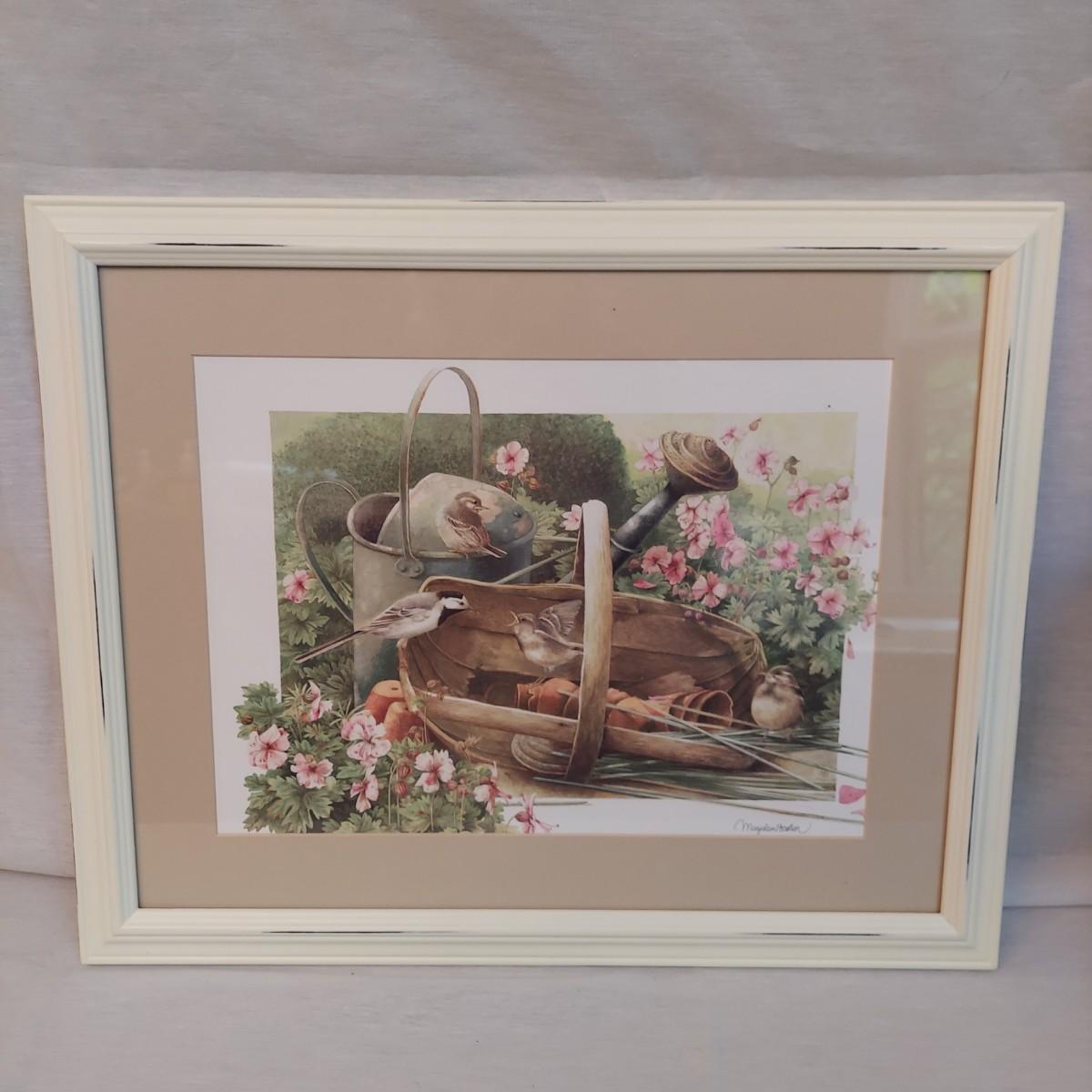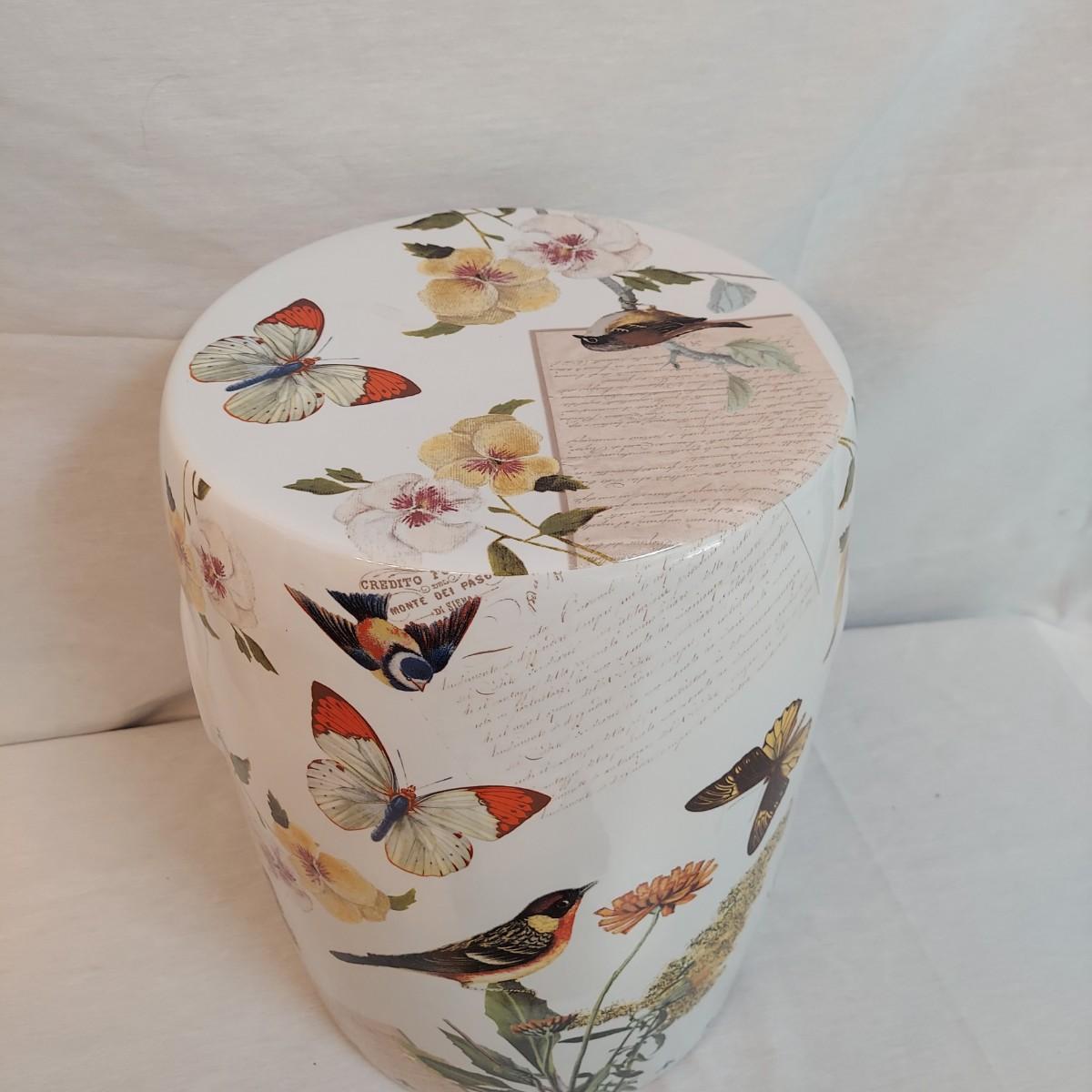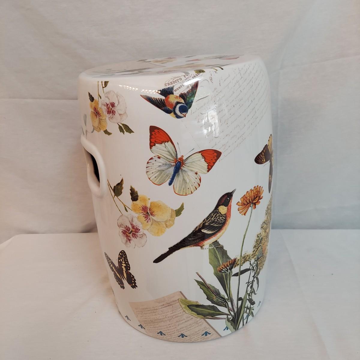 This lot is full of Marjolein Bastin pieces. There are three metal Hallmark bird houses that are 9.5" tall. There are some paint issues on a few of them please see photos. Also includes two ceramic candle holders/tart warmers, a mailbox music box and a small wind chime. The wind chime has some rust. Please see photos. There is also a lamp that is 16" tall and a framed print that is 19" x 15"H. A large stoneware stool is also in this lot. It is not a Marjolein Bastin piece. It measures 12" around and 18" high. The glitter globe is 7" tall. Local Pickup Only.