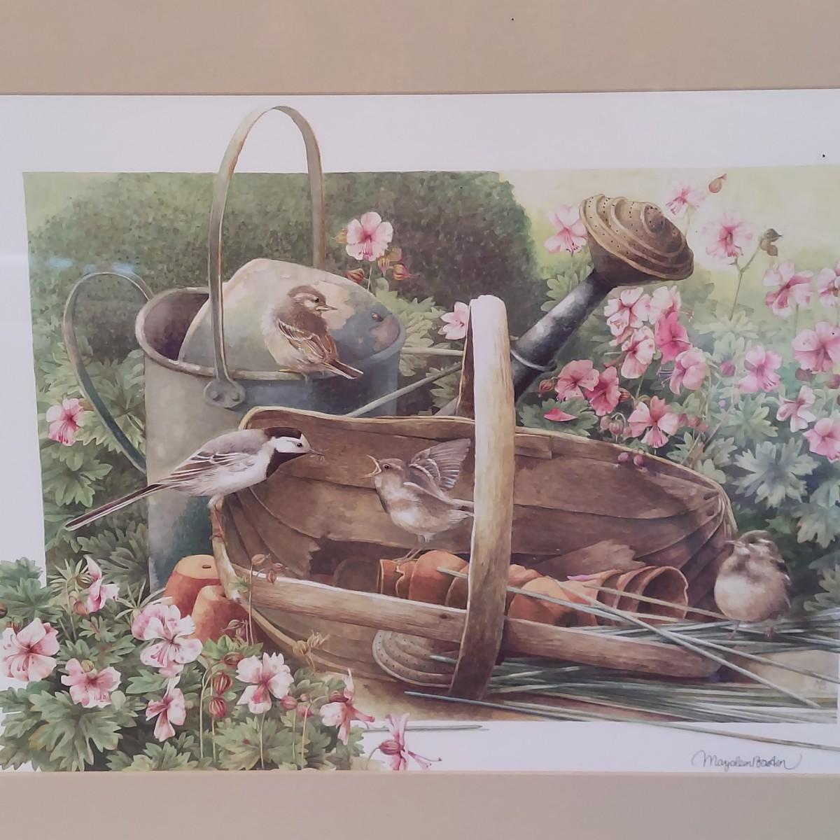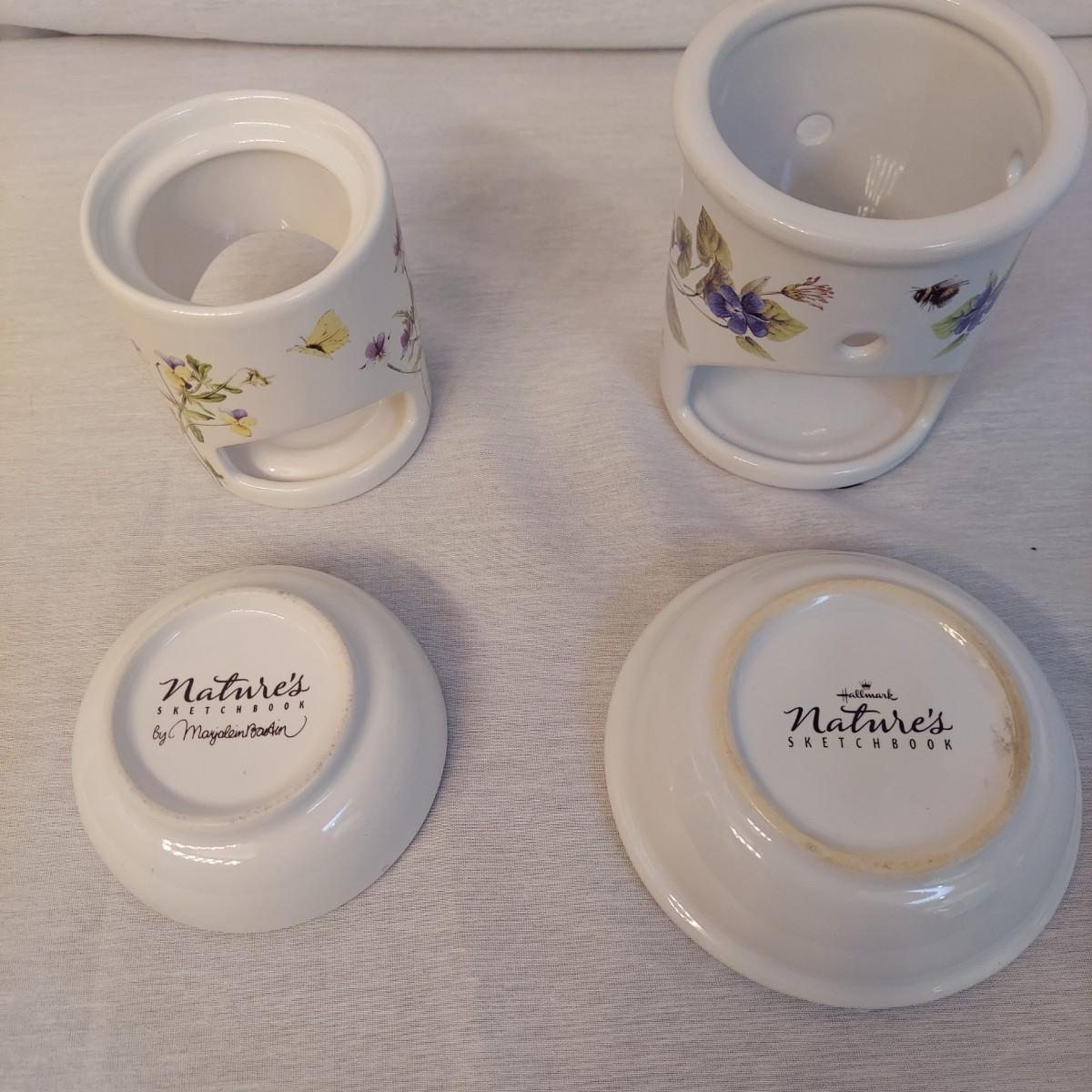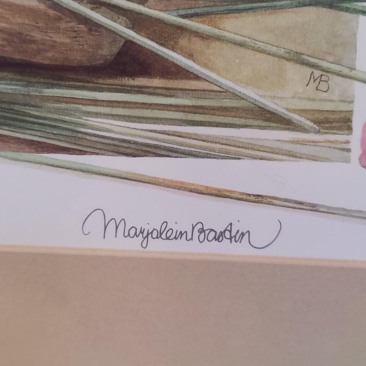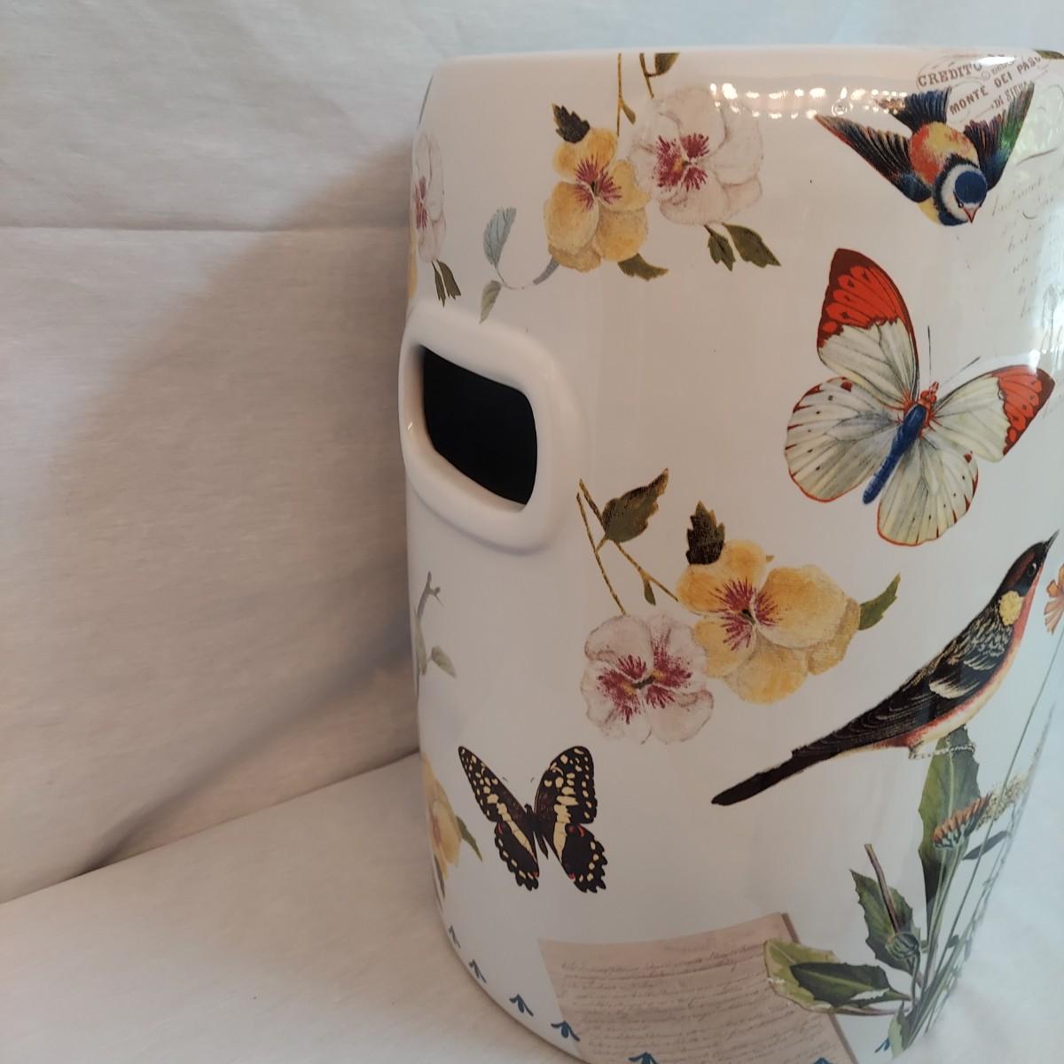 This lot is full of Marjolein Bastin pieces. There are three metal Hallmark bird houses that are 9.5" tall. There are some paint issues on a few of them please see photos. Also includes two ceramic candle holders/tart warmers, a mailbox music box and a small wind chime. The wind chime has some rust. Please see photos. There is also a lamp that is 16" tall and a framed print that is 19" x 15"H. A large stoneware stool is also in this lot. It is not a Marjolein Bastin piece. It measures 12" around and 18" high. The glitter globe is 7" tall. Local Pickup Only.