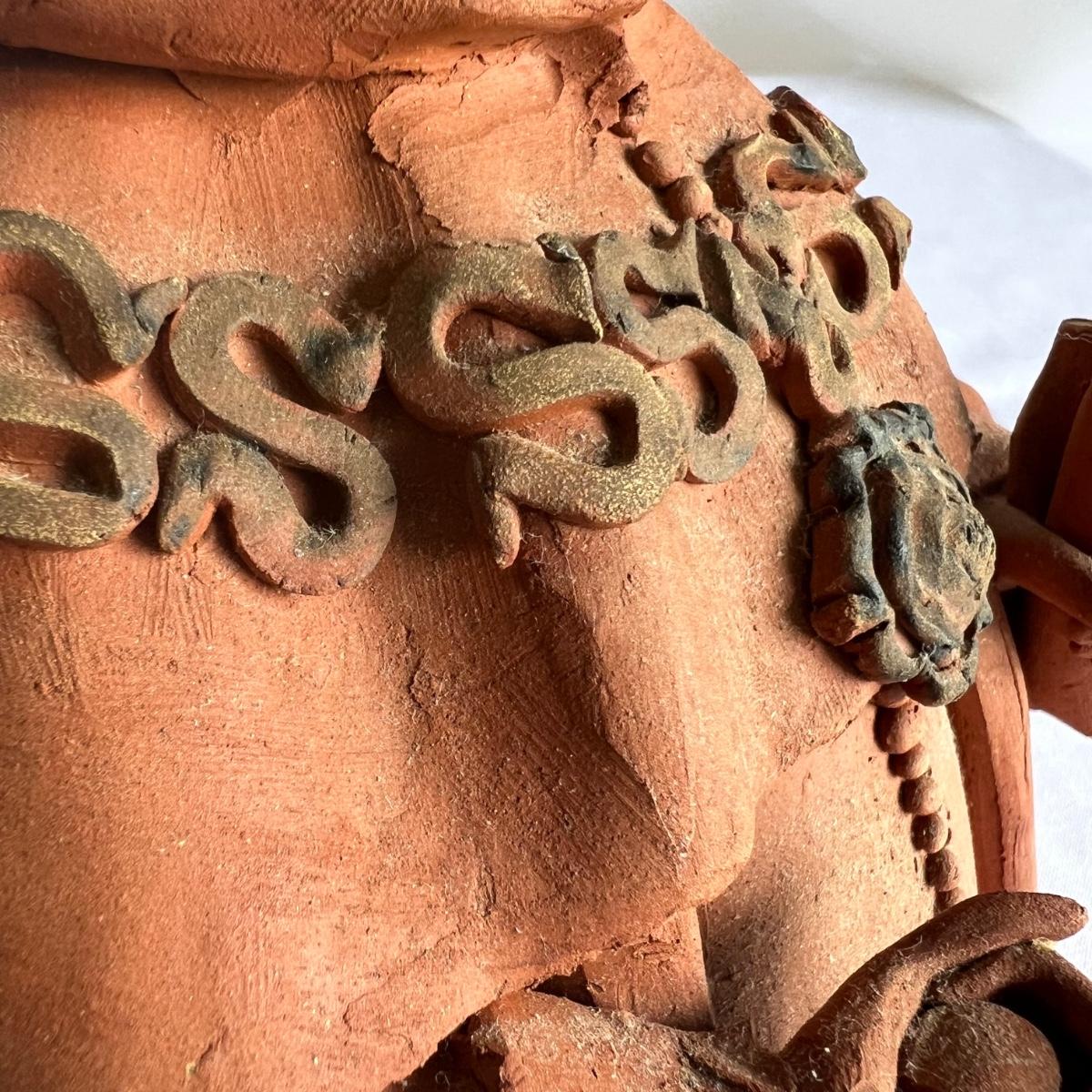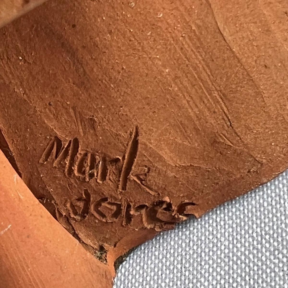 This characterful sculpture is signed by the potter - Mark Jones. Unglazed and made from a solid piece of clay (not hollow), it measures 5” x 5” x 9”.