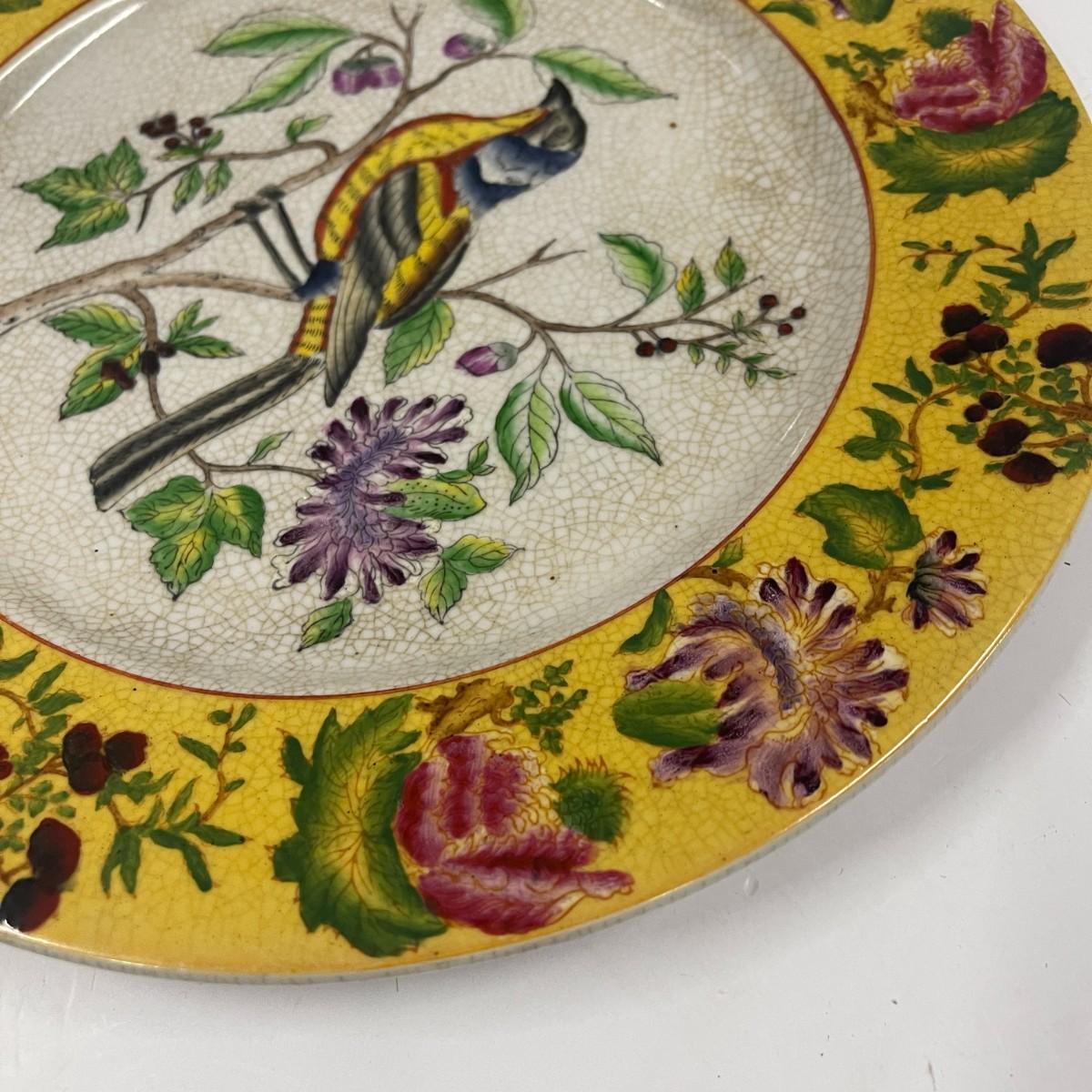 Mark Roberts hand painted decorative plate with yellow border, flowers and birds. 10 1/2" diameter.