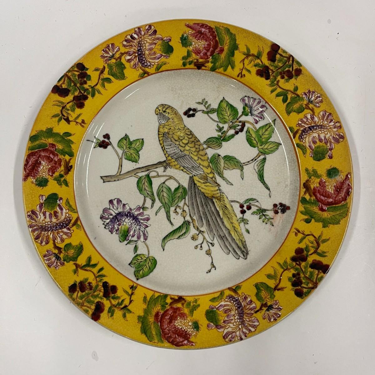 Mark Roberts hand painted decorative plate with yellow border, flowers and birds. 10 1/2" diameter.