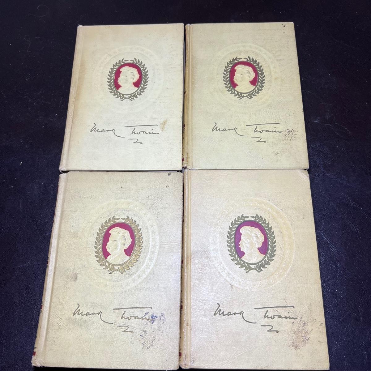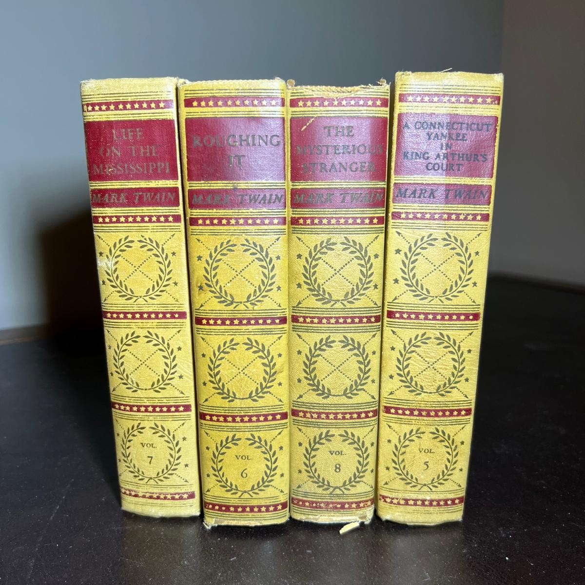 Four Mark Twain books includes ‘Roughing it’, The ‘Mysterious Stranger’ and more, see images; the latter has some loose binding and all four books have some typical age related wear. Lot also includes three Library Edition classics, see images for more information and note one has been written in.