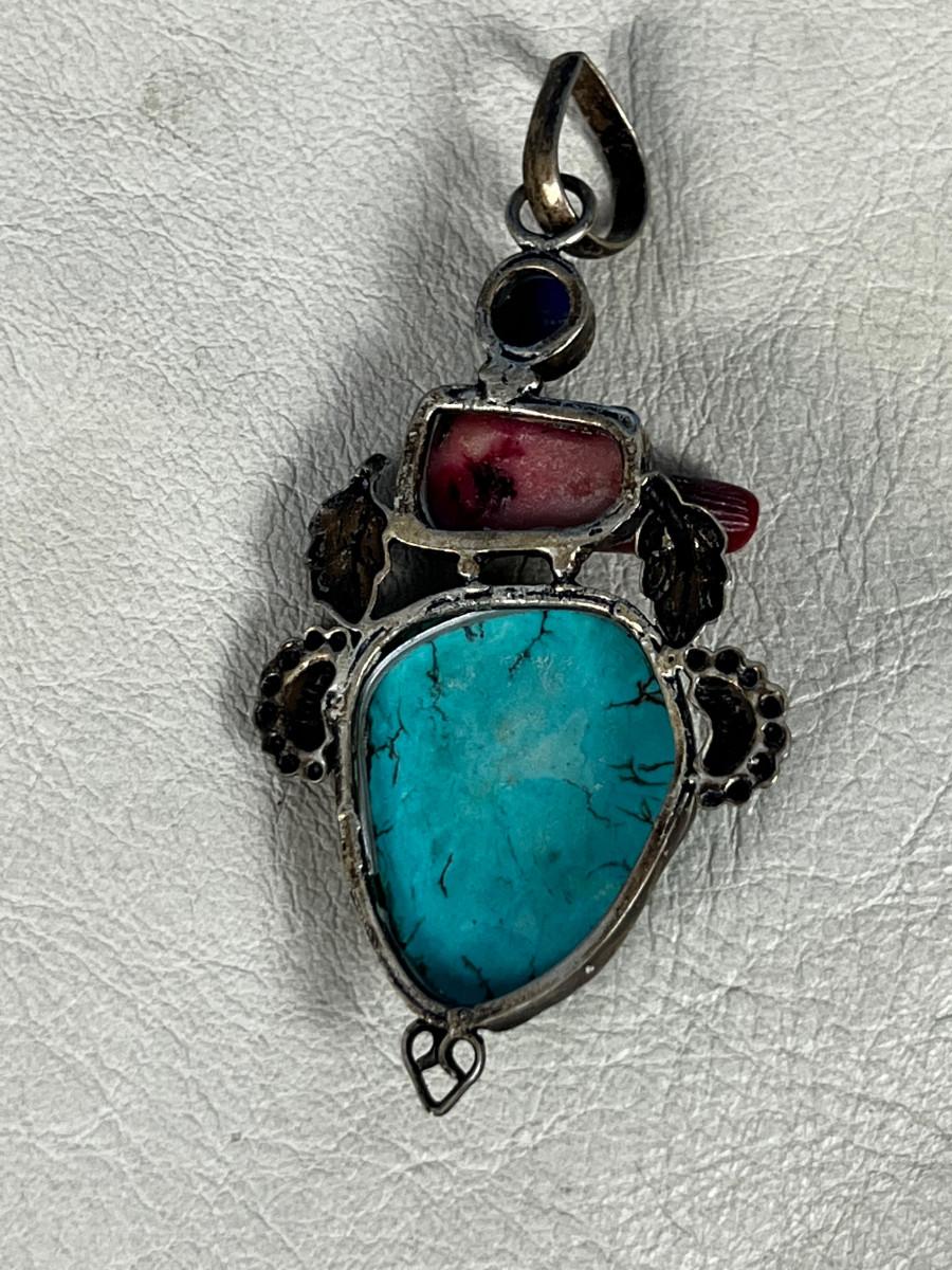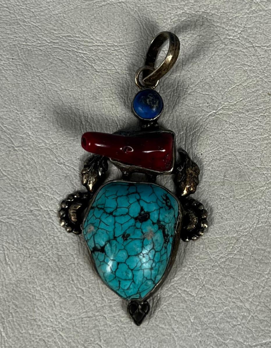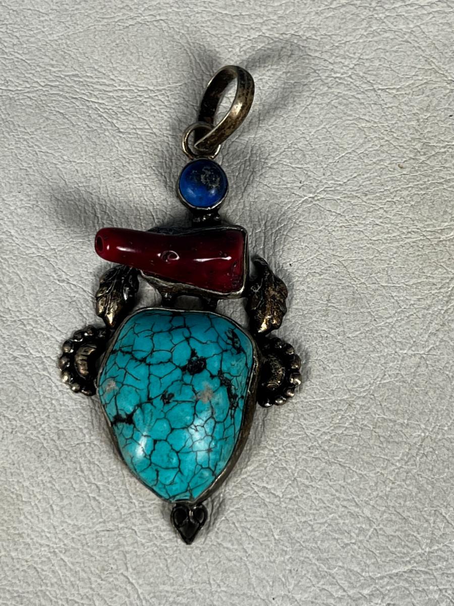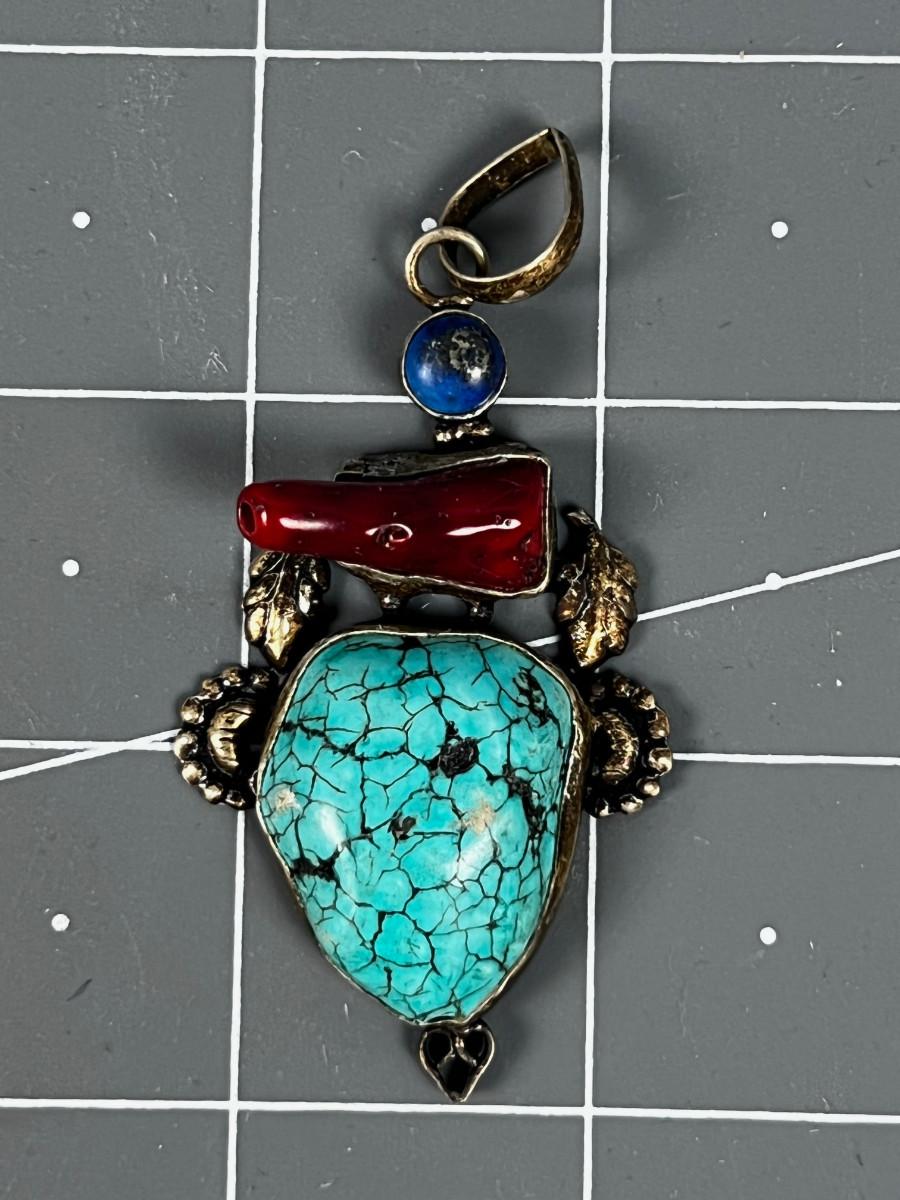 Marked 925 Pendant Coral, Lapis And Turquoise