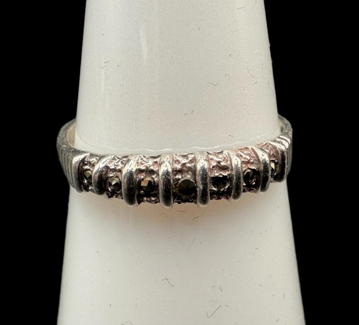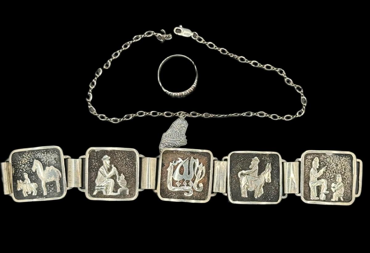 **WIRE TRANSFER IS REQUIRED IF SHIPPED.** [34.72g] Includes a sterling marcasite ring, a sterling ankle bracelet with a State of Maine charm, and a South American panel bracelet in .900 silver. Total of three pieces. Measurement of longest: 10”. Age related wear. Weight given includes all pieces. Silver content confirmed using Niton XRF precious metals analyzer. **ALL PRECIOUS METALS SALES ARE FINAL. NO REFUNDS WILL BE GIVEN FOR ANY REASON.** [RM]